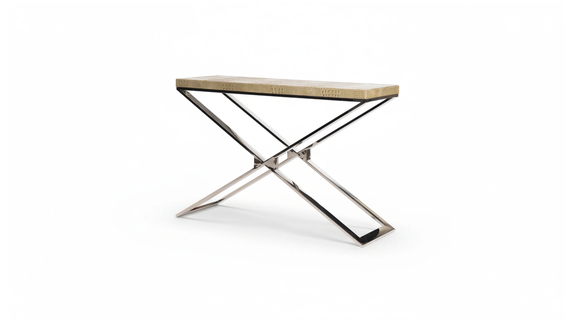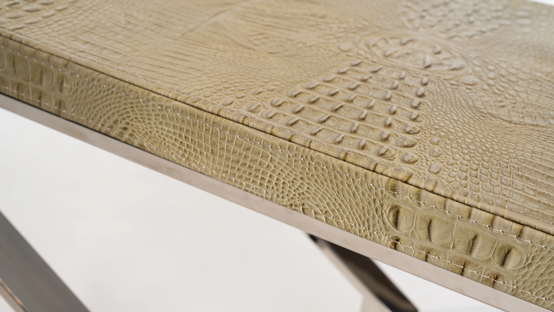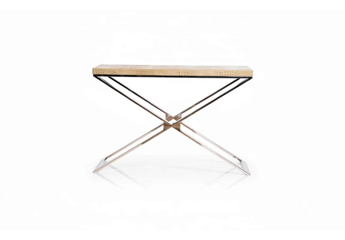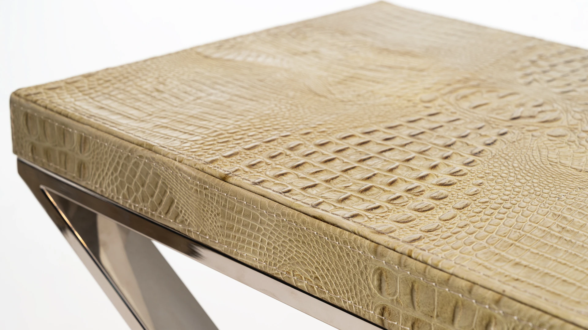 Dressoire Trish. Tapa realizada en madera laqueada y tapizada en ecocuero crocco, mientras que la base esta realizada en acero pulido. Consultar stock disponible. Precio final con descuento, incluye IVA y género. Para customizaciones que requieran un nuevo proceso de fabricación, se realizará una cotización especial.