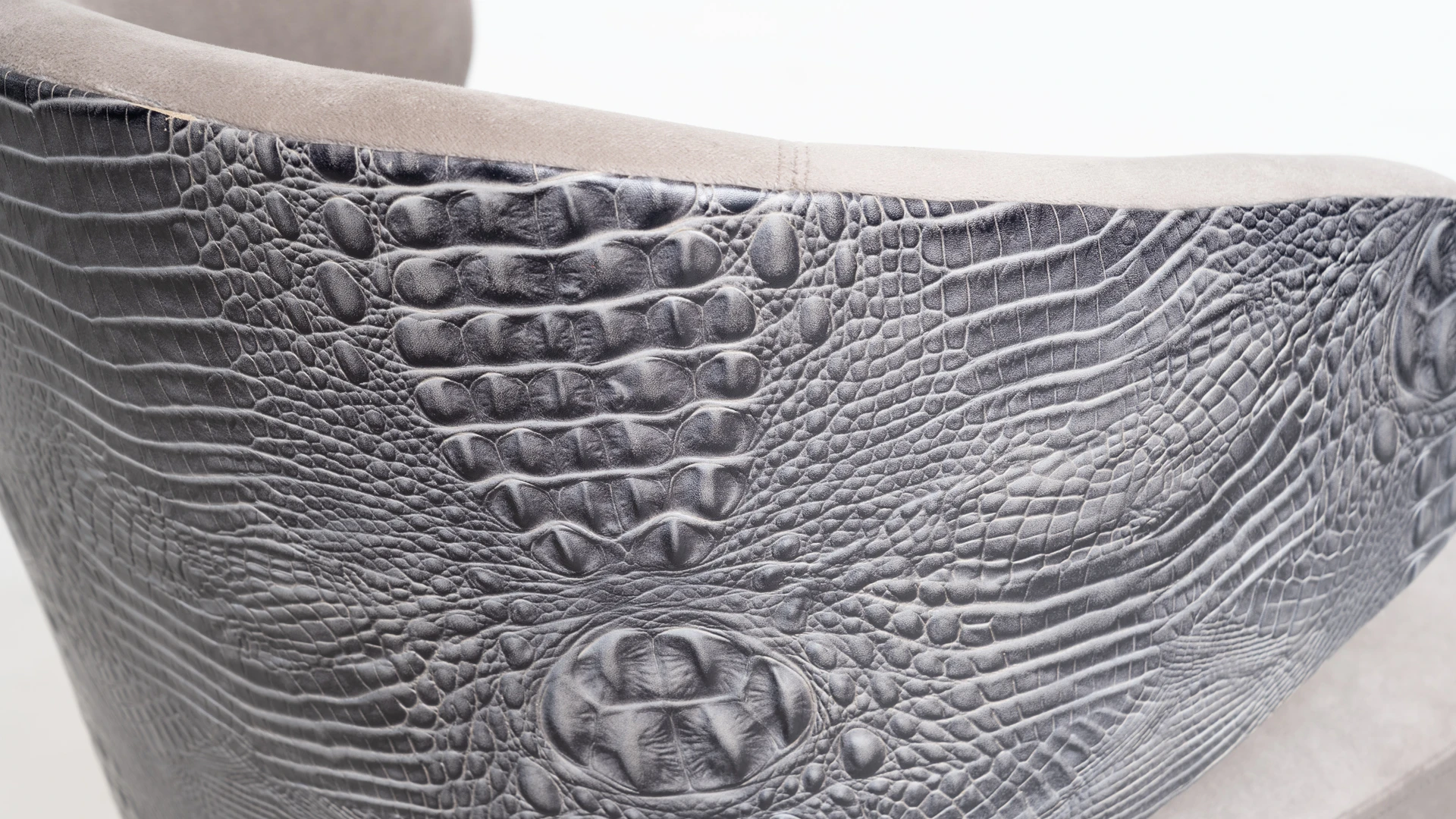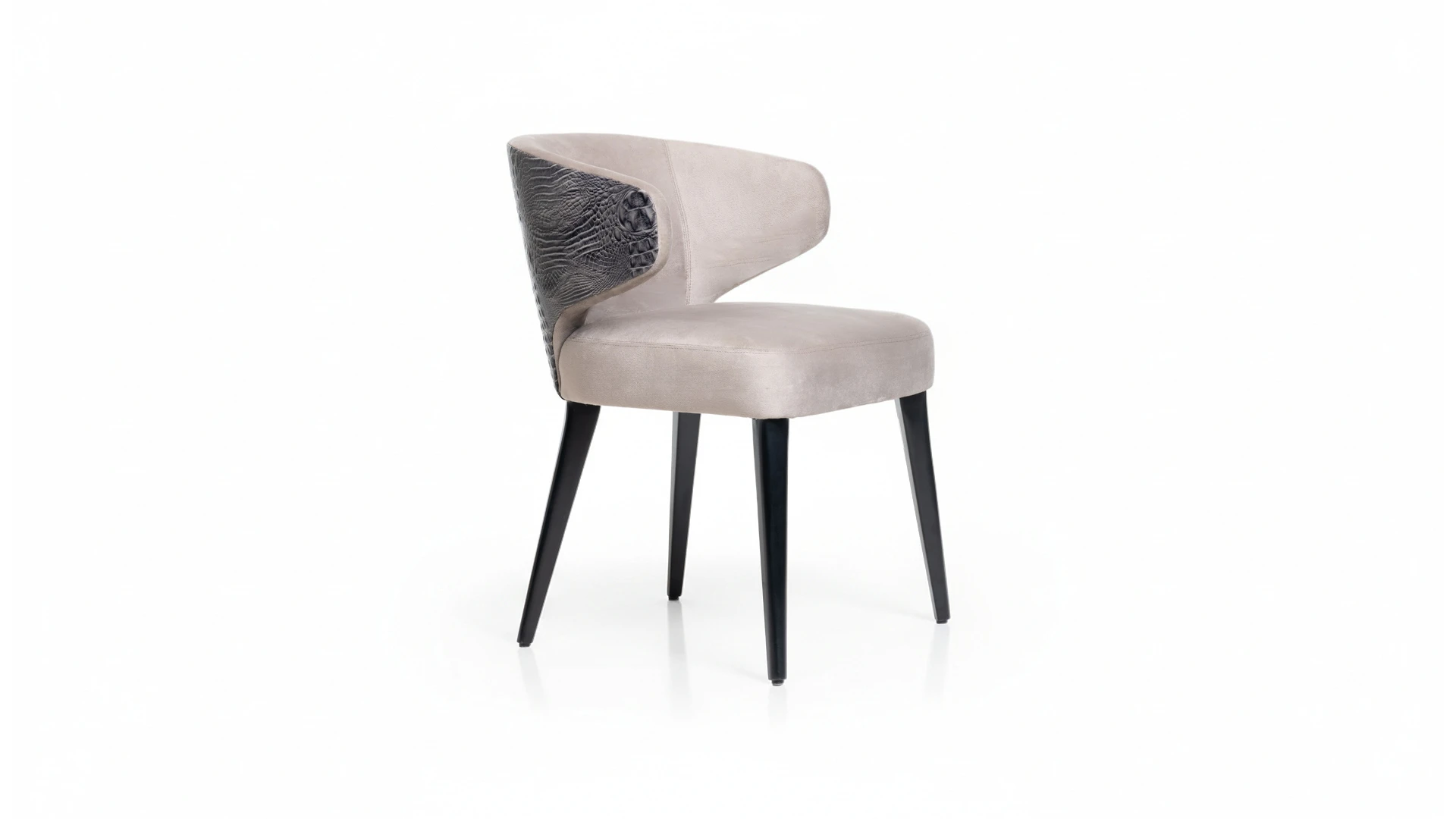 Silla Alaska. Con un diseño moderno que combina sutilmente lineas rectas y curvas. Fabricada con madera de guindo laqueado en color negro semimate, frente tapizado en pana porsche color nickel y la espalda tapizada en cuero croco color gris. Producto de edición limitada. Consultar stock disponible. Precio final con descuento, incluye IVA y género. Para customizaciones que requieran un nuevo proceso de fabricación, se realizará una cotización especial