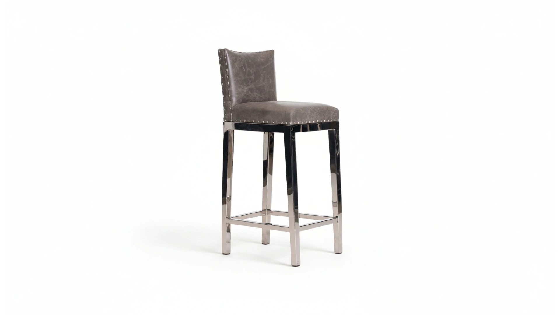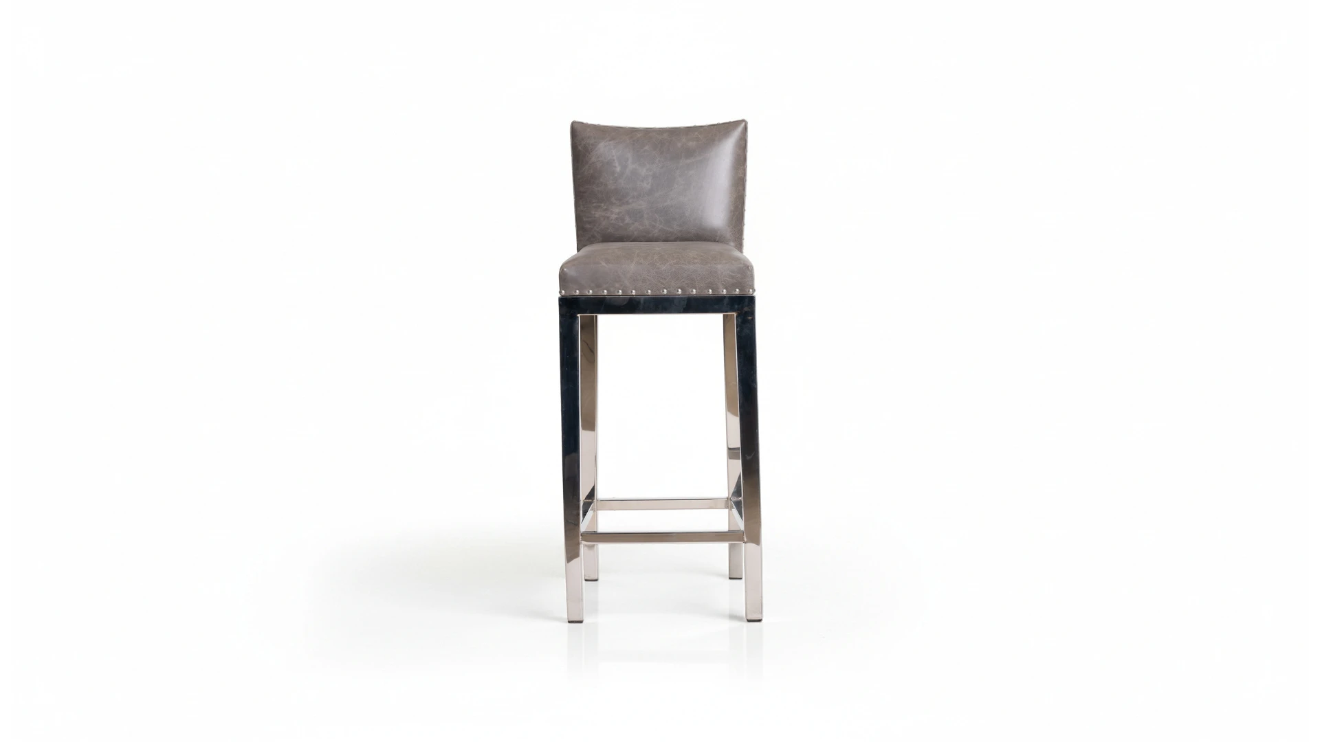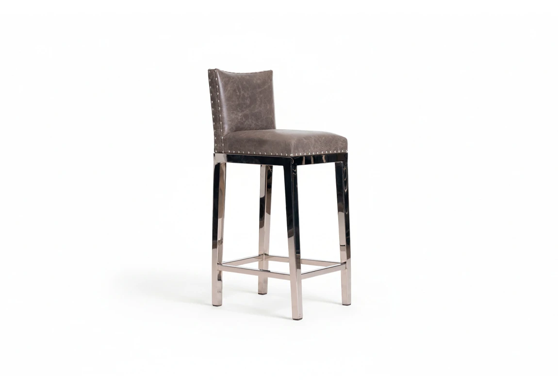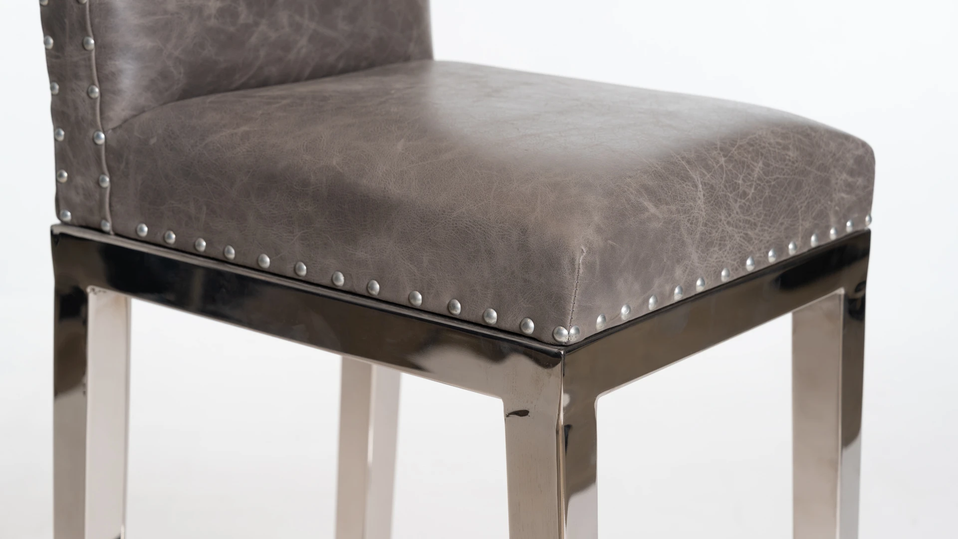 Taburete Jolie. Con una estructura fabricada en acero inoxidable pulido espejo. Tapizado con cuero Riviera color gris y terminado con tachas platil espaciadas. Producto de edición limitada. Consultar stock disponible. Precio final con descuento, incluye IVA y género. Para customizaciones que requieran un nuevo proceso de fabricación, se realizará una cotización especial