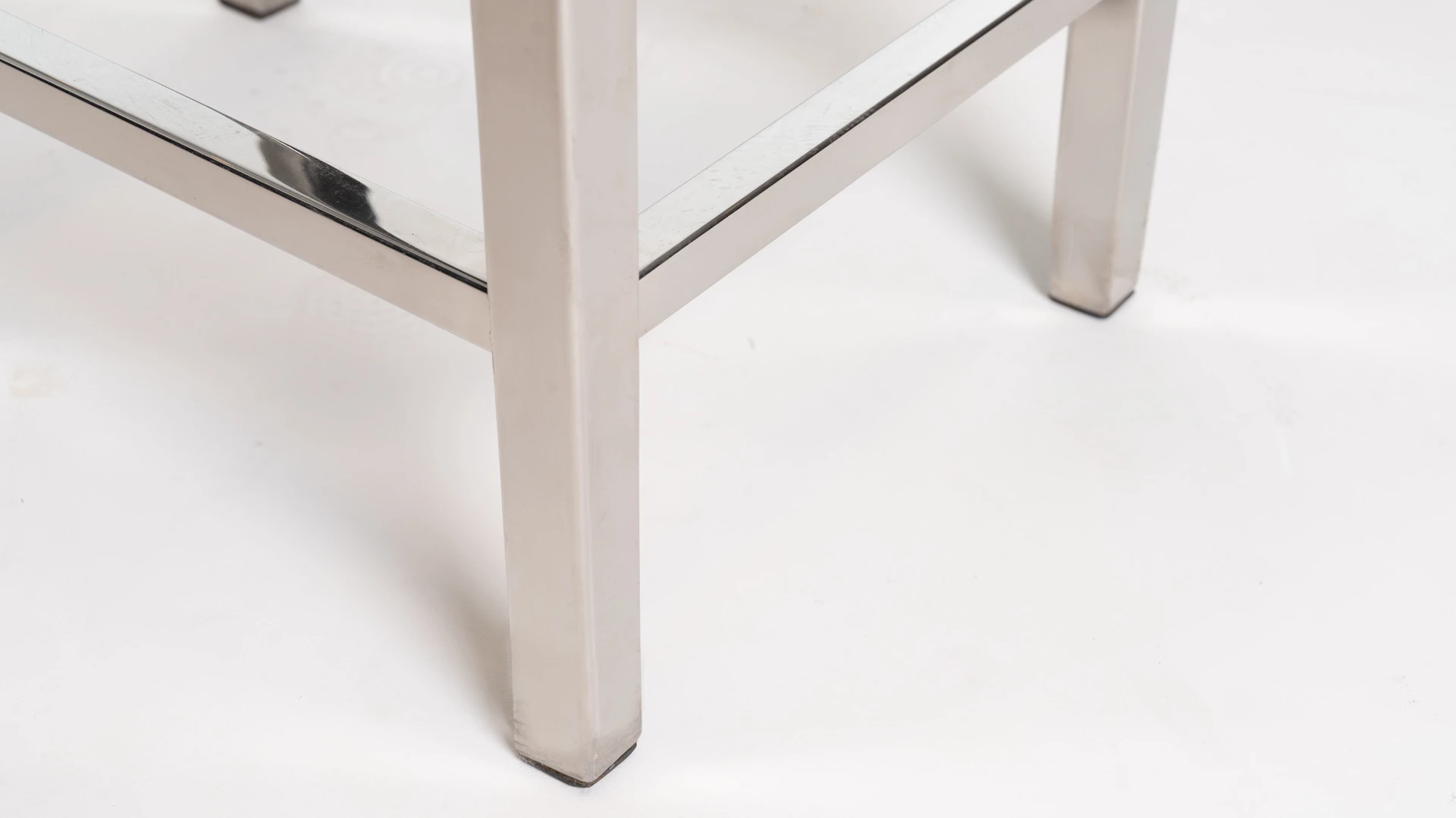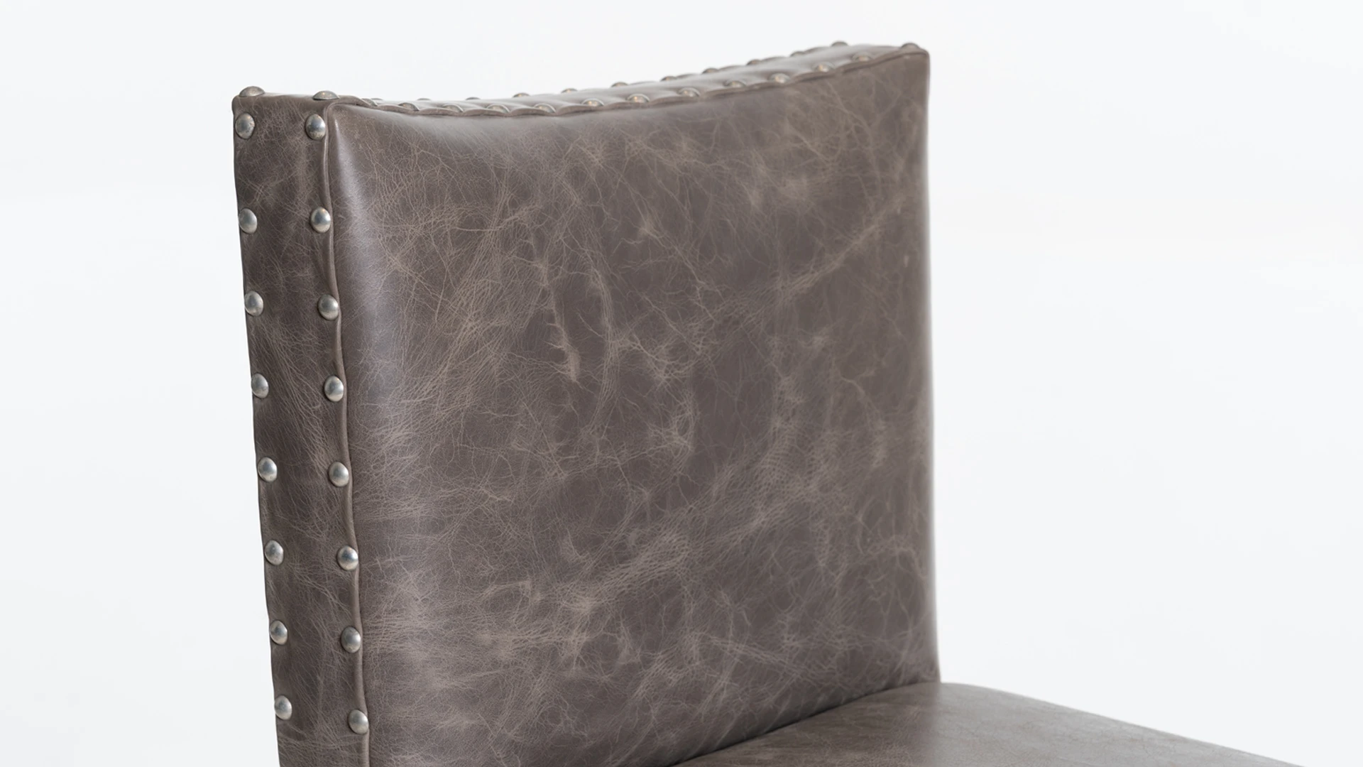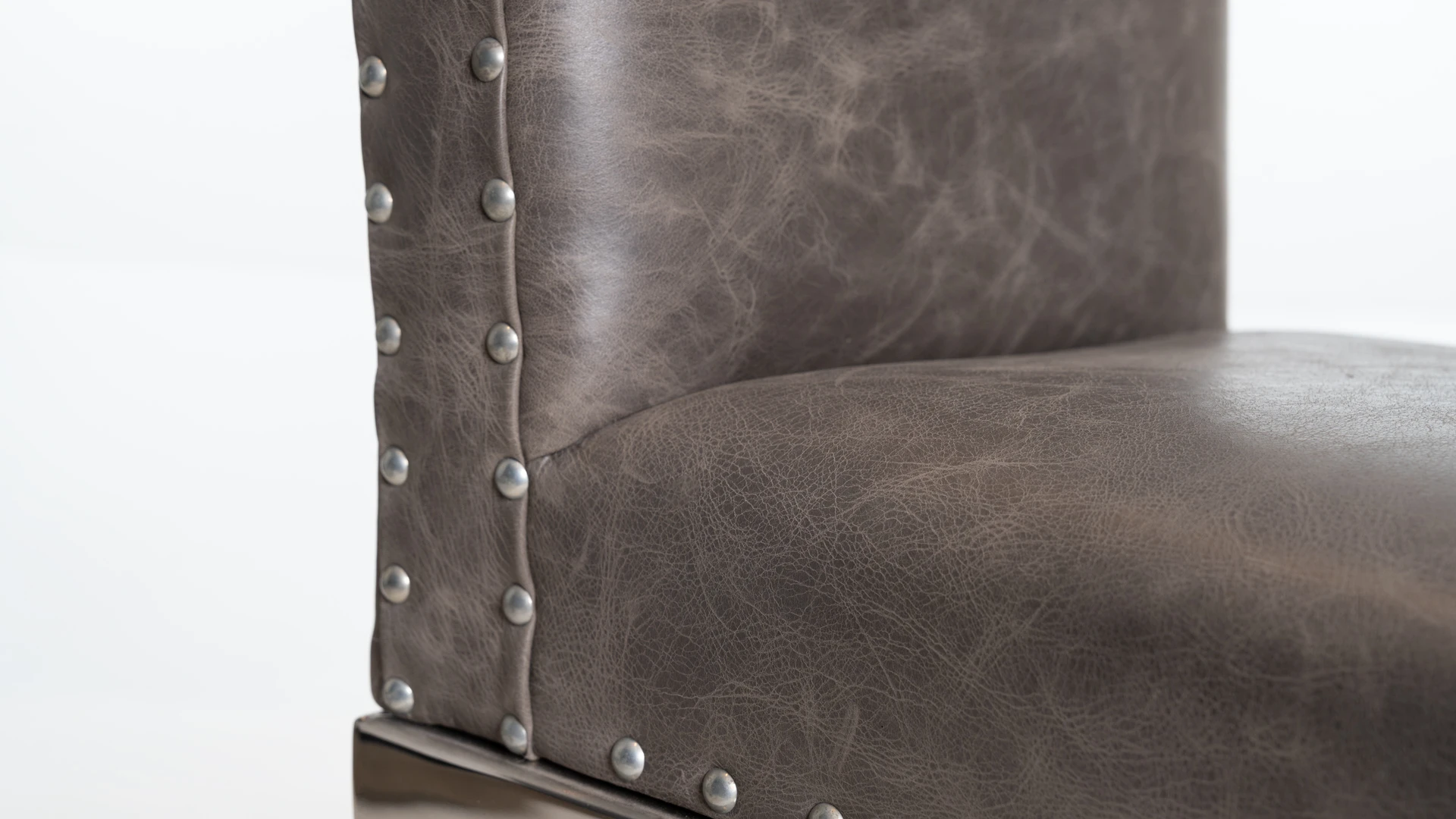 Taburete Jolie. Con una estructura fabricada en acero inoxidable pulido espejo. Tapizado con cuero Riviera color gris y terminado con tachas platil espaciadas. Producto de edición limitada. Consultar stock disponible. Precio final con descuento, incluye IVA y género. Para customizaciones que requieran un nuevo proceso de fabricación, se realizará una cotización especial