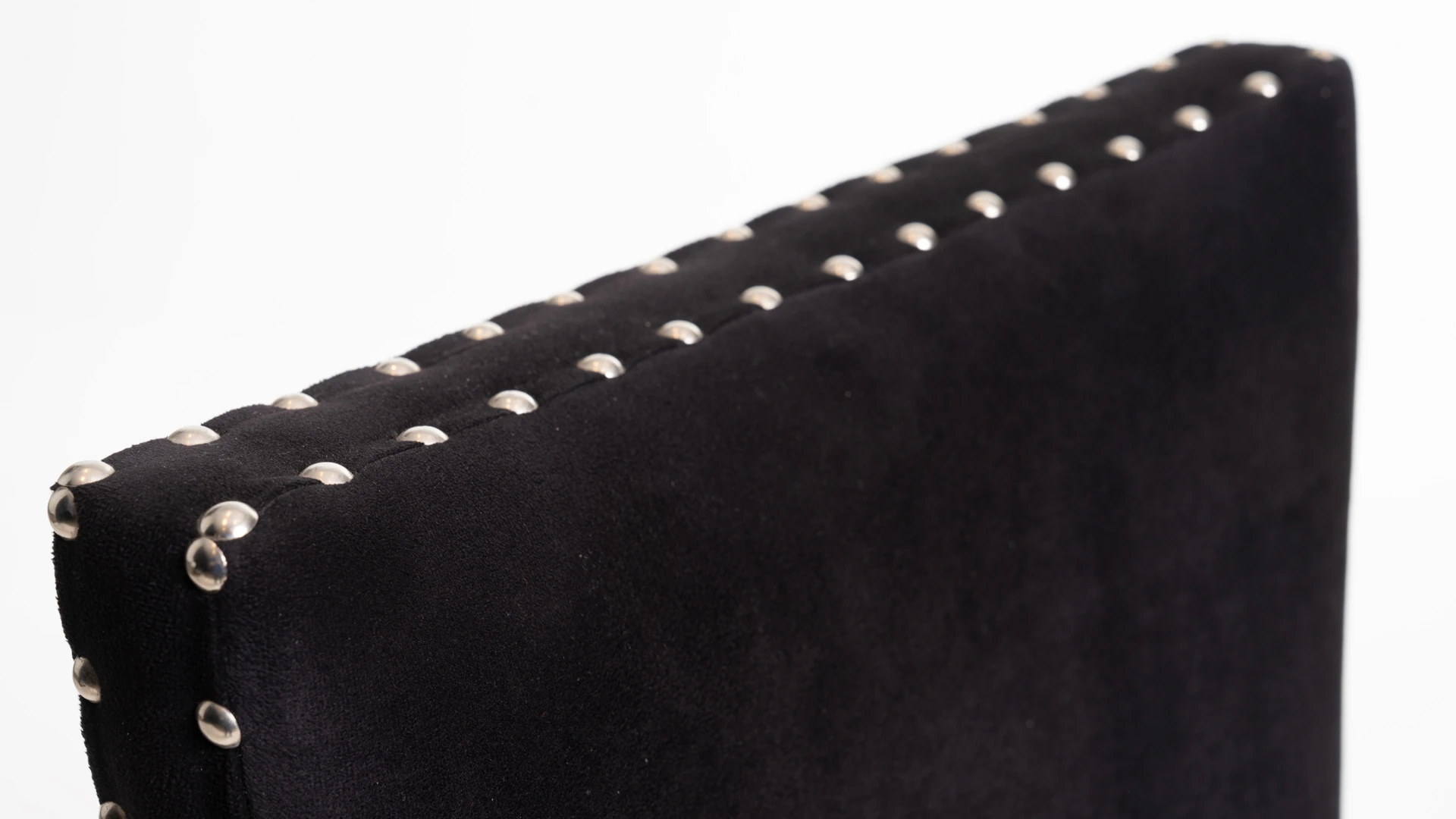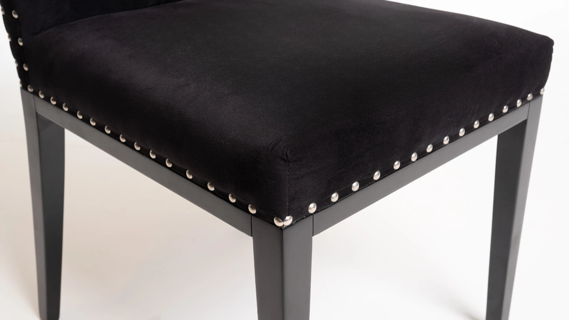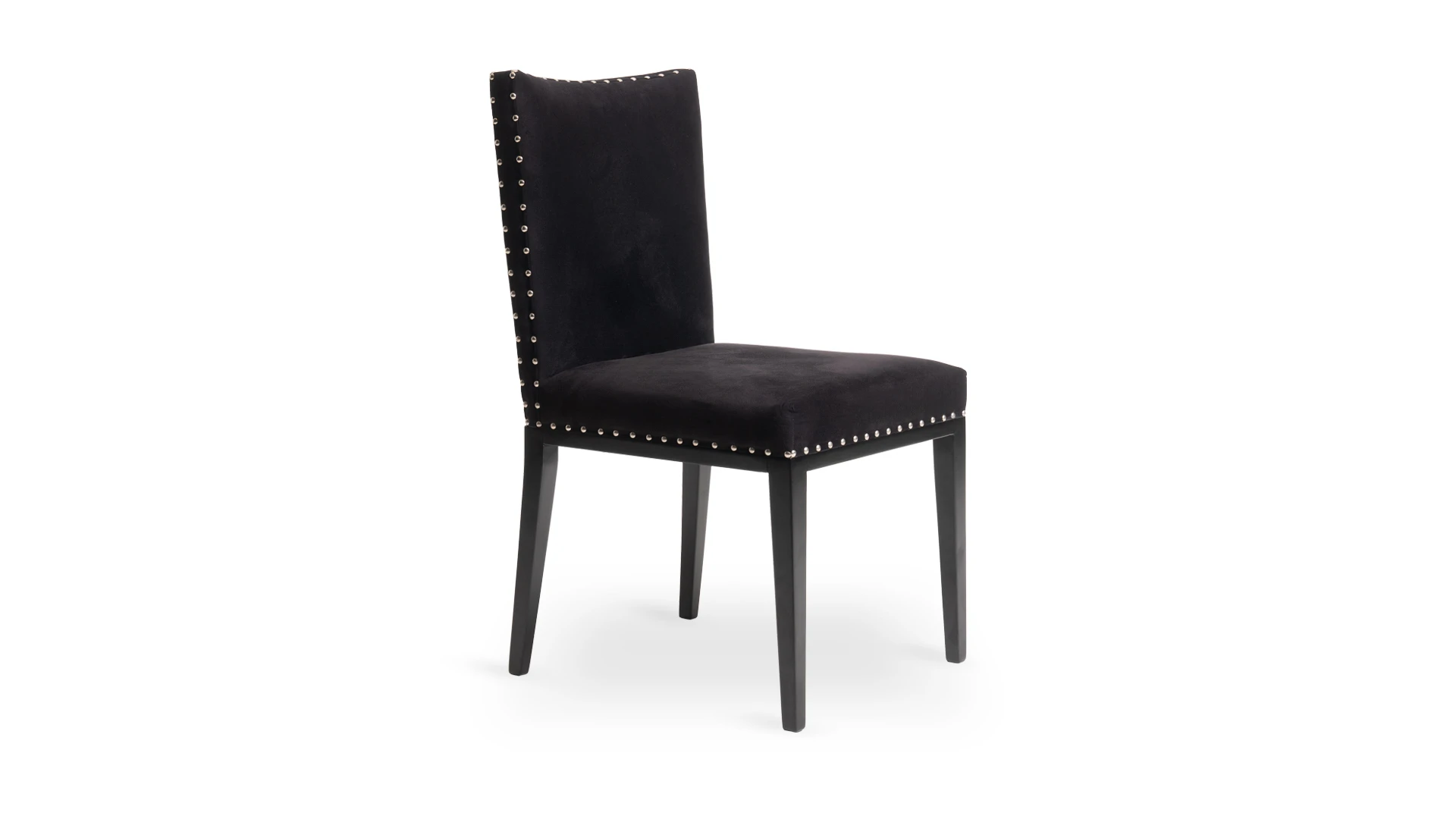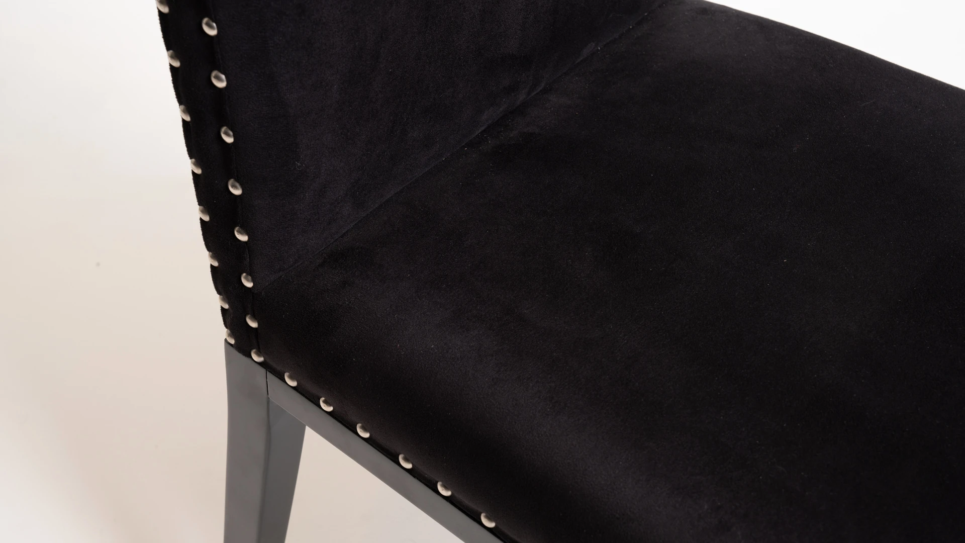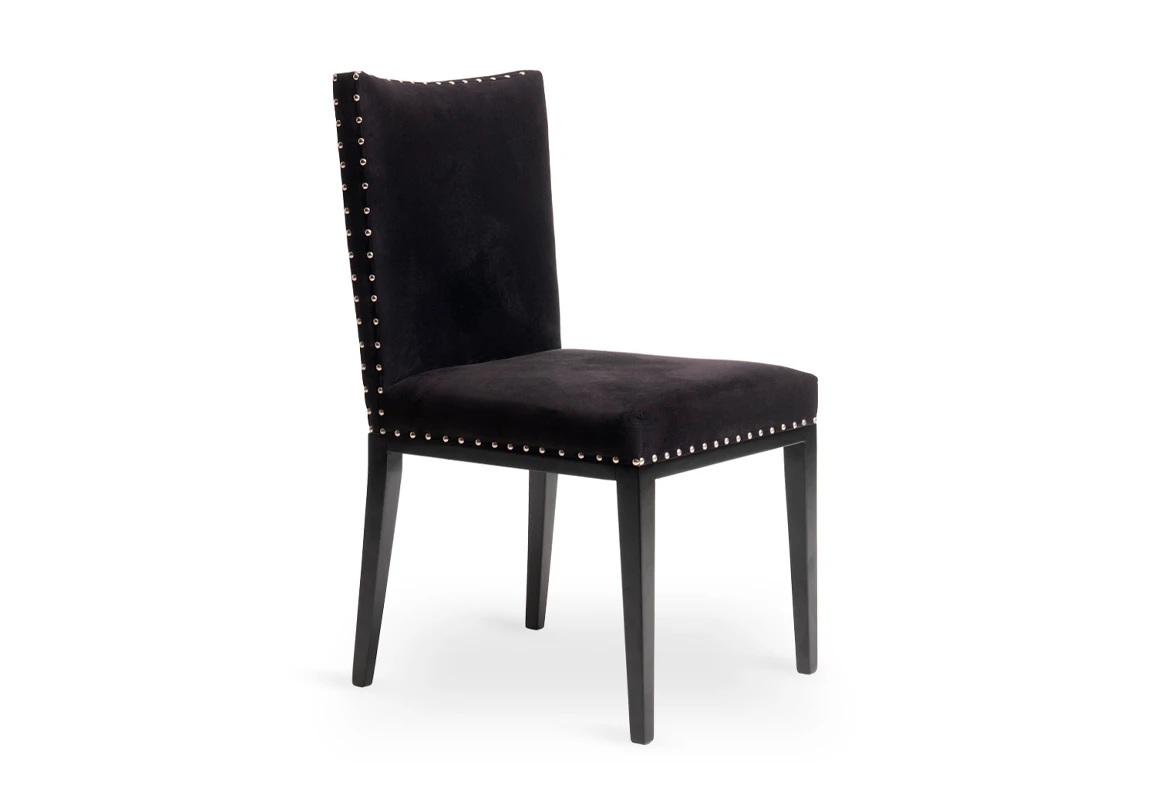 Silla de diseño elegante y proporciones estilizadas. Estructura fabricada en madera de guindo, con lustre poliuretánico color negro semi mate. Tapizada en pana Porsche sintética color negro, con detalle de tachas platil que realzan su terminación.