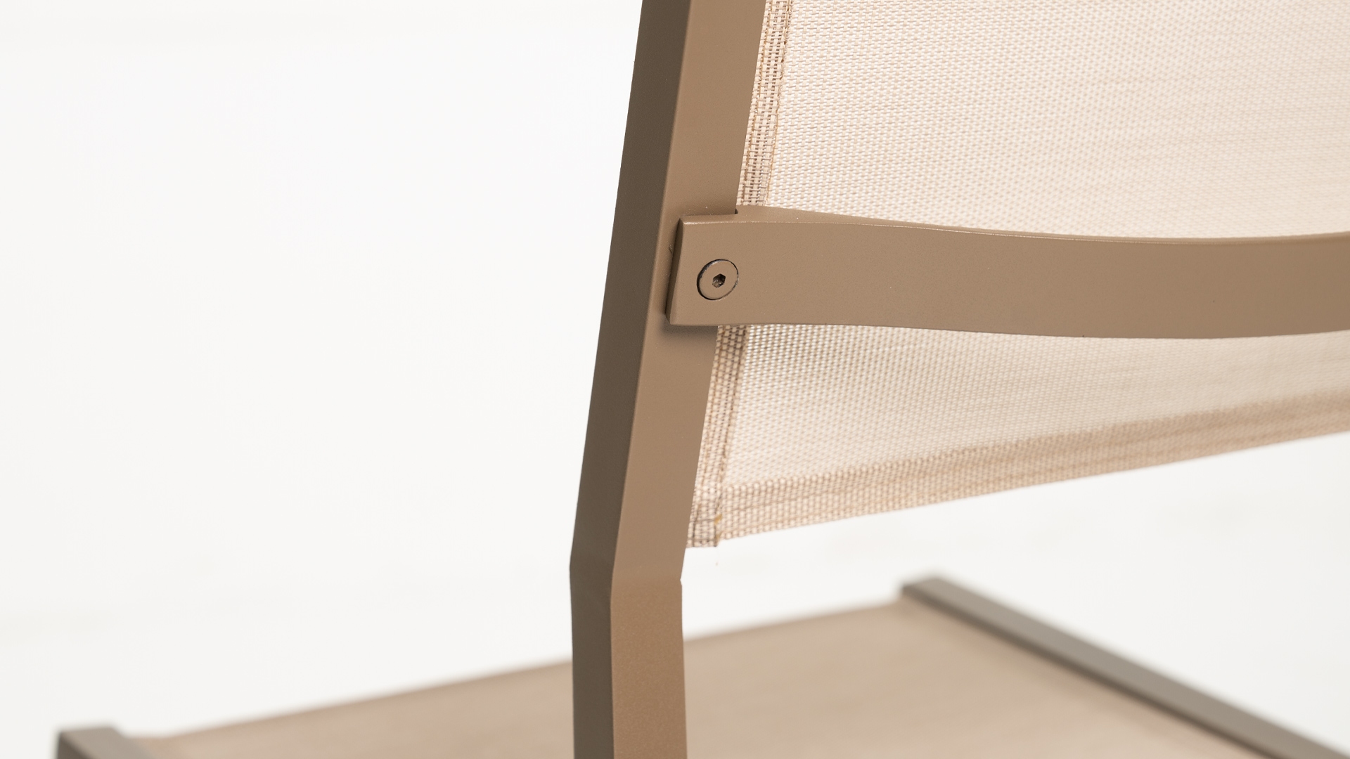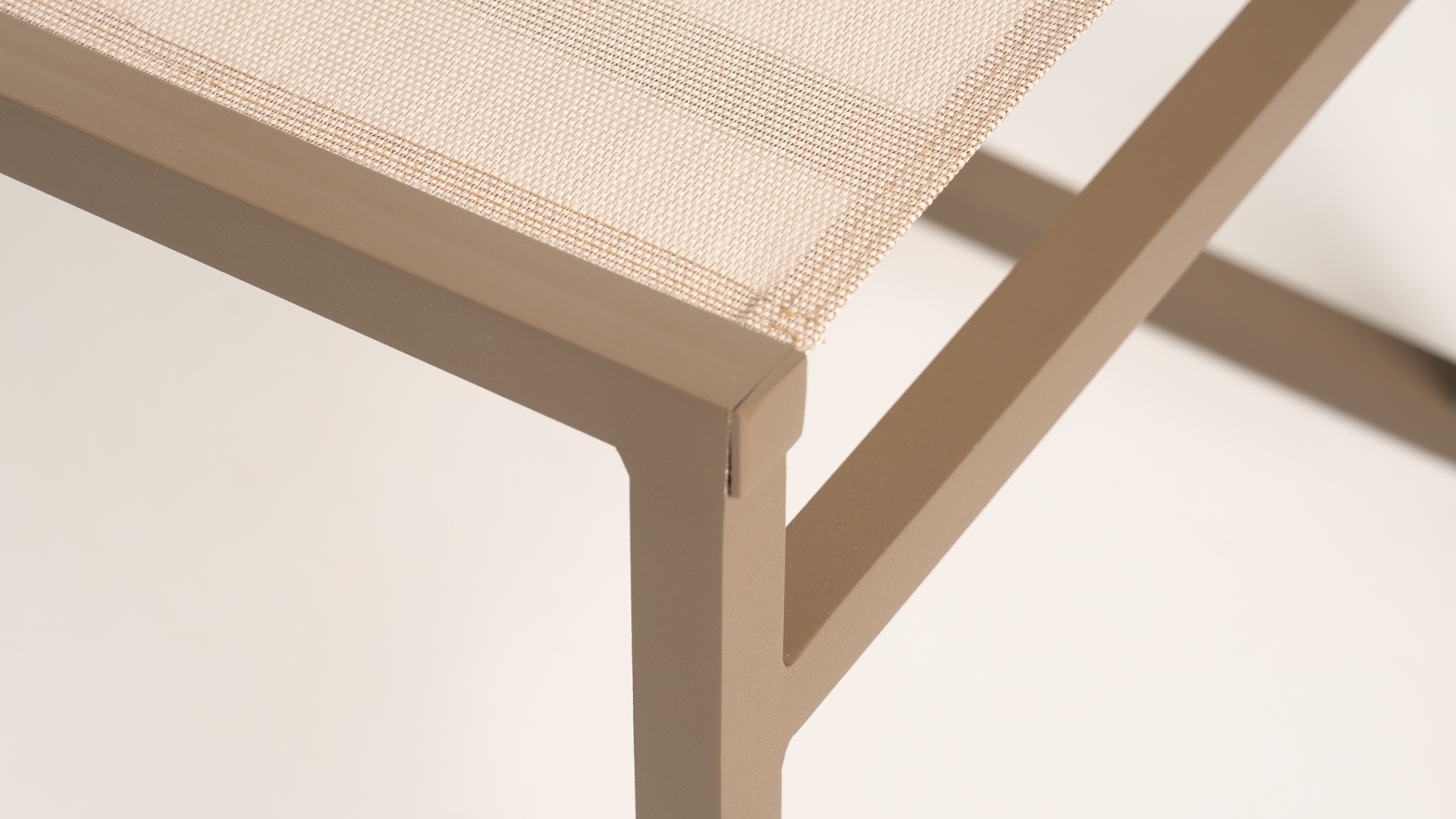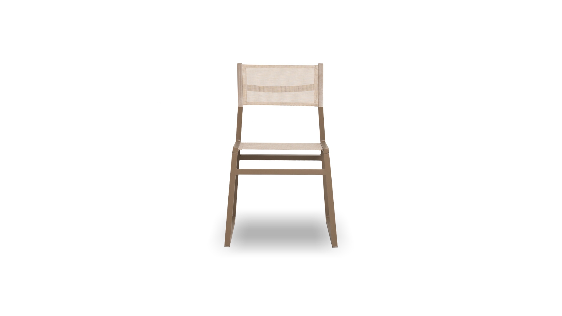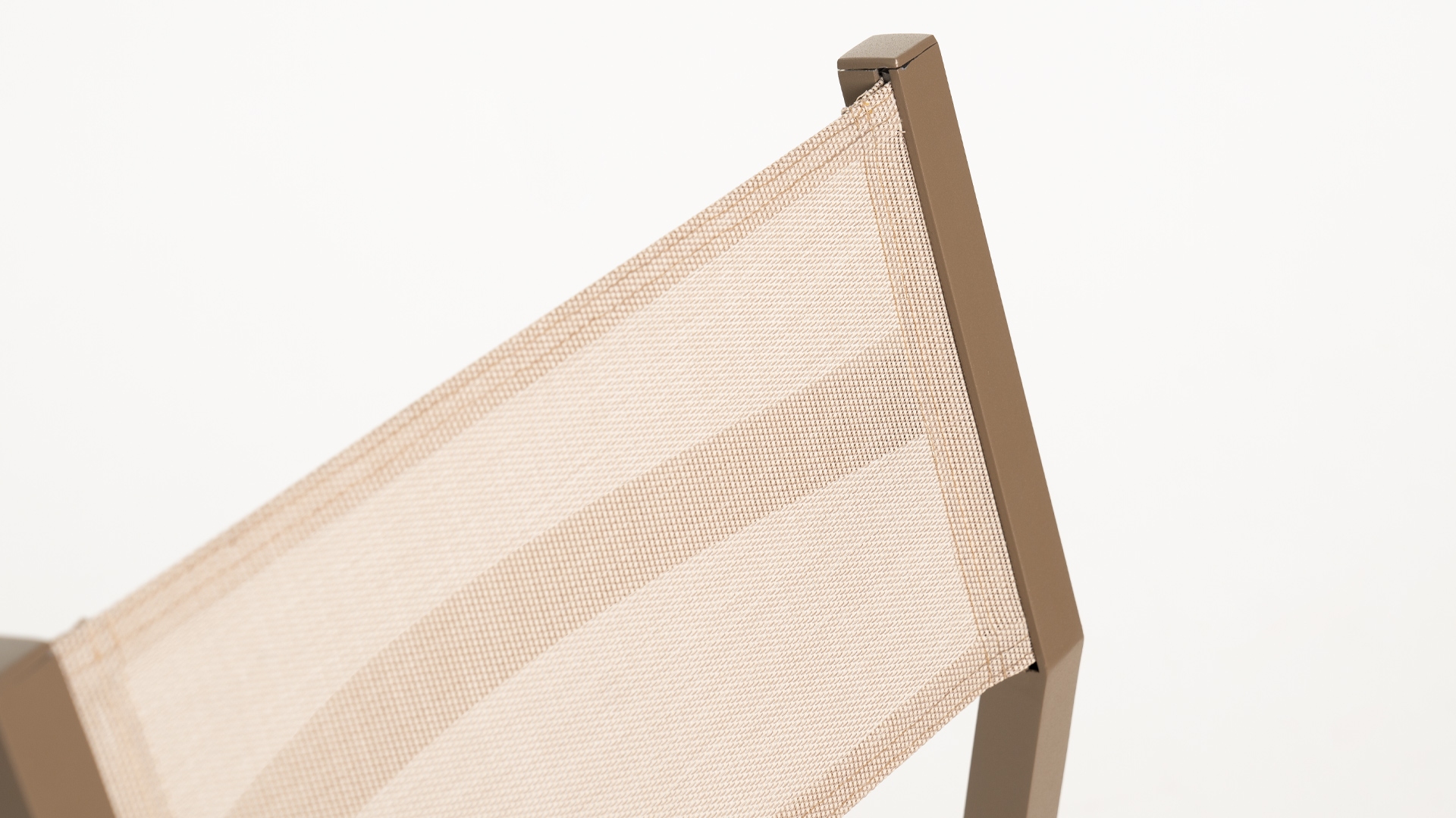 Silla de comedor Brera. Estructura fabricada en aluminio con recubrimiento poliuretánico en color Fendi. El género utilizado es una fibra de poliéster tejida con recubrimiento de PVC terminado en color fendi. Se recomienda no exponerlo a la intemperie de manera directa cuando no esté en uso. De lo contrario se deberá utilizar una funda protectora.