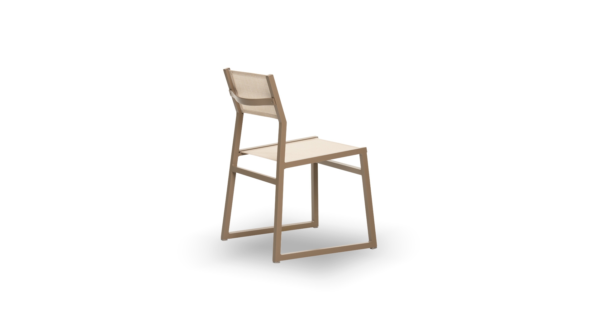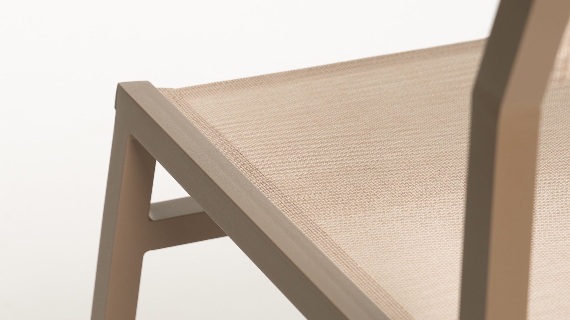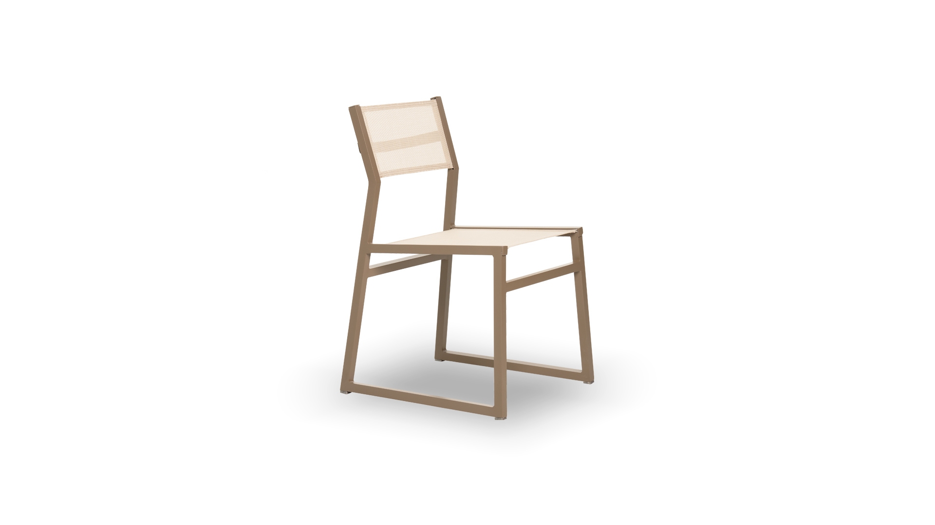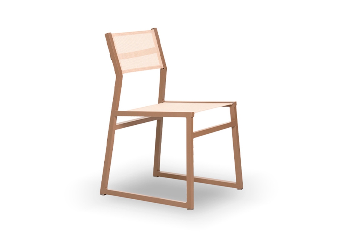 Silla de comedor Brera. Estructura fabricada en aluminio con recubrimiento poliuretánico en color Fendi. El género utilizado es una fibra de poliéster tejida con recubrimiento de PVC terminado en color fendi. Se recomienda no exponerlo a la intemperie de manera directa cuando no esté en uso. De lo contrario se deberá utilizar una funda protectora.