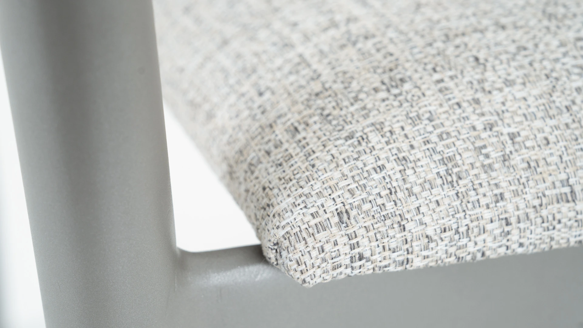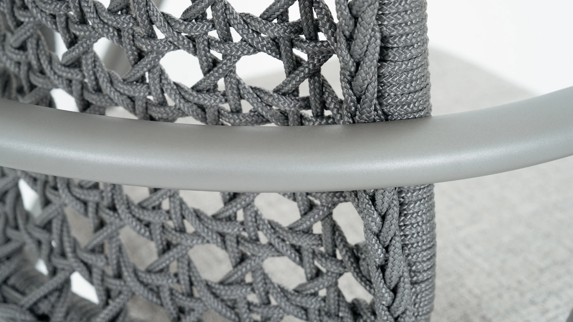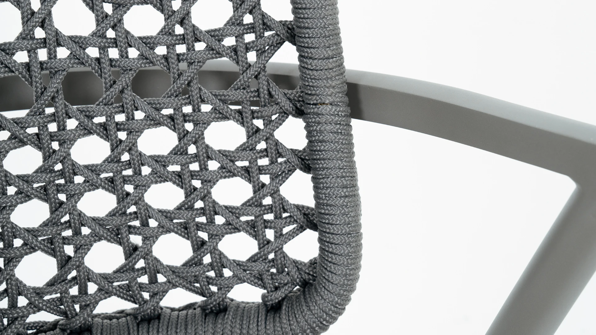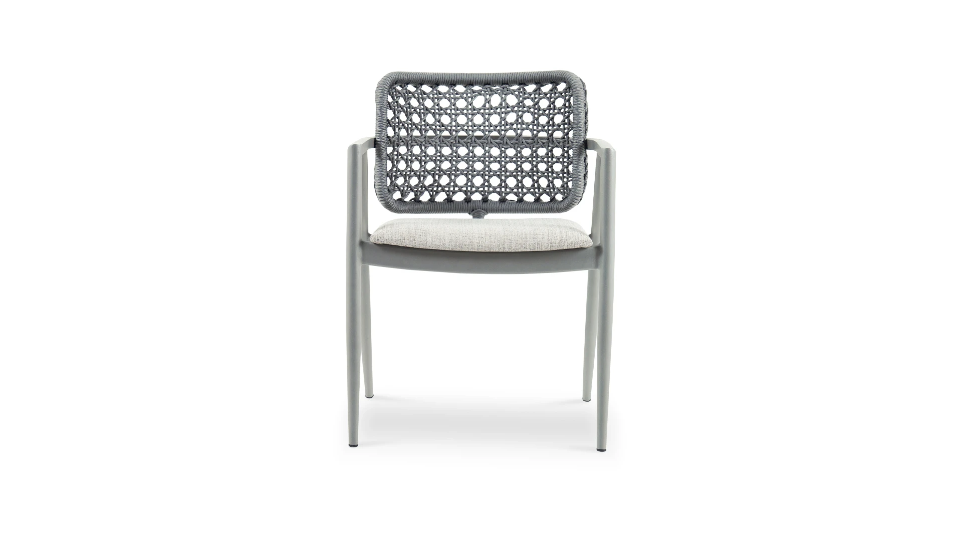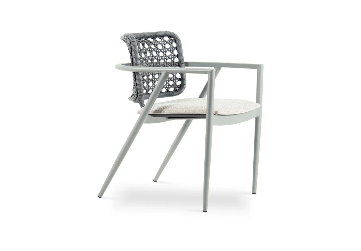 Silla de comedor Creta. Estructura fabricada en aluminio con recubrimiento poliuretánico terminada con pintura electroestática en color gris, respaldo realizado en cuerda naútica y el asiento tapizado con tela naútica. *Este producto no es customizable*