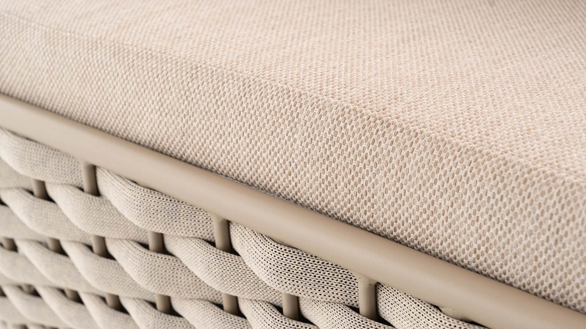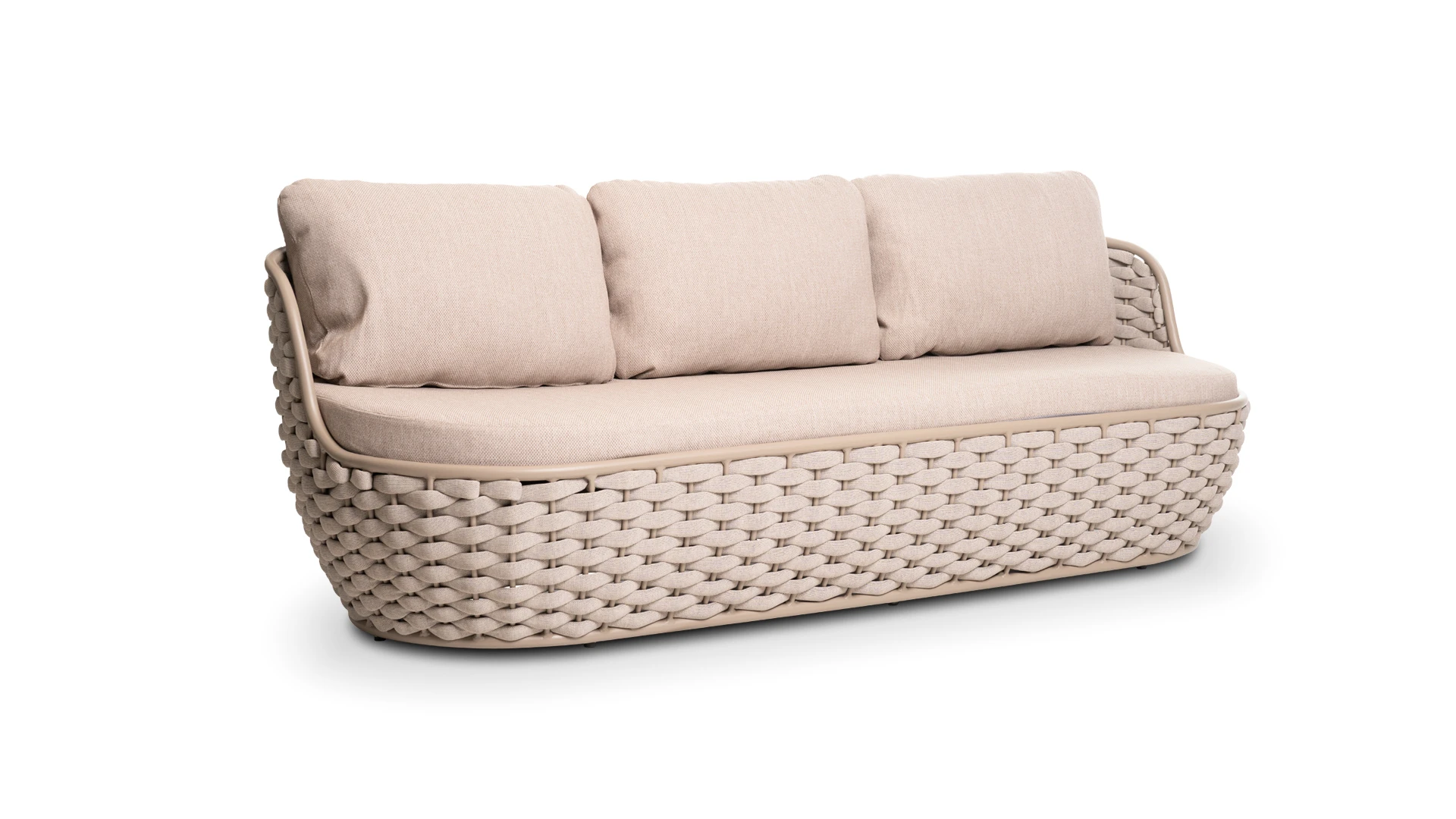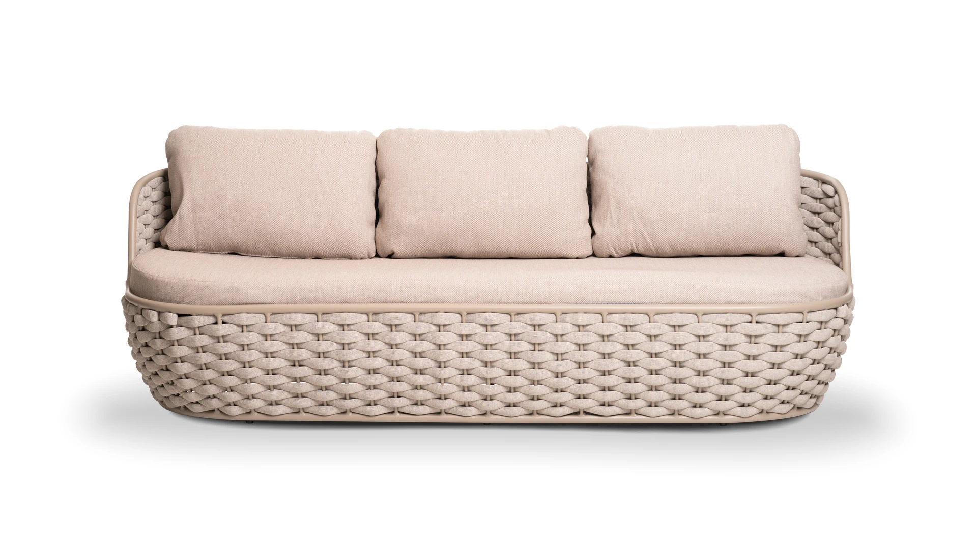Sofá Porto. Tramado realizado en soga náutica. Estructura de aluminio pintado bajo el proceso powder coating. Este producto debe ser utilizado en espacios semicubiertos o galerías. No exponerlo a la intemperie de manera directa. Se recomienda utilizar una funda protectora. **Este producto no es customizable**