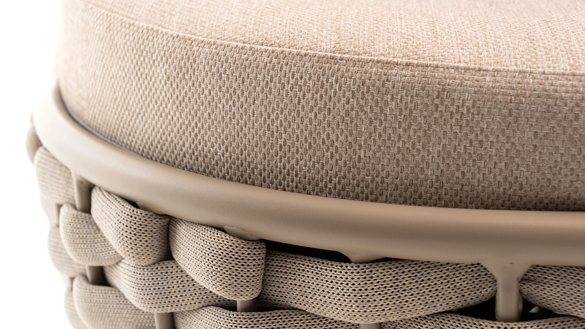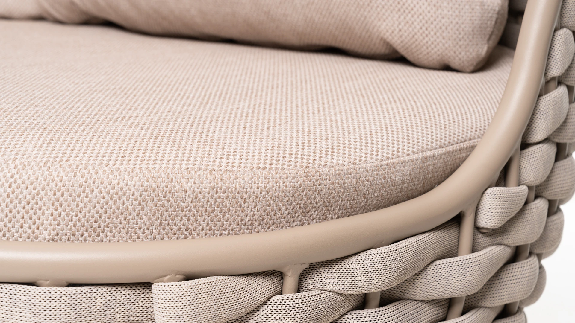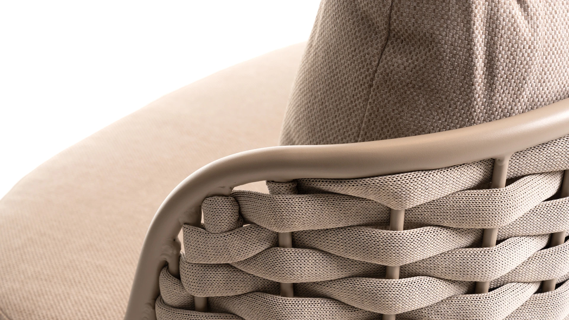 Sofá Porto. Tramado realizado en soga náutica. Estructura de aluminio pintado bajo el proceso powder coating. Este producto debe ser utilizado en espacios semicubiertos o galerías. No exponerlo a la intemperie de manera directa. Se recomienda utilizar una funda protectora. **Este producto no es customizable**