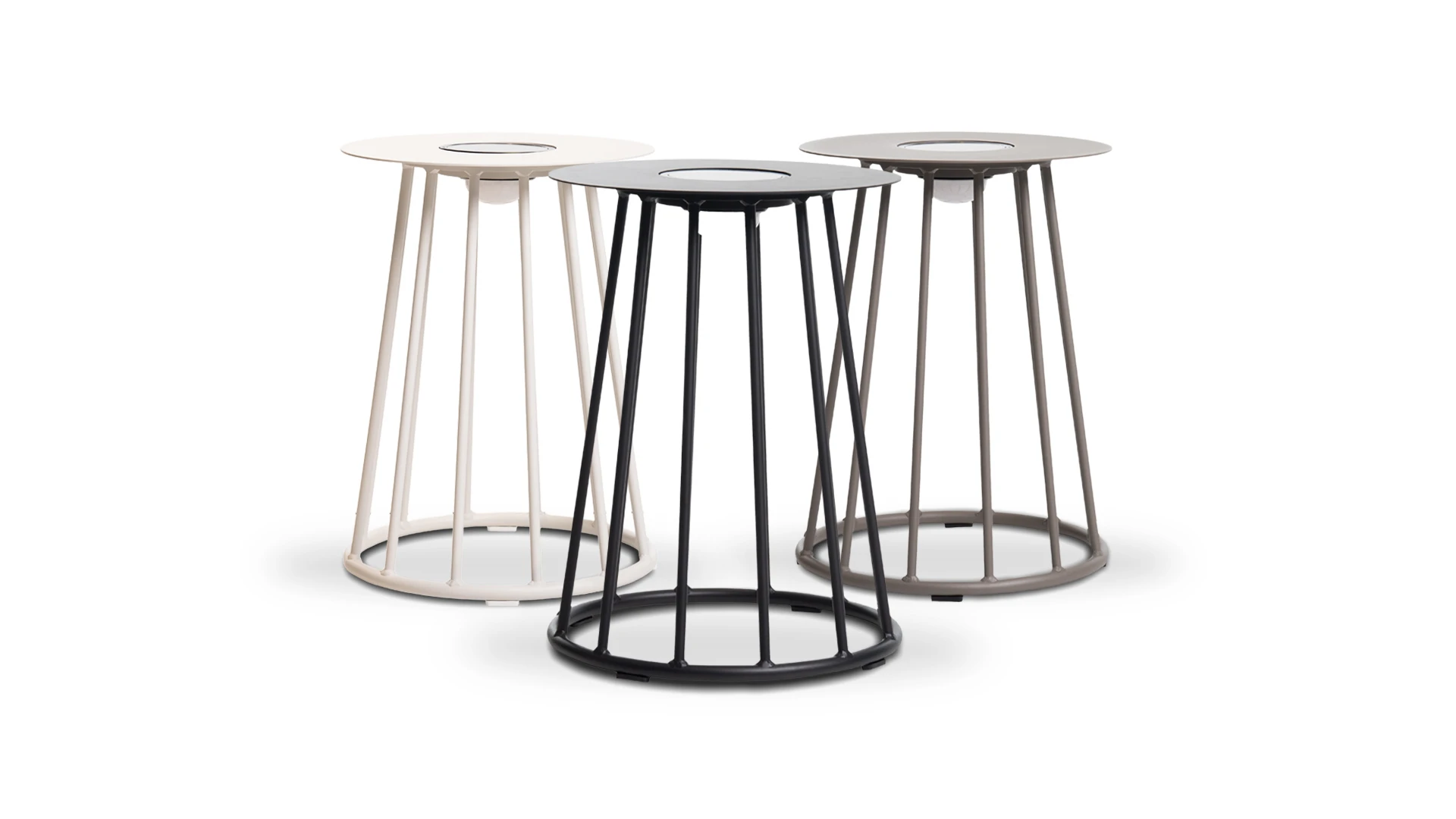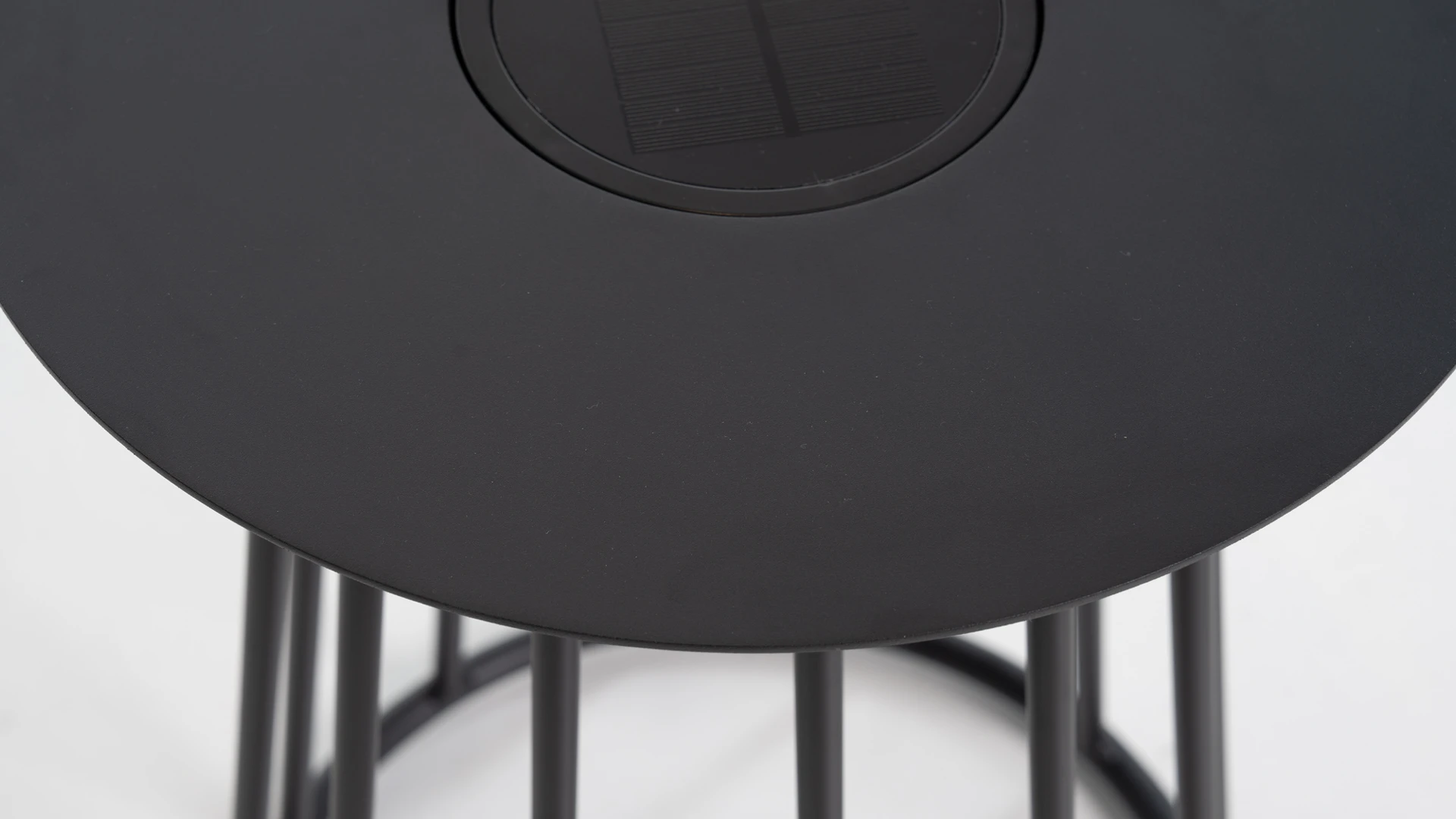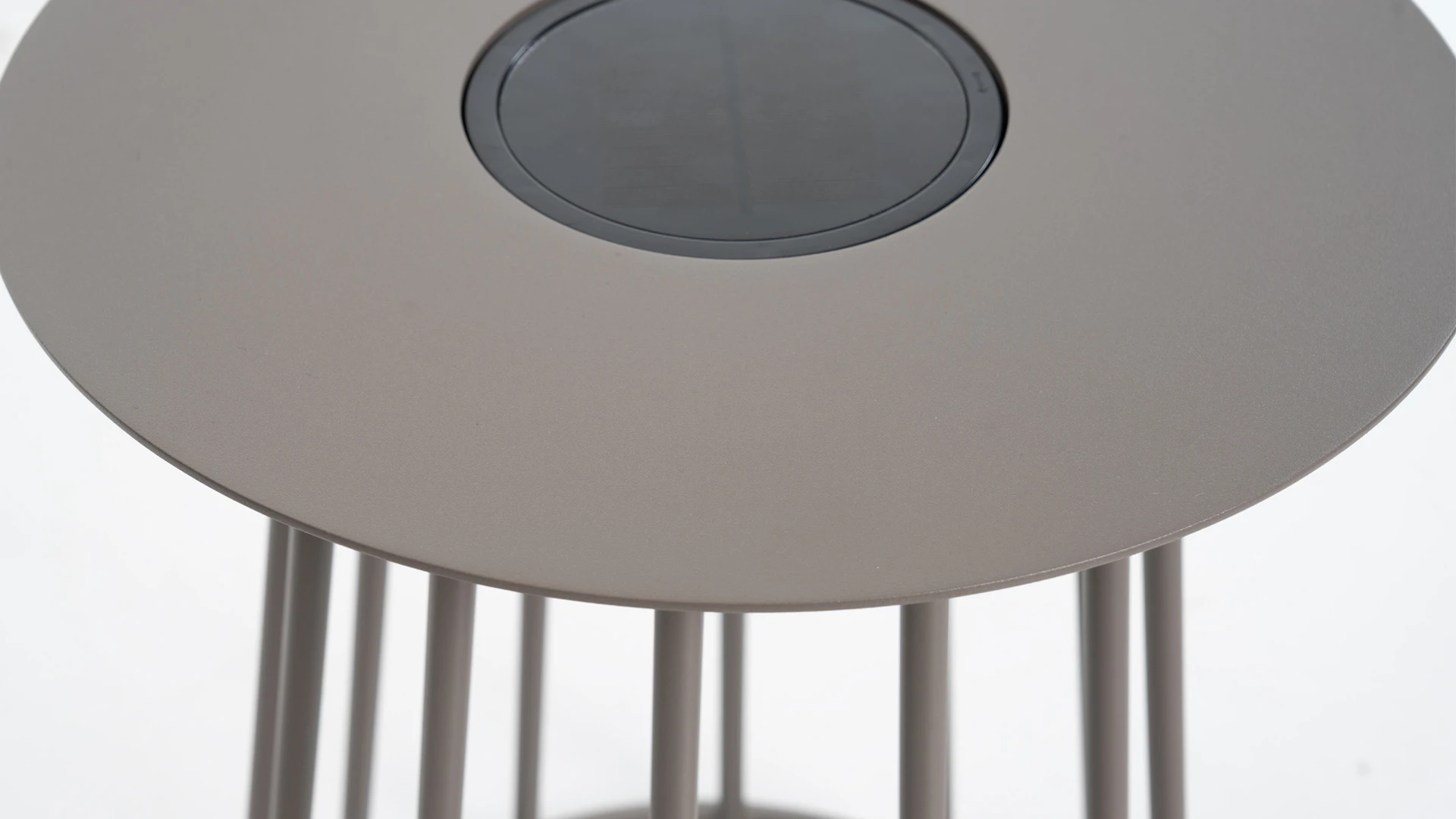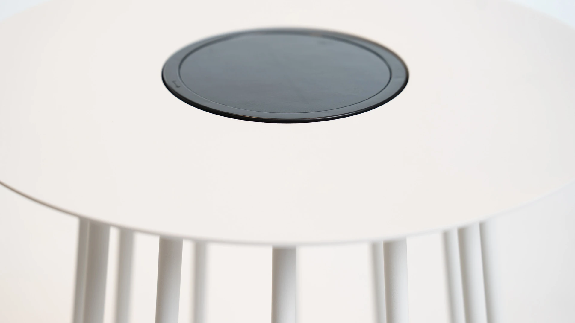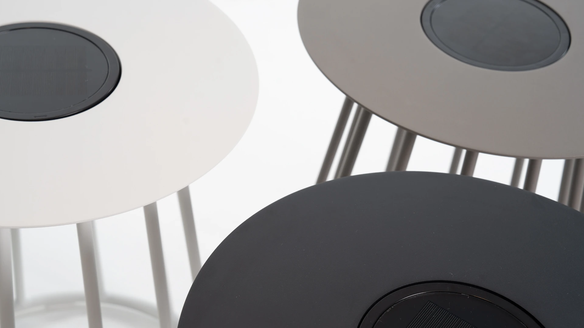 Lampara Mare. Cuenta con una estructura conica de aluminio y la tapa posee un panel de carga solar. La terminación esta realizada con pintura electroestática en tres colores: blanco, negro o gris. Este producto debe ser utilizado en espacios semicubiertos o galerías. No exponerlo a la intemperie de manera directa. **Este producto no es customizable**