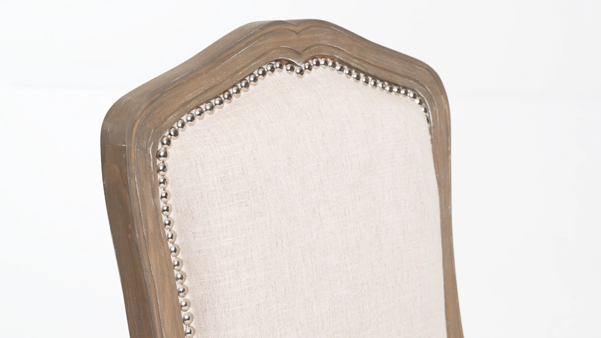 El respaldo, de formato alto y contorno suavemente moldurado, se encuentra tapizado y rematado con detalle de tachuelas decorativas, recurso que refuerza su identidad artesanal.