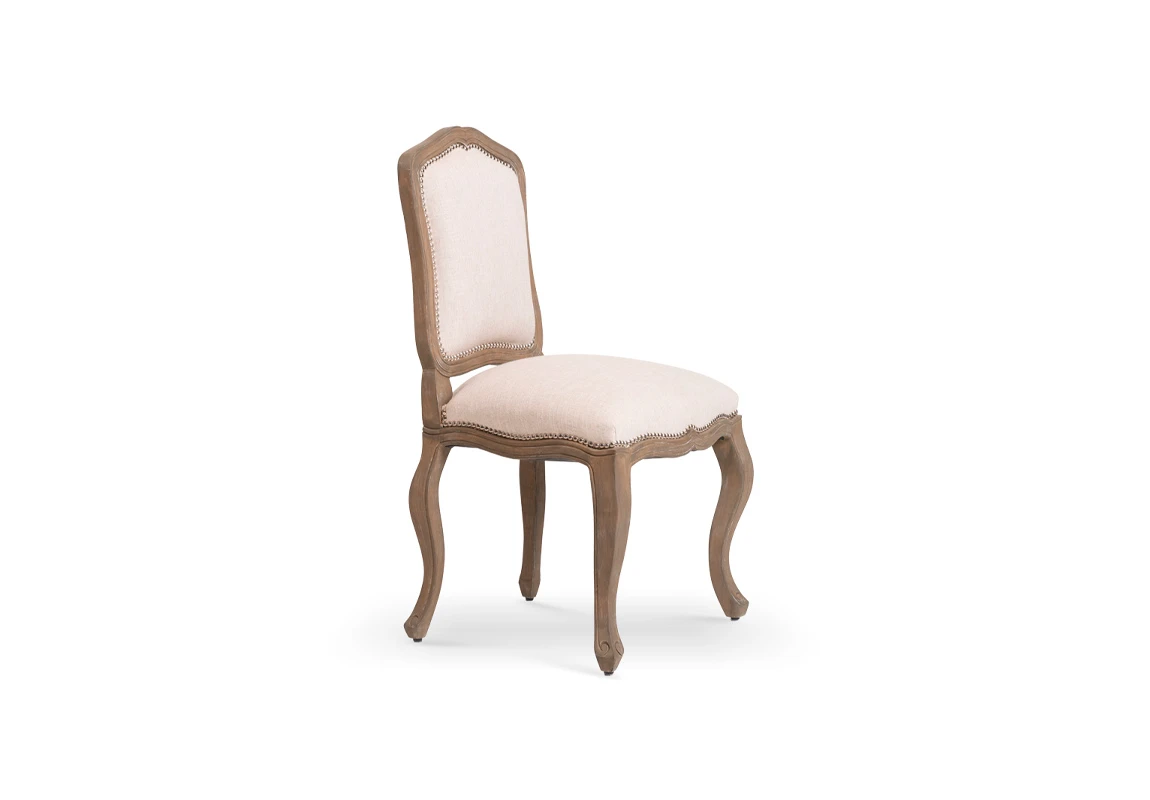 Silla Luis XVI, caracterizada por líneas clásicas, proporciones armónicas y estética de inspiración francesa. Presenta una estructura de madera maciza con terminación en tono natural, destacando patas delanteras y traseras de perfil curvo que aportan estabilidad y elegancia formal.