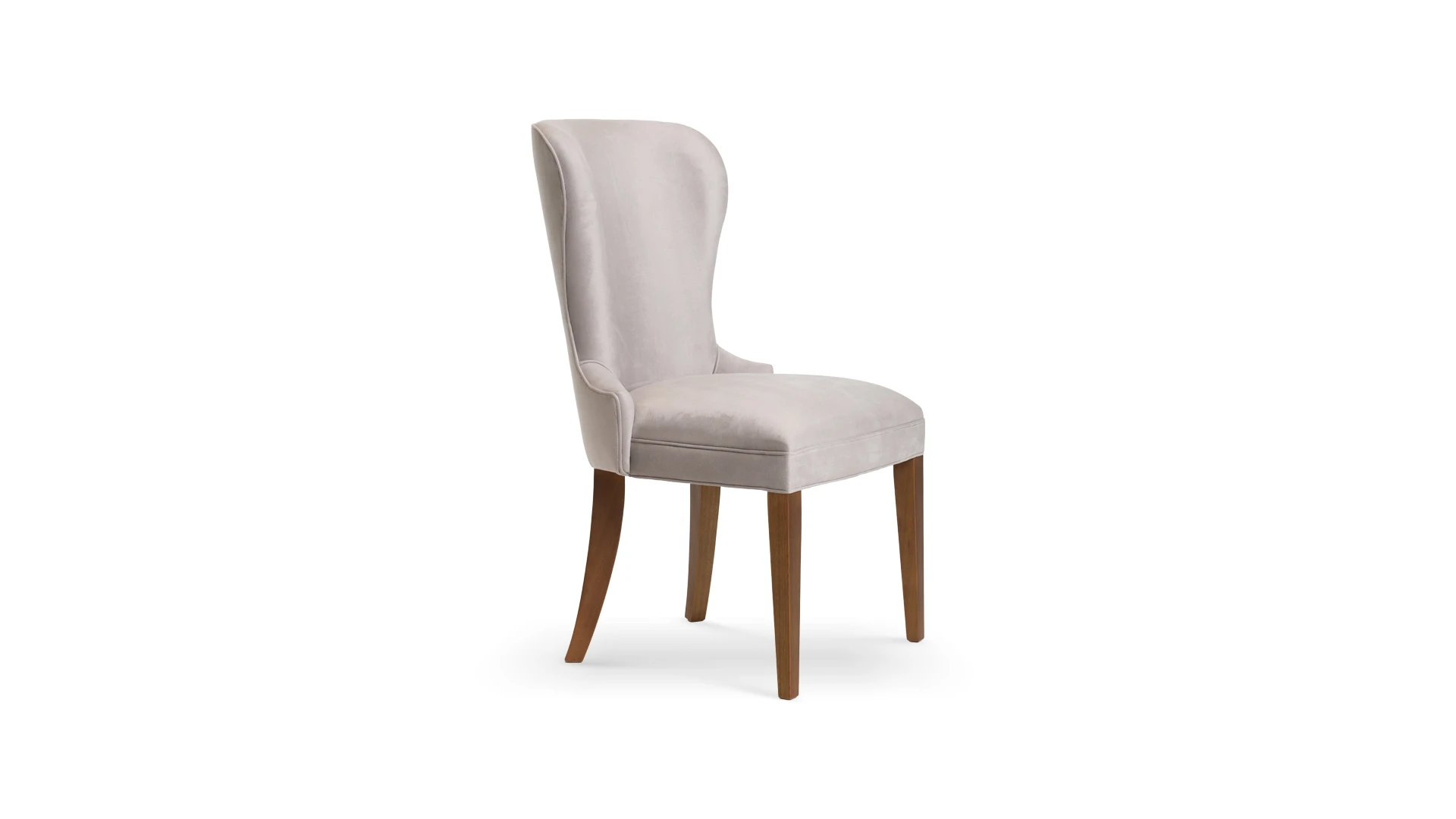 Silla tapizada de estilo clásico contemporáneo, con estructura de madera maciza y lustre color madera. Presenta respaldo alto y curvo de líneas continuas, que brinda un apoyo confortable, y asiento acolchado de apoyo amplio.