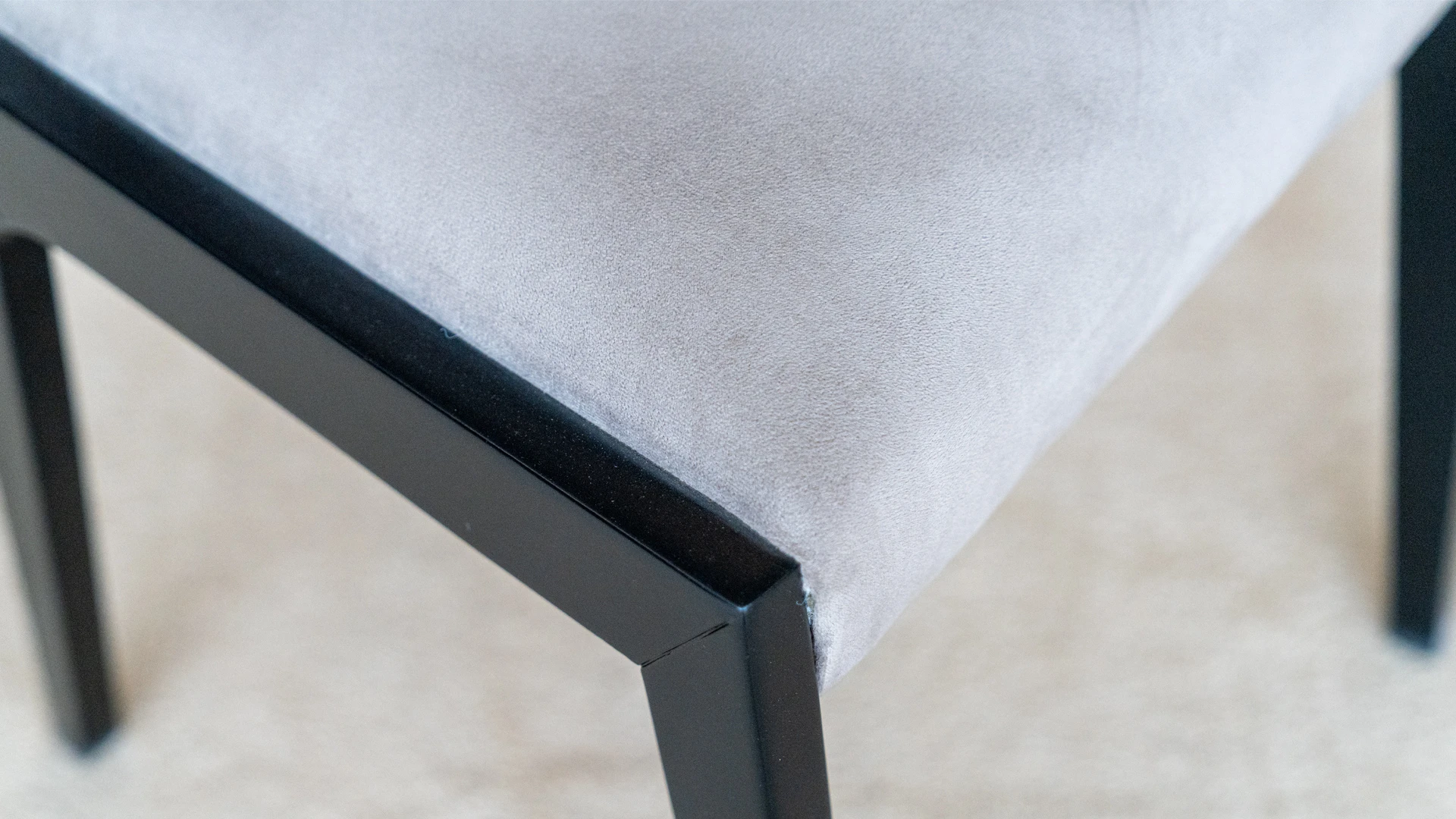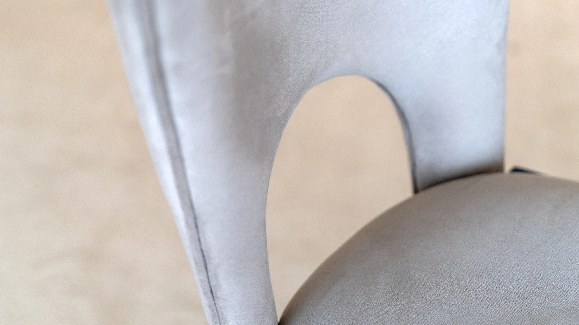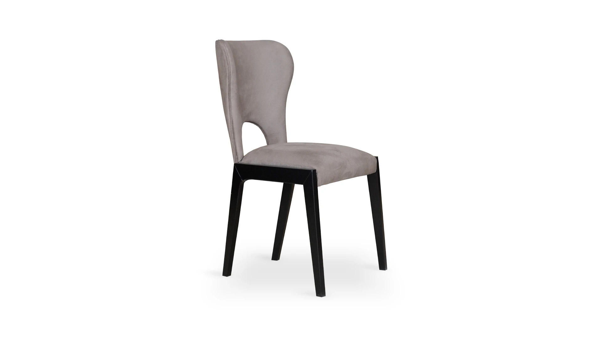 Silla tapizada con respaldo curvo y asiento de alta densidad, fabricada en madera de guindo pintada negro semimate. Tapizado en pana Porsche Slate, resistente y de tacto suave. Apta para comedores y espacios de estar.
