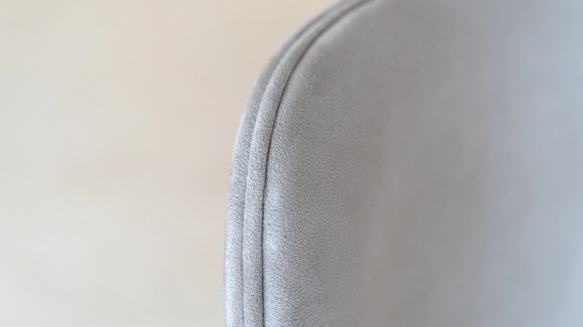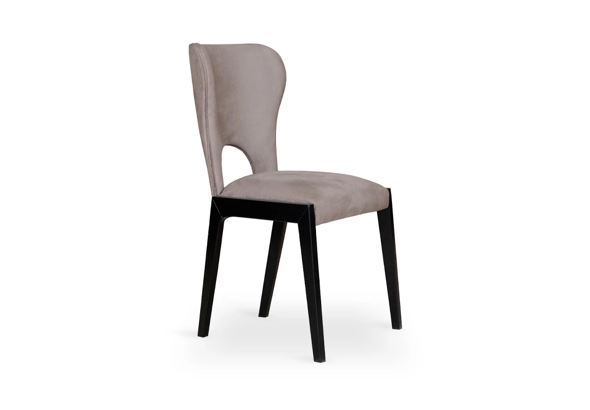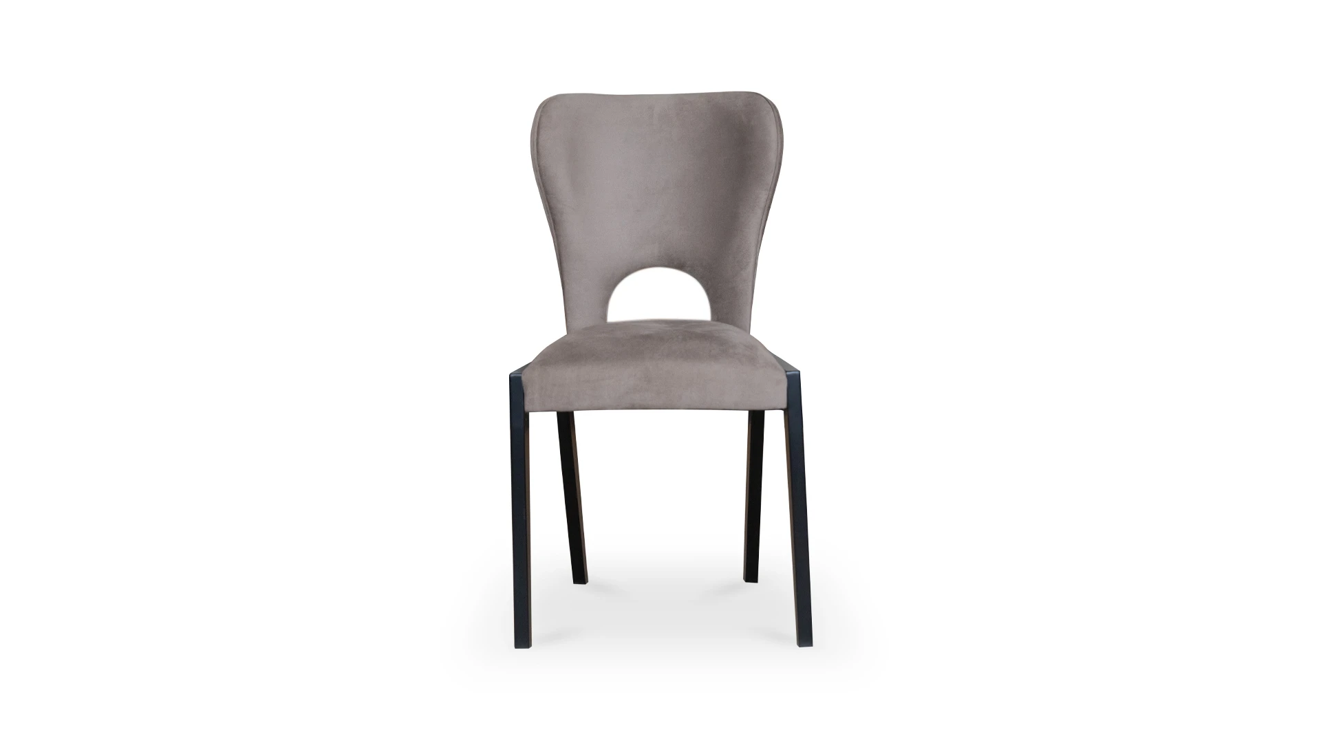 Silla tapizada con respaldo curvo y asiento de alta densidad, fabricada en madera de guindo pintada negro semimate. Tapizado en pana Porsche Slate, resistente y de tacto suave. Apta para comedores y espacios de estar.
