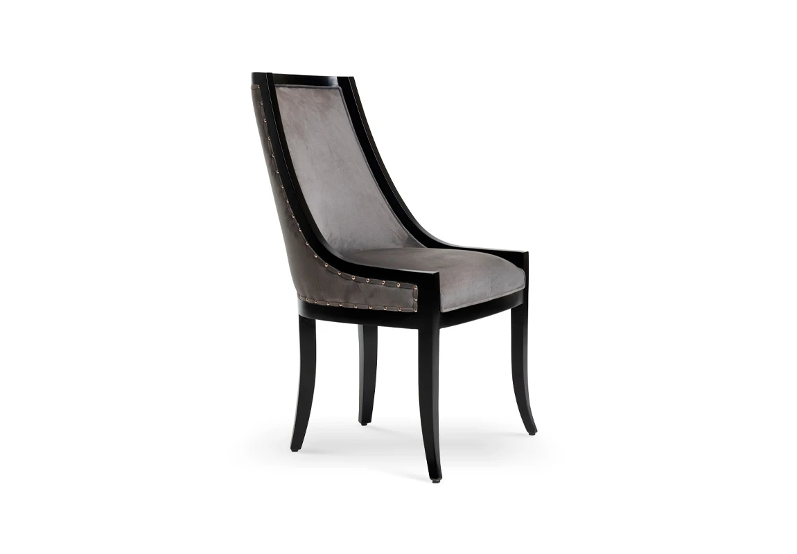 Silla tapizada con respaldo alto y curvo, fabricada en madera de guindo con terminación negro semimate. El tapizado en pana Porsche Nickel ofrece suavidad y resistencia, mientras que el asiento acolchado garantiza confort. Detalle de tachas decorativas en el perímetro.