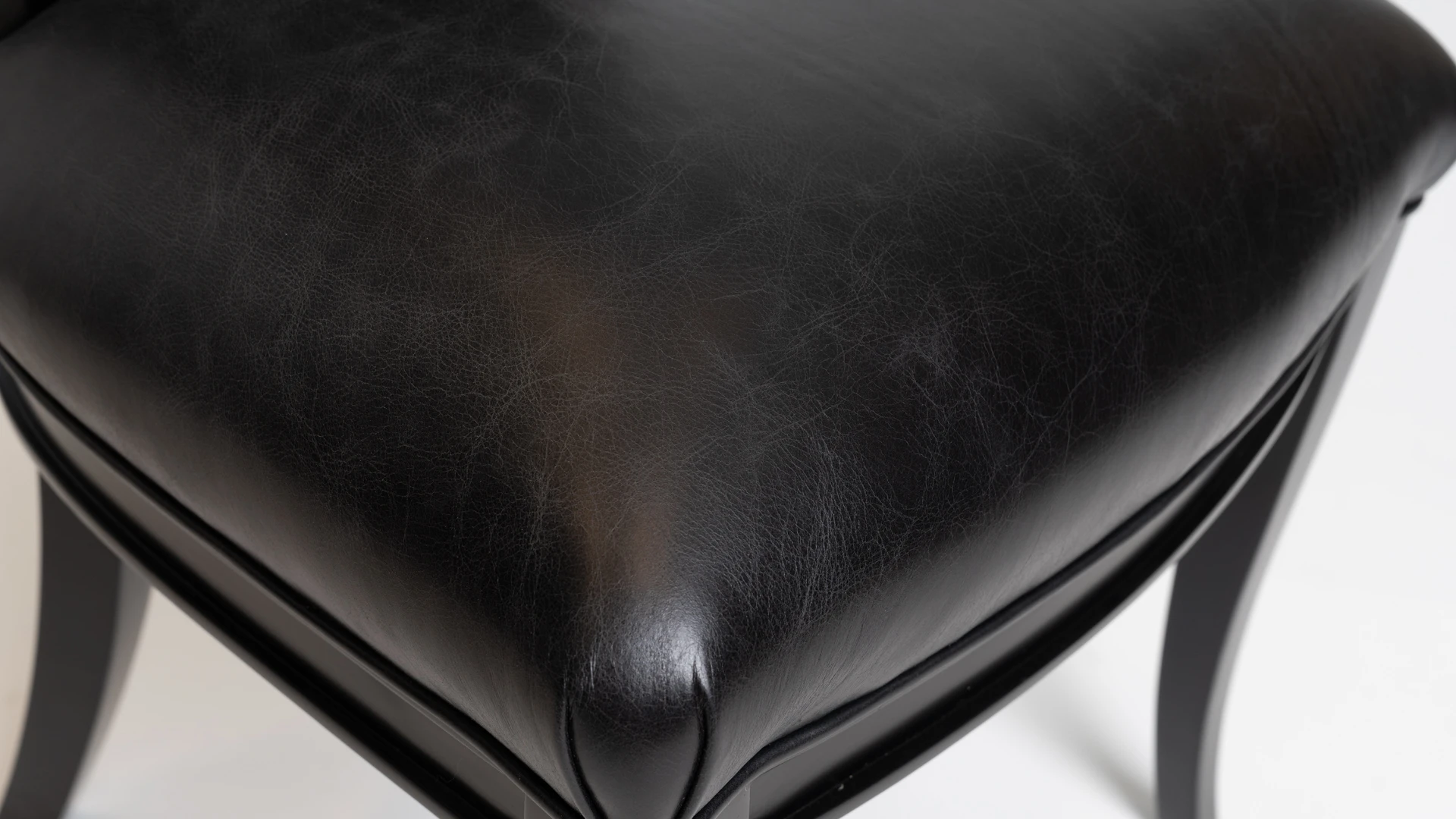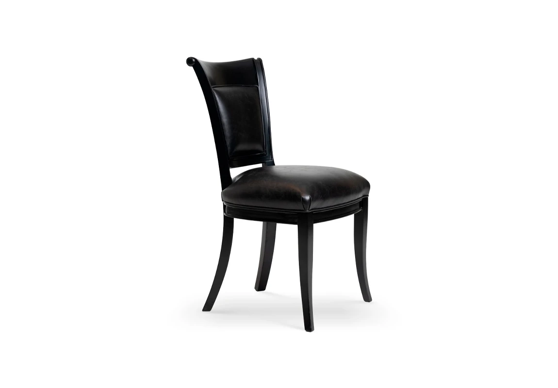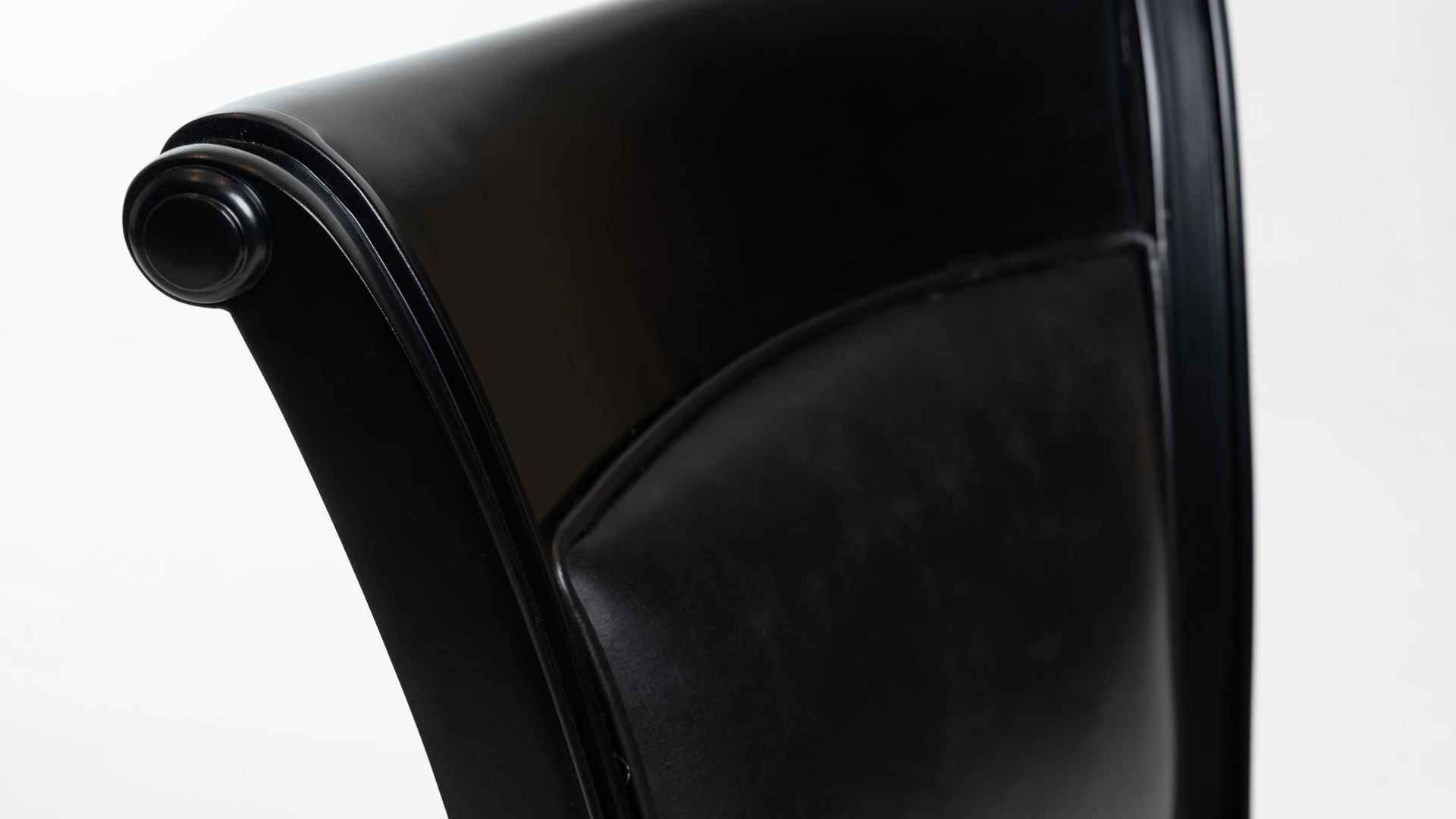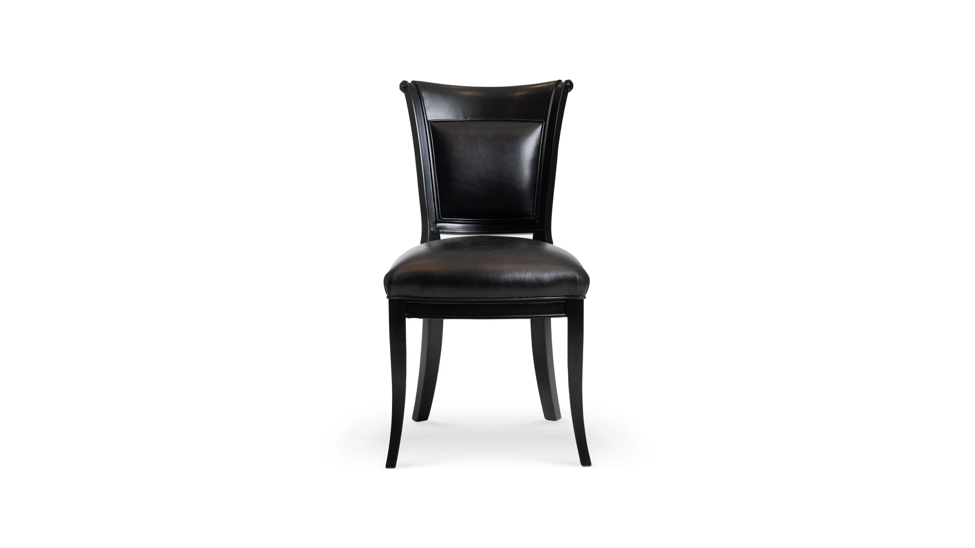 Silla de diseño clásico con respaldo alto y asiento tapizado en cuero negro, combinado con detalle en rafia en el respaldo. Estructura y patas realizadas en madera de guindo, que aportan solidez y durabilidad. Pieza ideal para comedores y espacios de estilo elegante y atemporal.