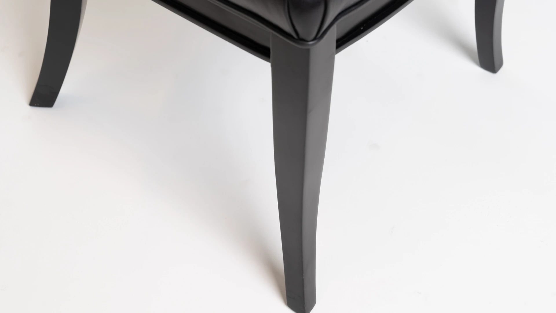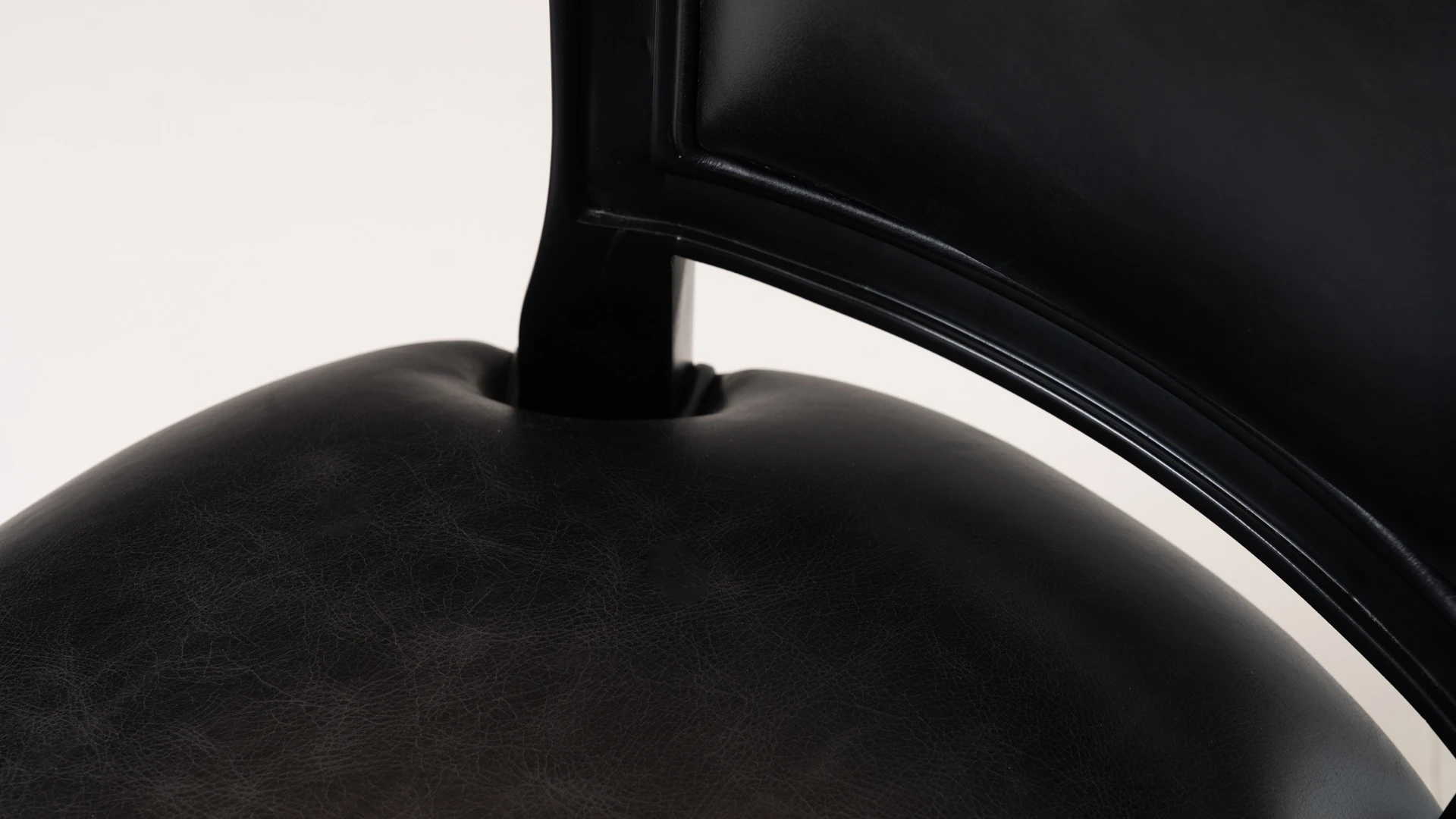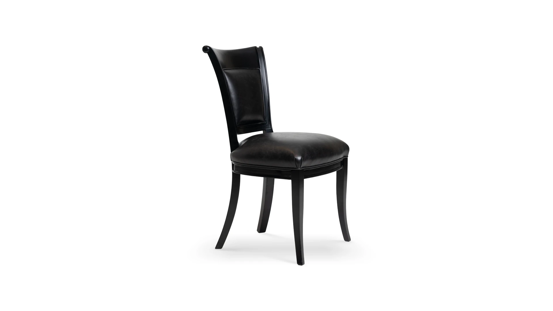 Silla de diseño clásico con respaldo alto y asiento tapizado en cuero negro, combinado con detalle en rafia en el respaldo. Estructura y patas realizadas en madera de guindo, que aportan solidez y durabilidad. Pieza ideal para comedores y espacios de estilo elegante y atemporal.