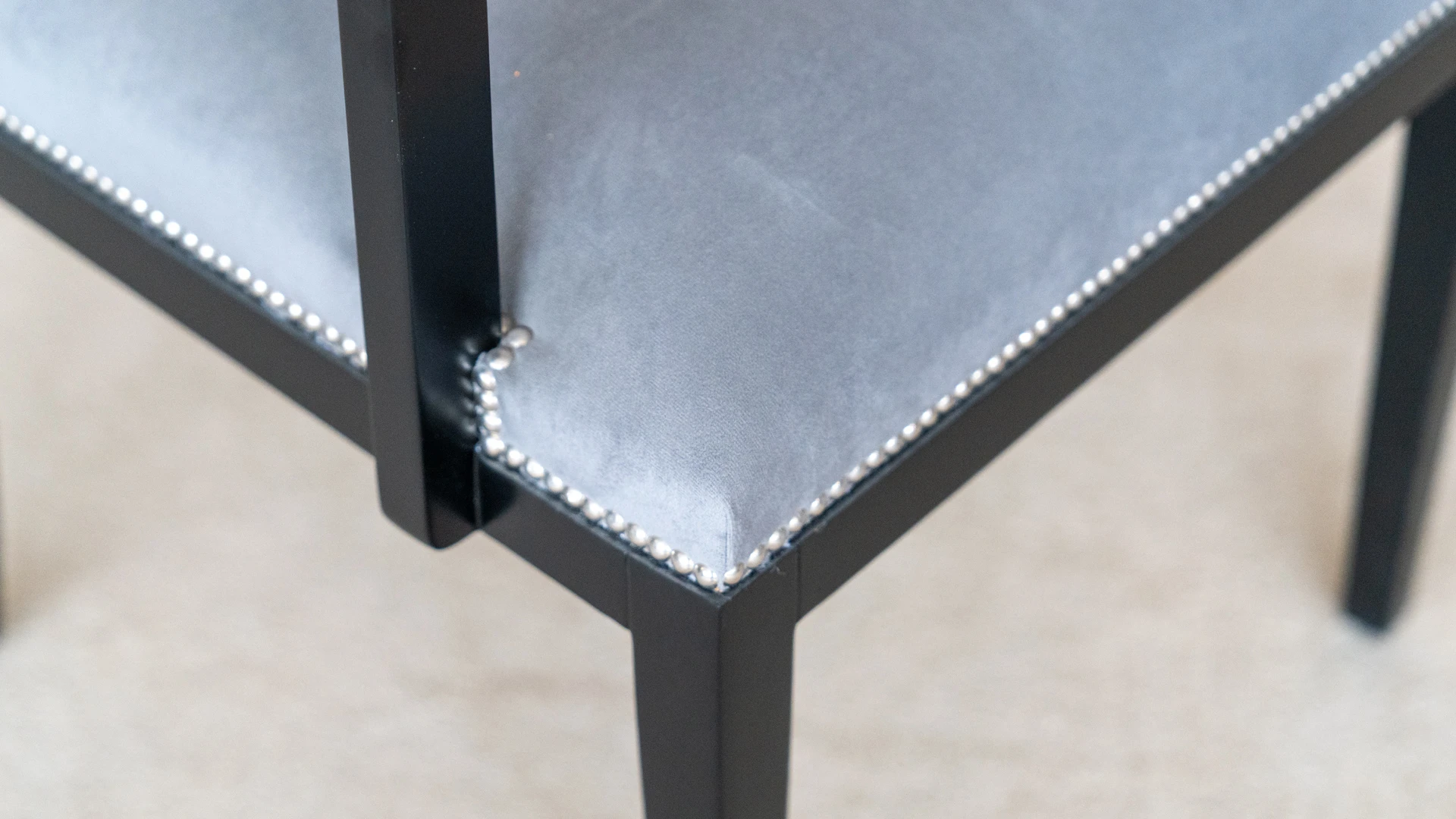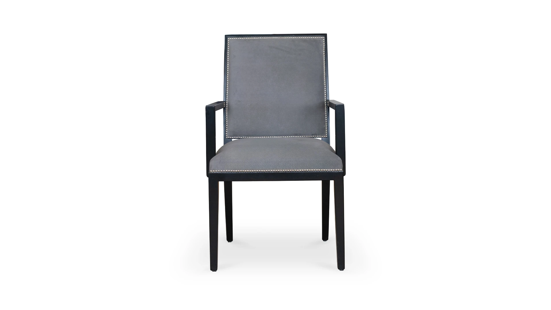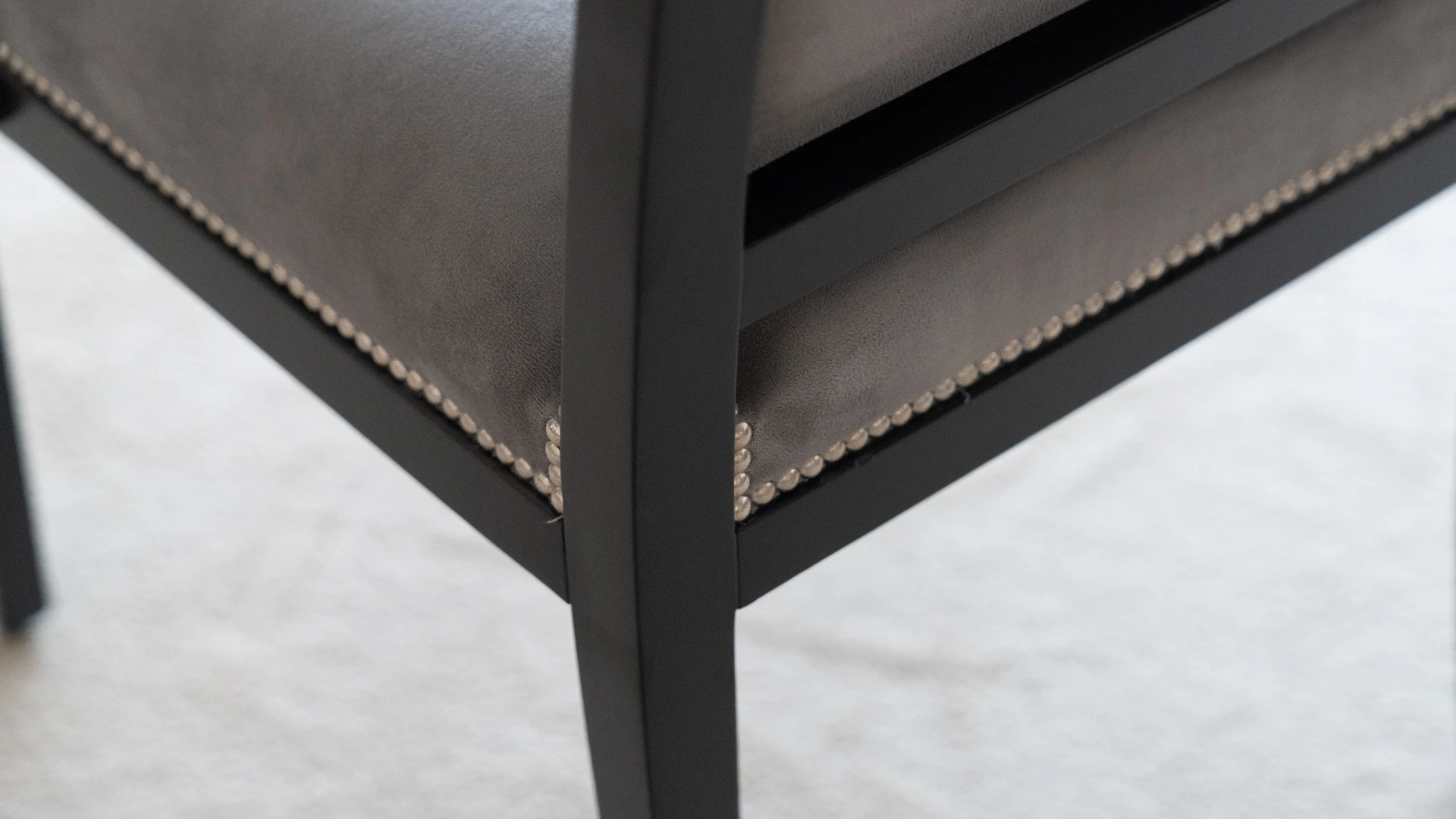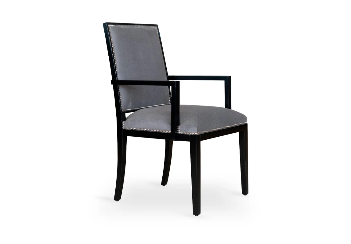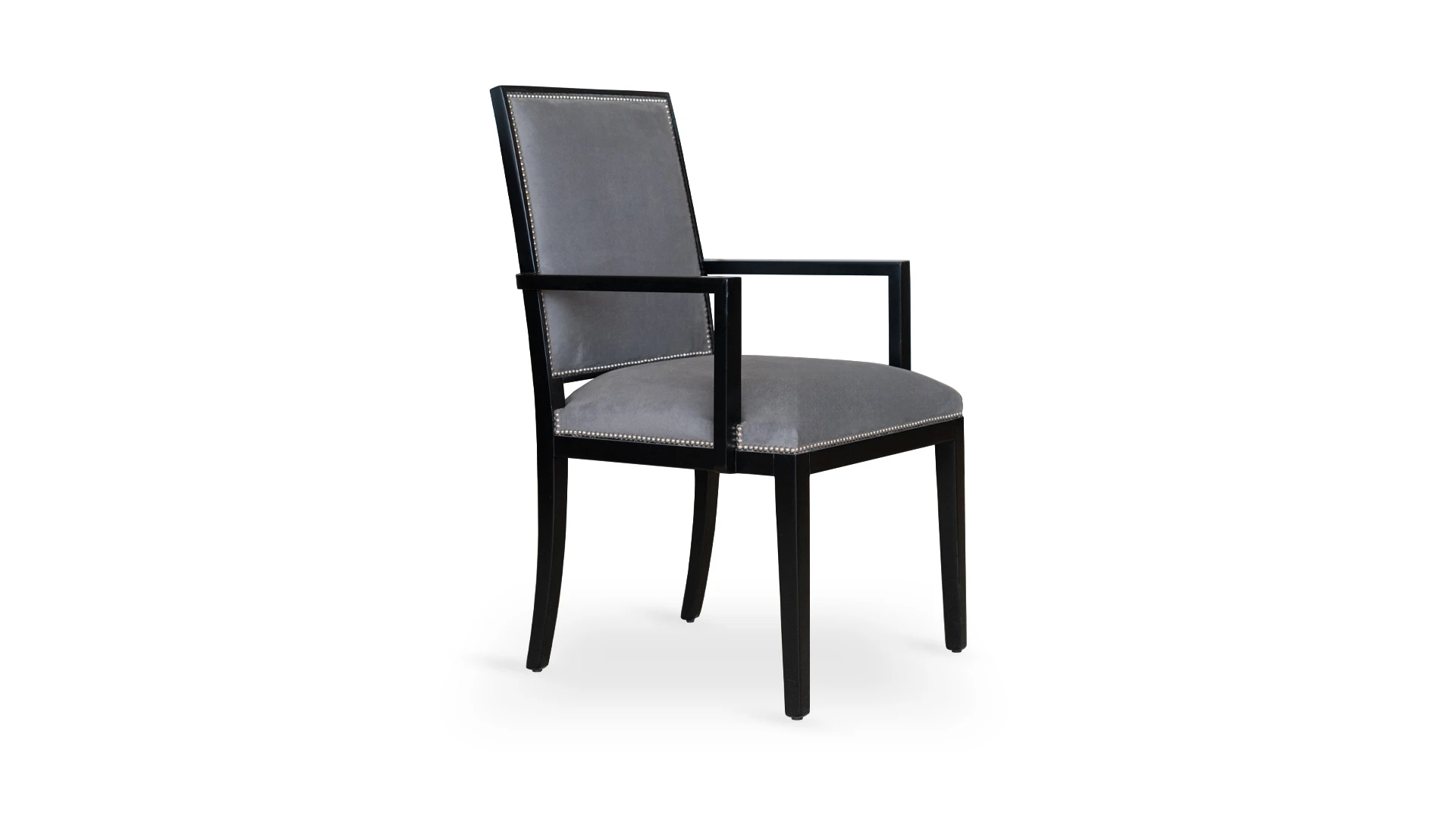 Sillón de diseño contemporáneo, tapizado en tela Porche nickel. Estructura con lustre negro semi mate, de líneas definidas y apoyabrazos integrados. Producto de edición limitada. Consultar stock disponible.