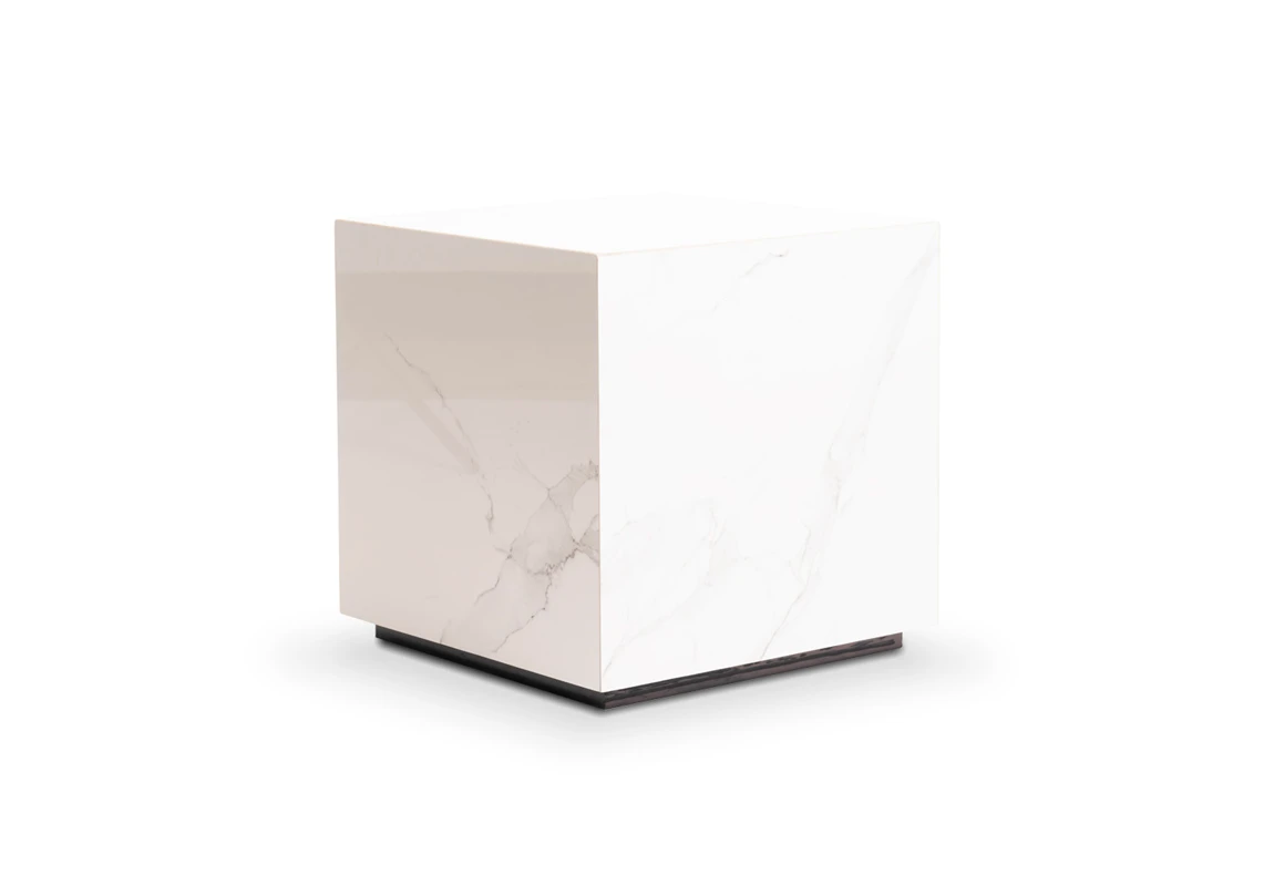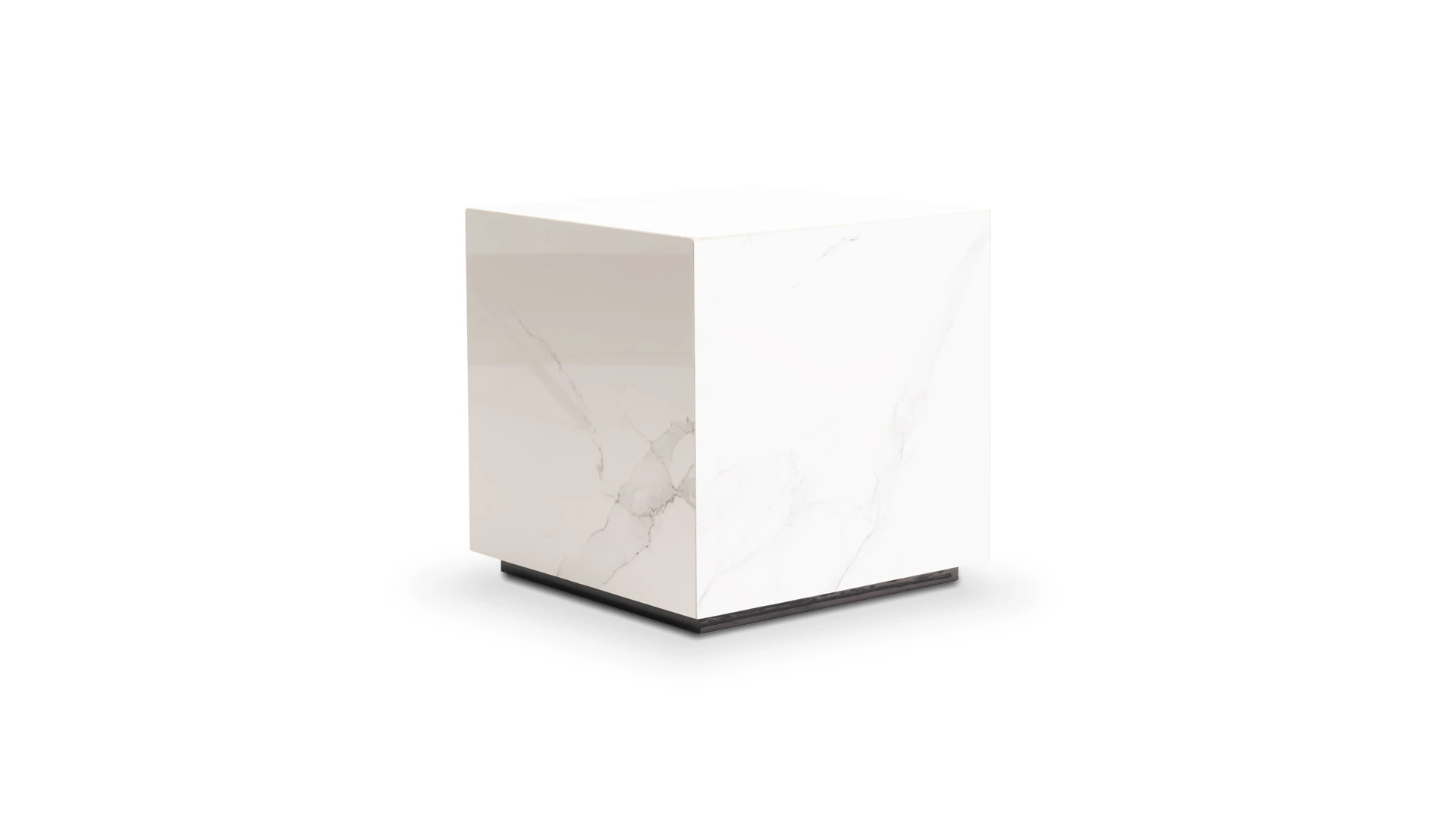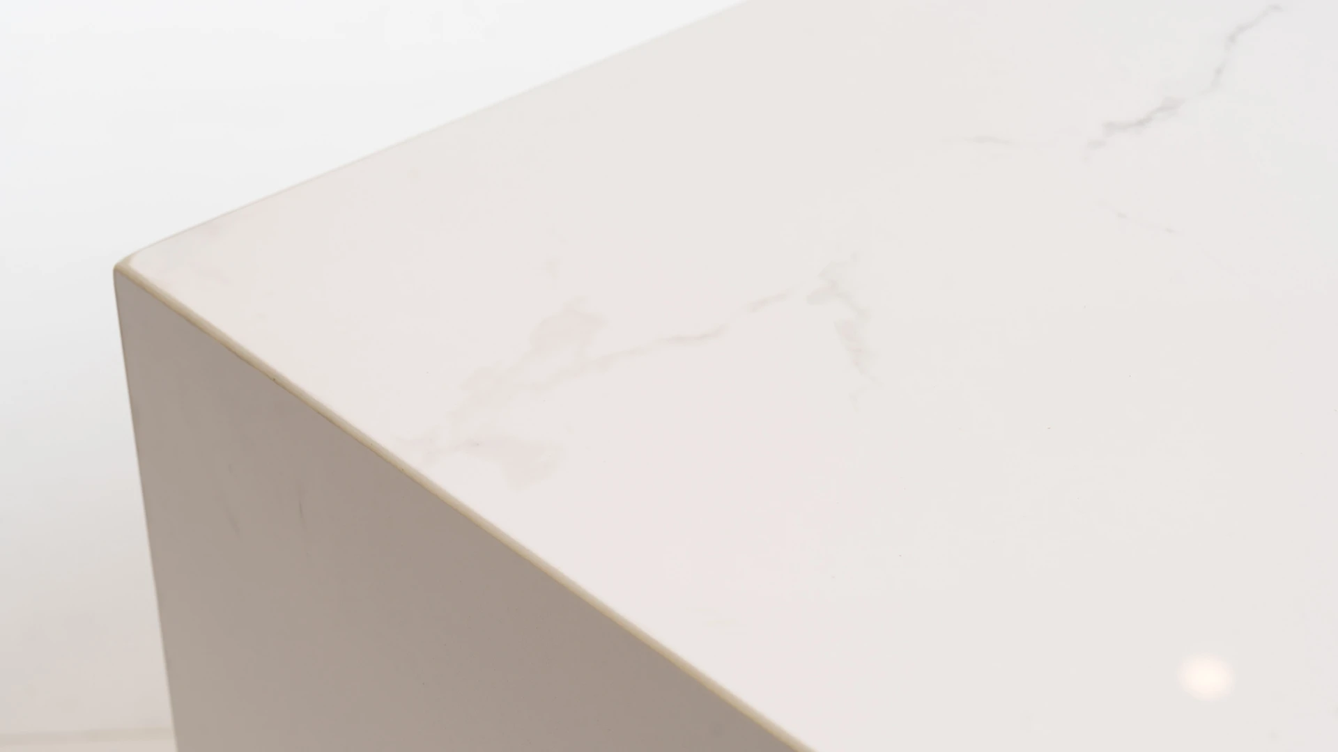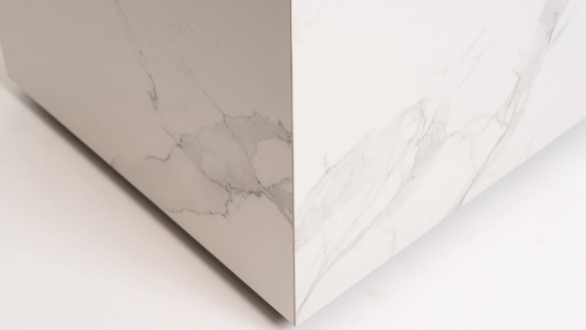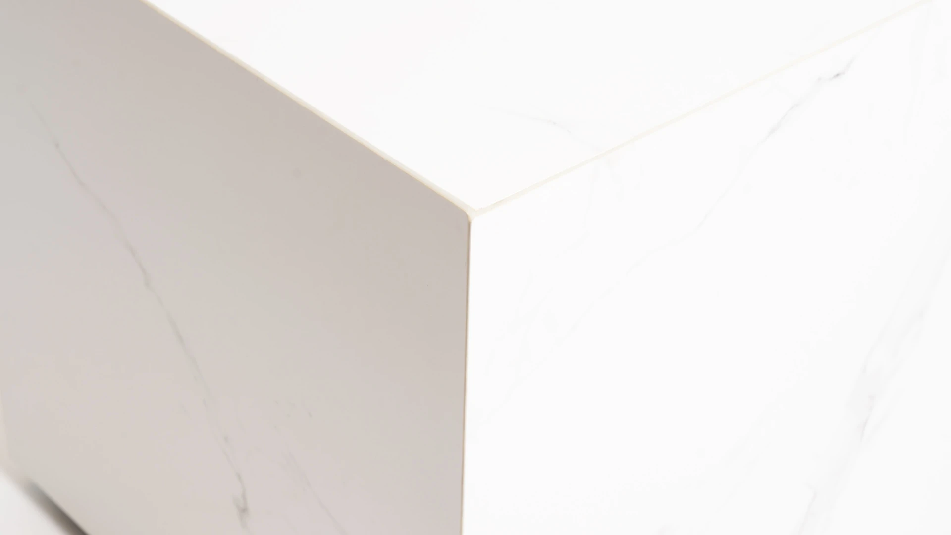 Con diseño geométrico y estética depurada, realizada con Dekton Natura, material de alta resistencia que reproduce la textura y las vetas de la piedra natural con un acabado elegante y contemporáneo. Su forma cúbica aporta presencia y equilibrio visual.