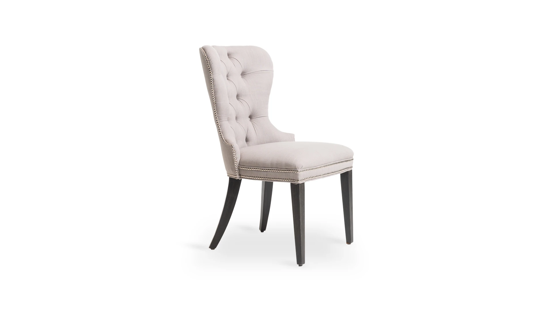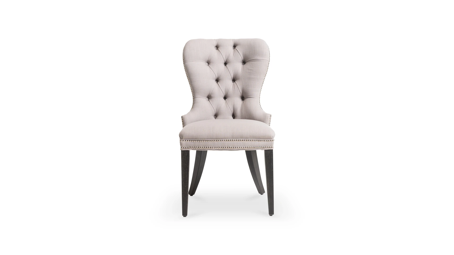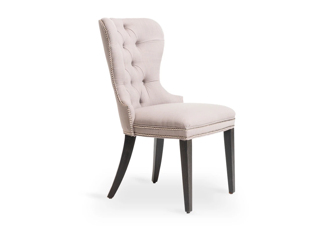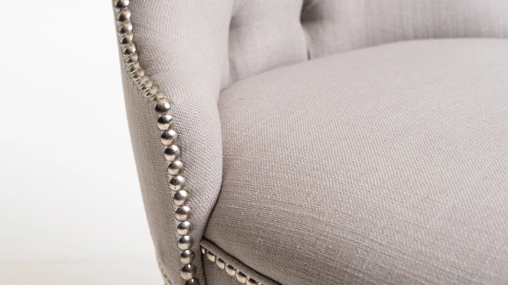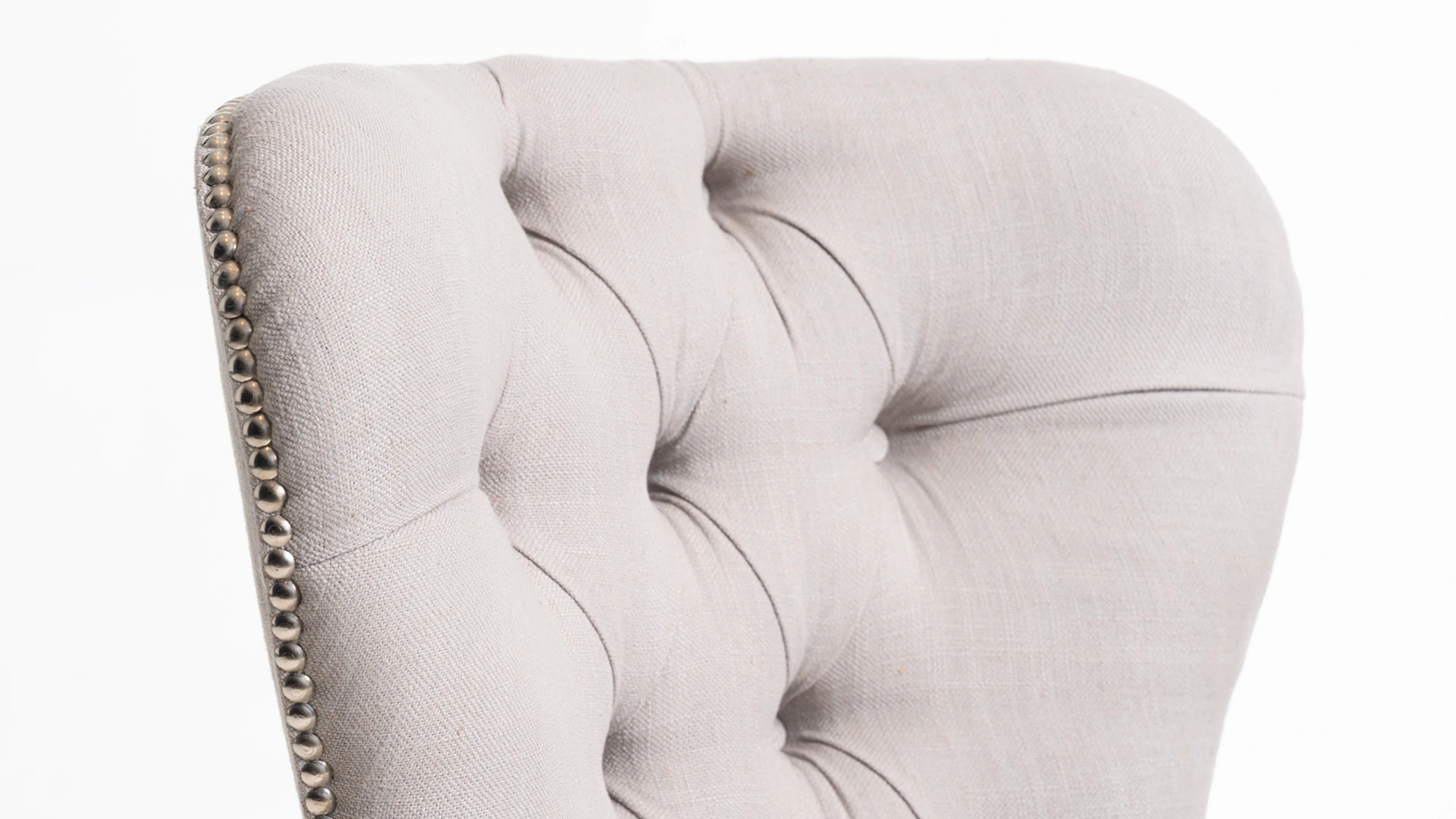 Tapizada en tela Lino Edward Mustang, con respaldo trabajado en capitoné, logrando un equilibrio entre elegancia clásica y diseño contemporáneo.