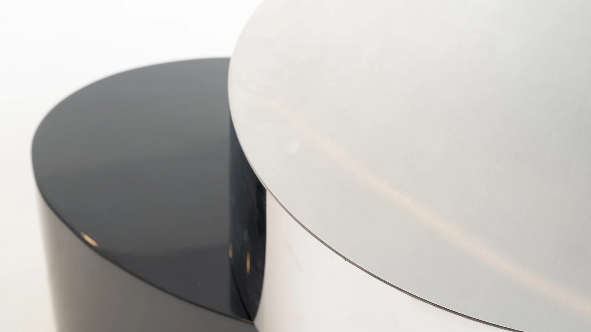 Estructura realizada en MDF. Presenta una tapa revestida en chapa de acero inoxidable pulido de 2 mm y una tapa laqueada con pintura poliuretánica semimate. Diseño contemporáneo de volúmenes superpuestos, que combina contraste de materiales y funcionalidad para espacios de estar modernos.