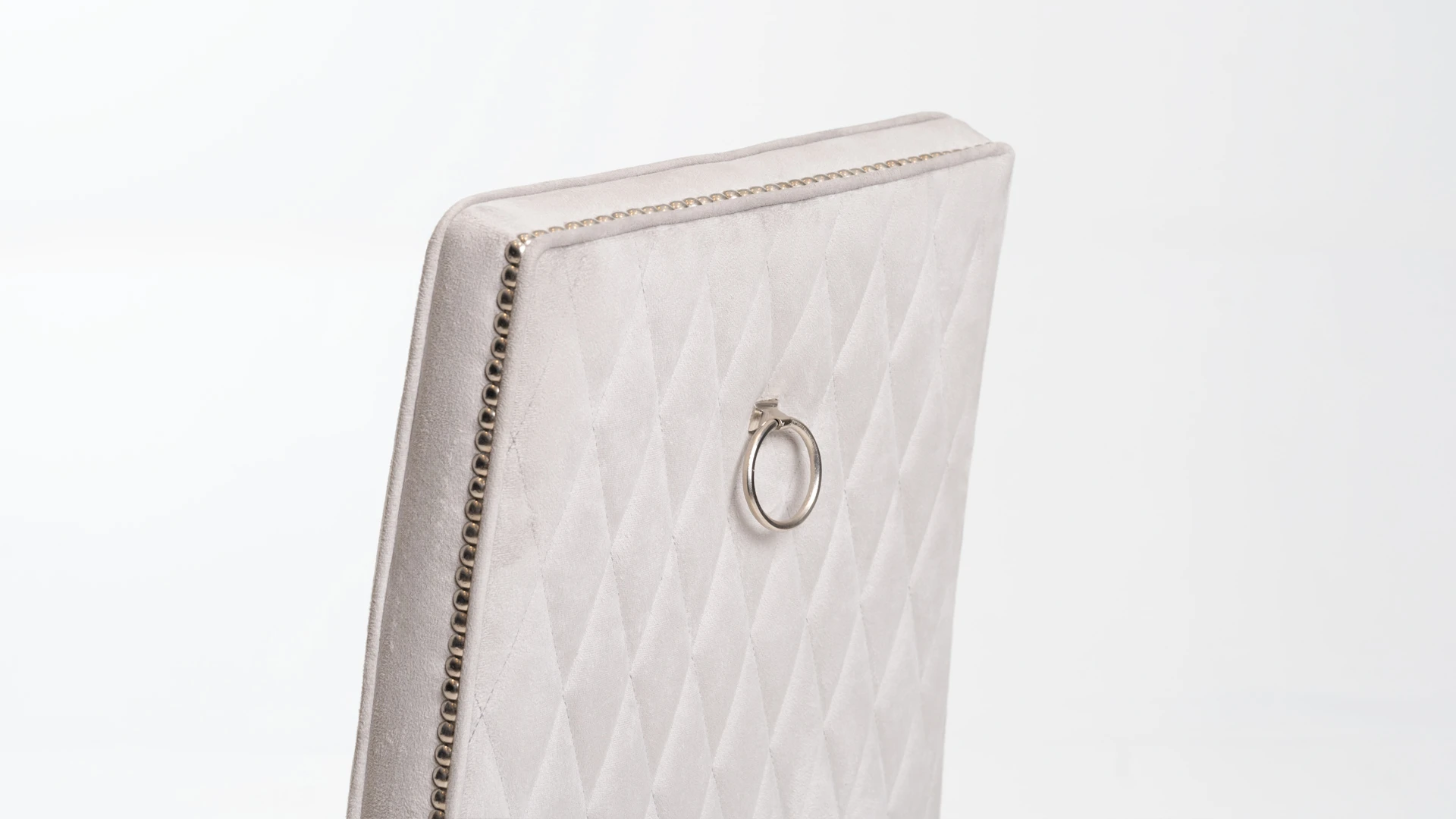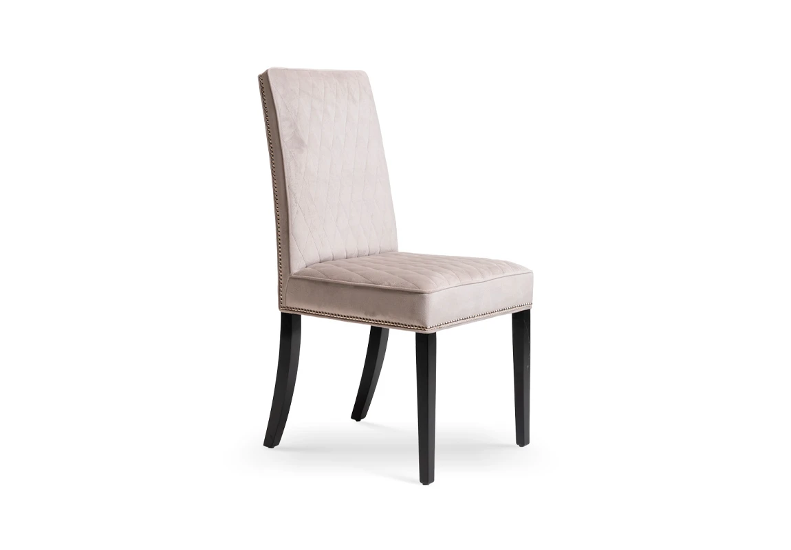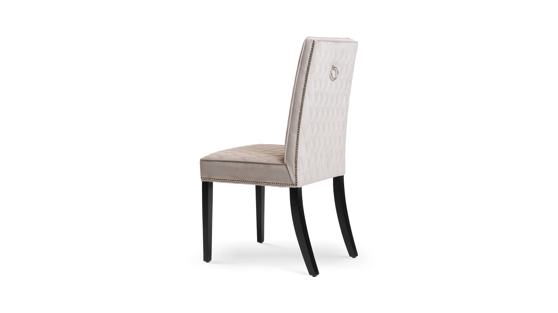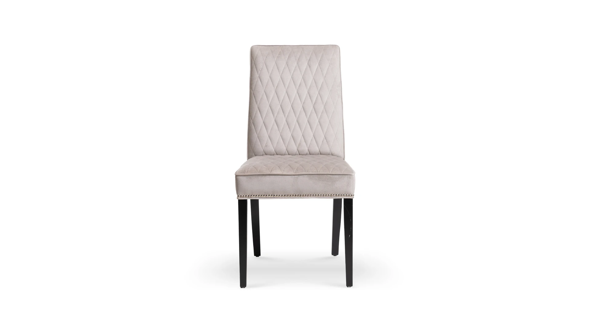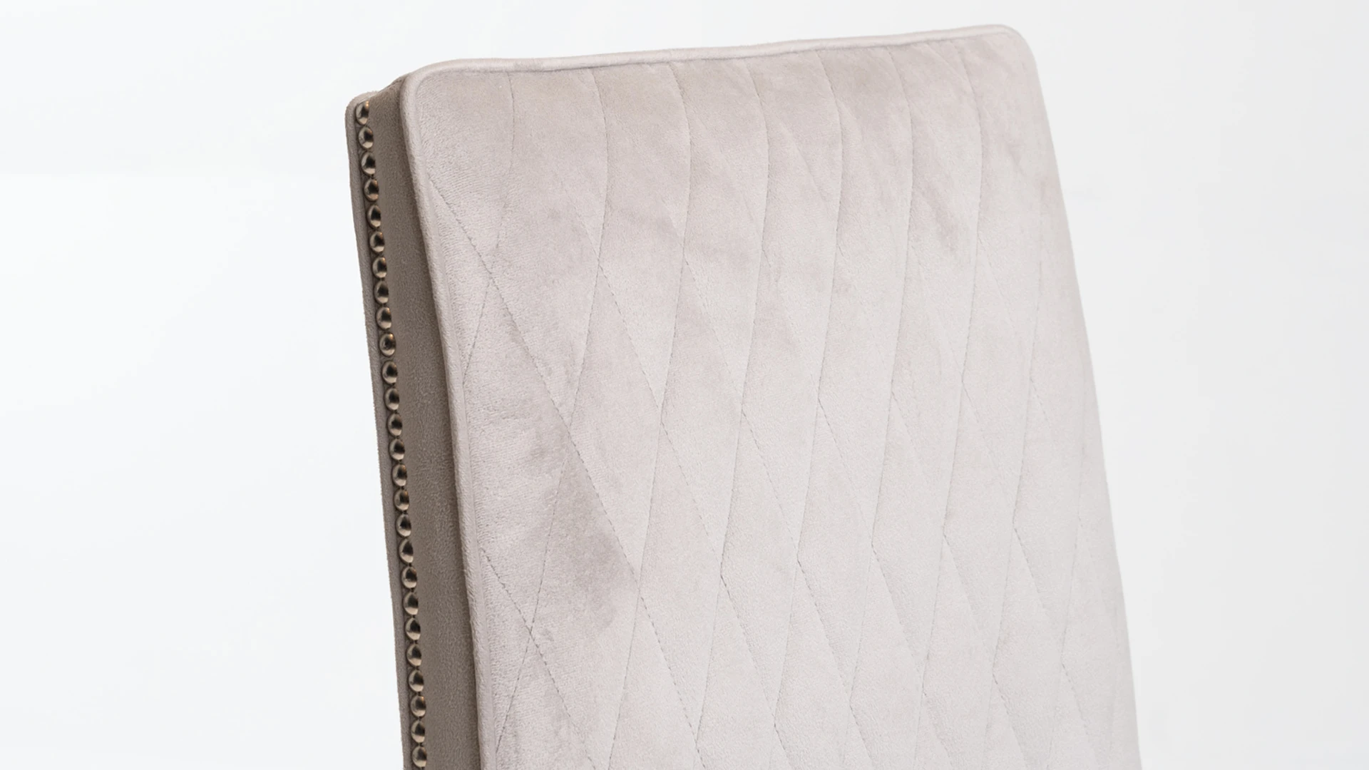 Estructura realizada en madera de guindo, con asiento y respaldo tapizados en pana Porche Slate, con trabajo de costura matelasseada cromado que aporta textura y profundidad visual. Una pieza de fuerte presencia, ideal para comedores y espacios de carácter sofisticado.