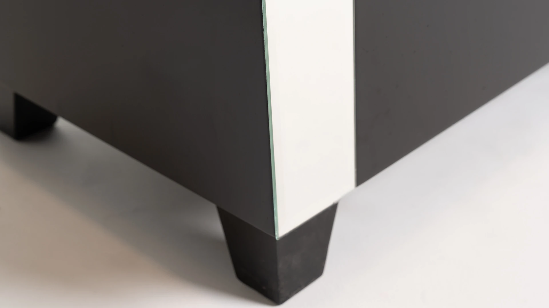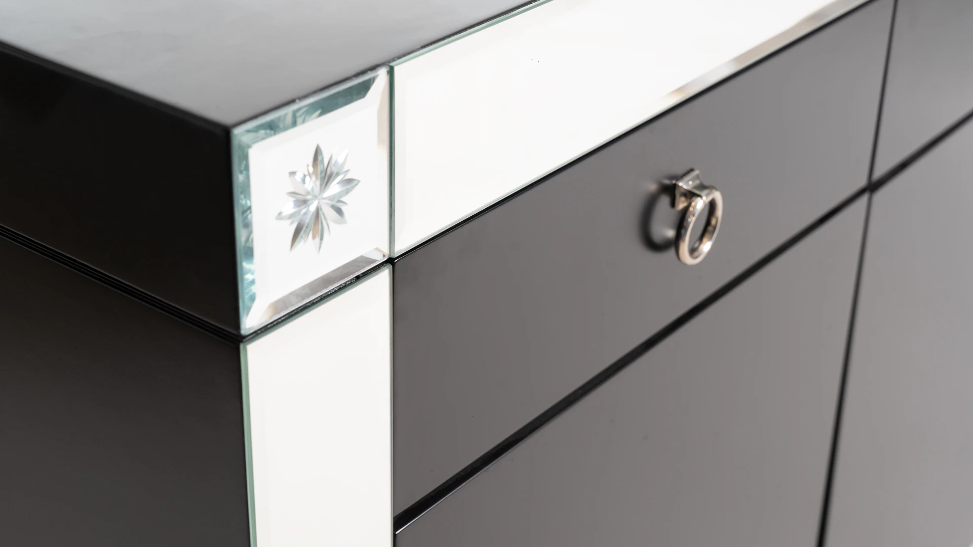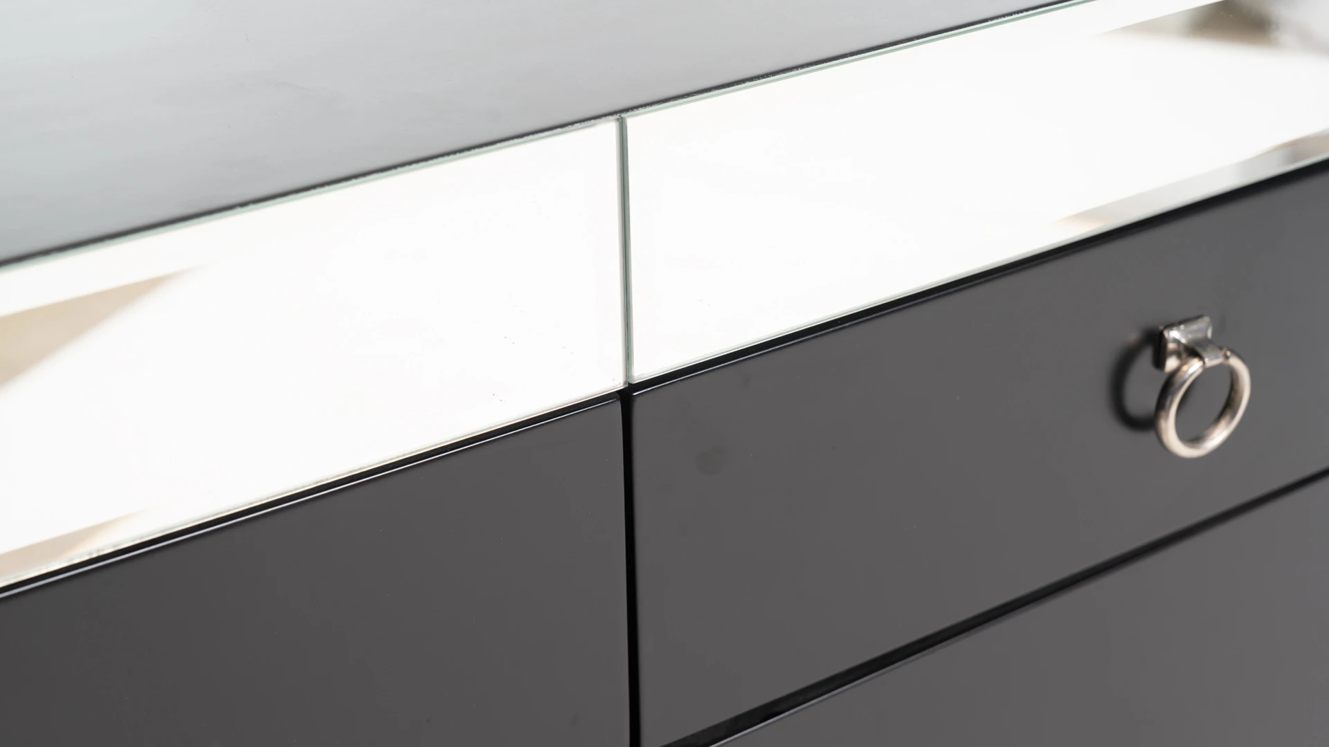 Mueble de guardado realizado en madera, con terminación en pintura poliuretánica negro semimate. Presenta puertas frontales con cajones superiores integrados y herrajes metálicos.