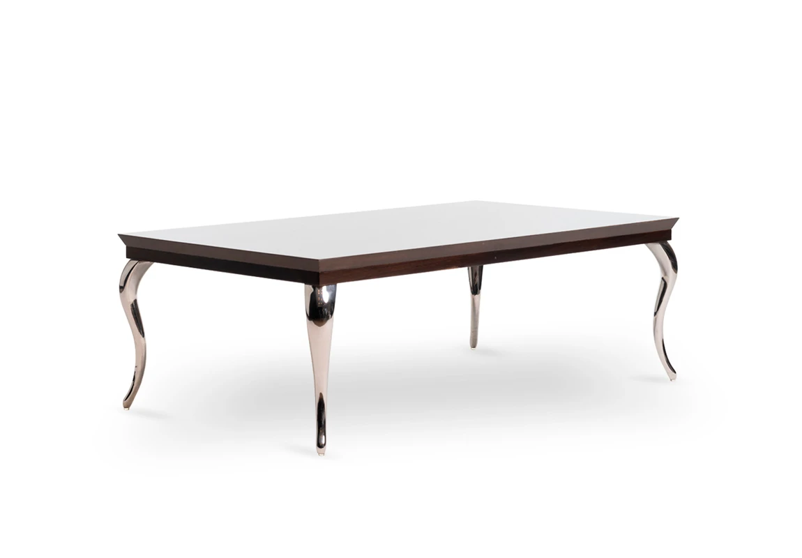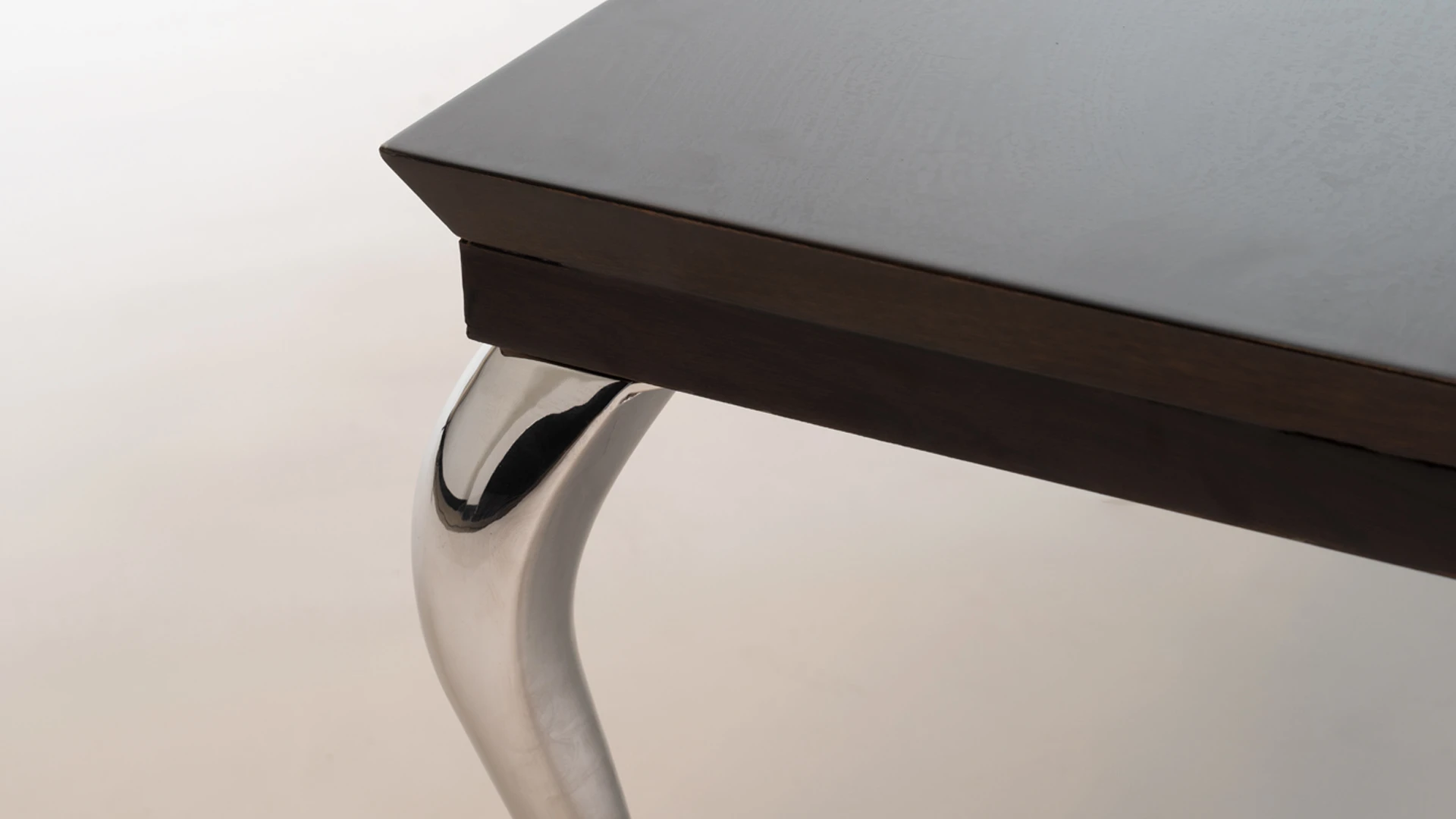 Tapa realizada en madera, con terminación color caoba. Estructura con patas metálicas cromadas de líneas curvas, que aportan estabilidad y un perfil elegante.