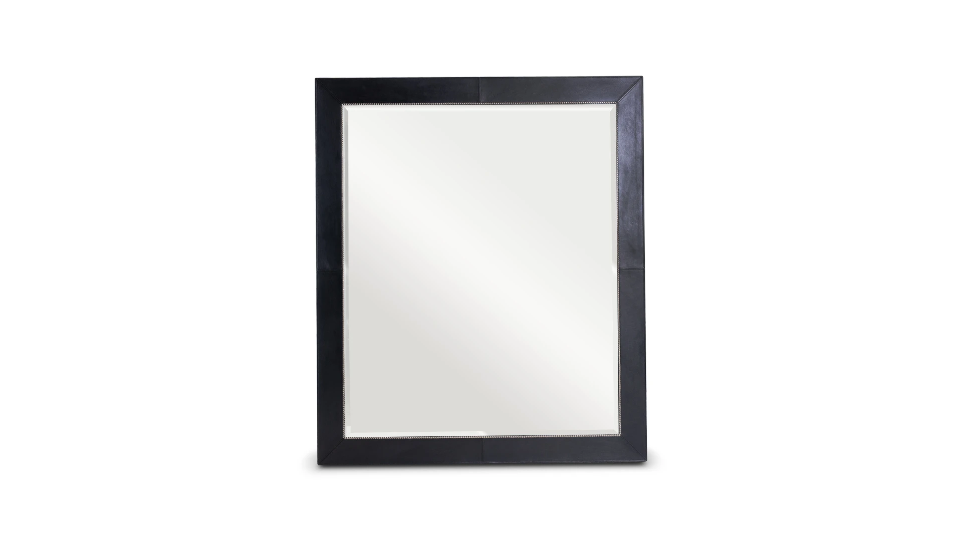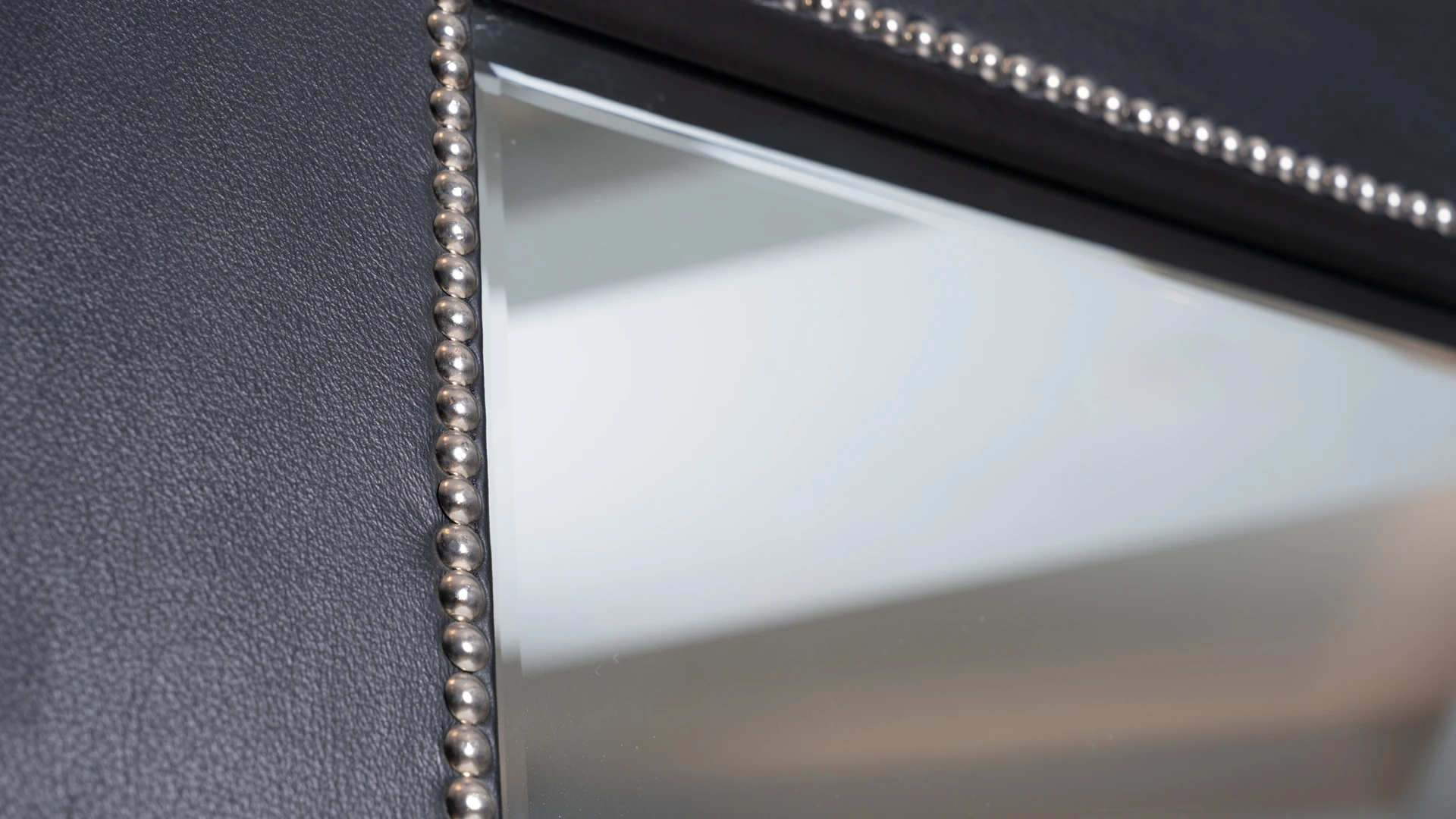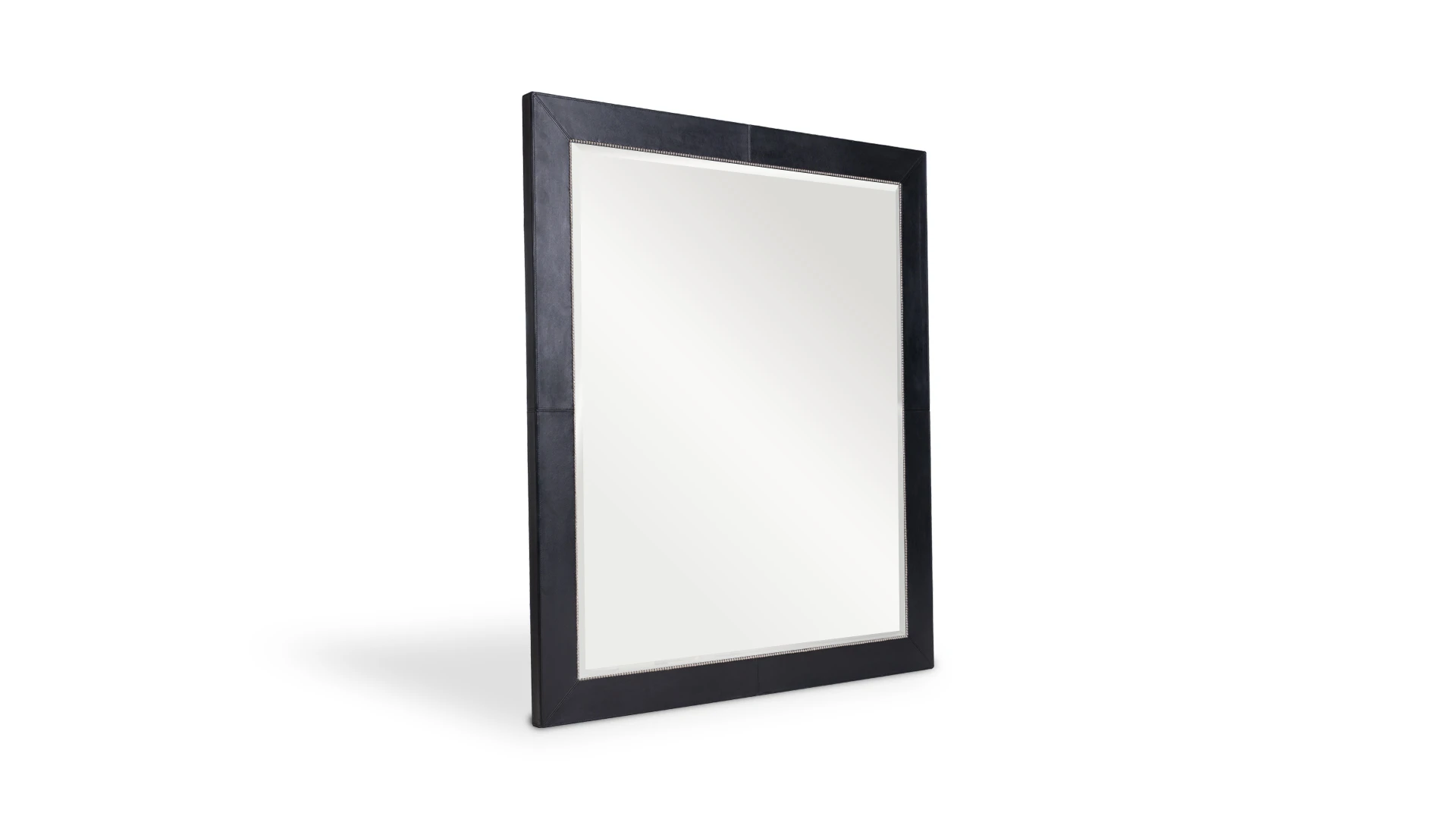 Marco de espejo Minary. Estructura realizada en madera, revestida en cuero, con terminación artesanal. Presenta un brode de tachas perimetral que aporta definición y contraste.