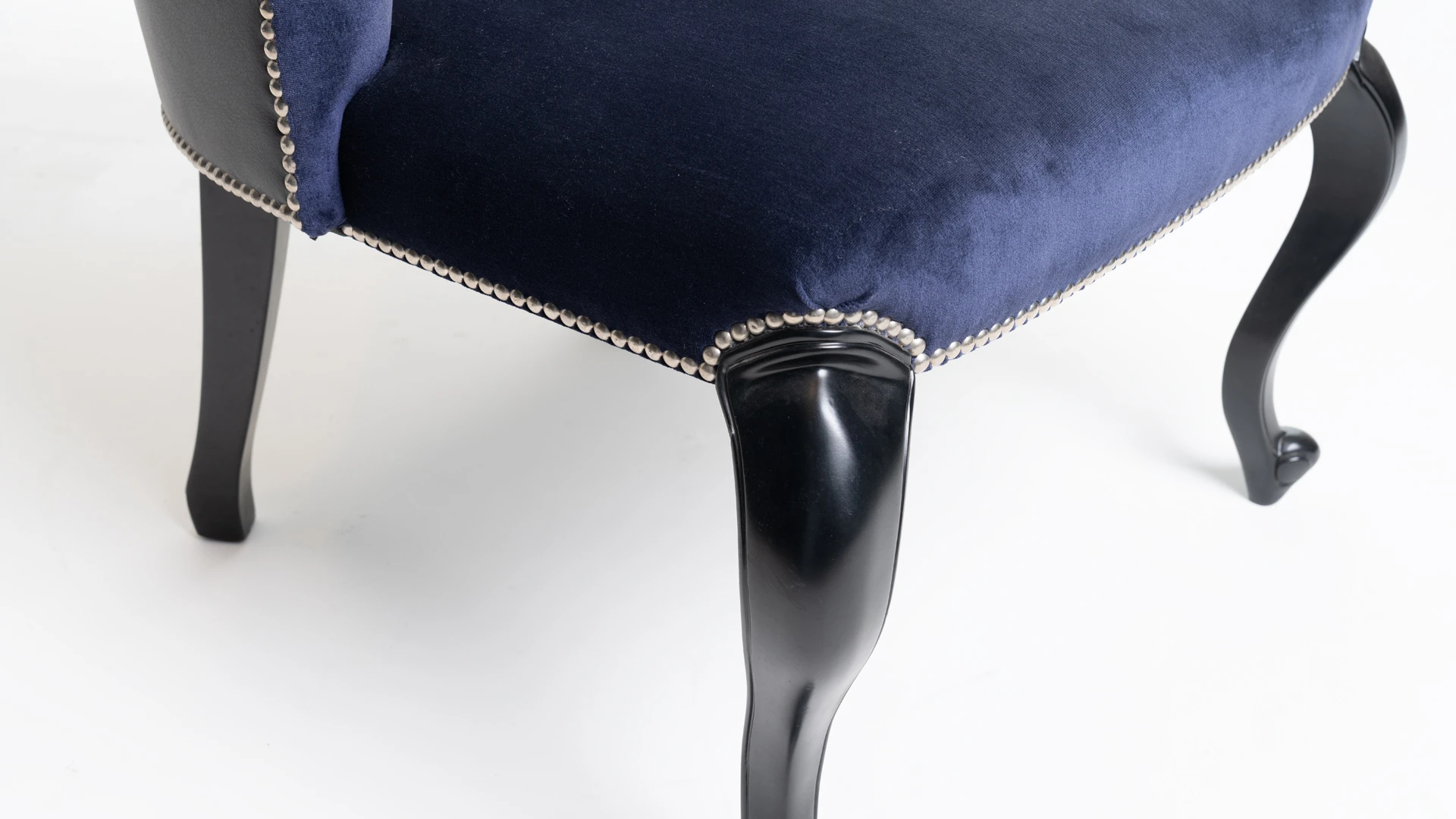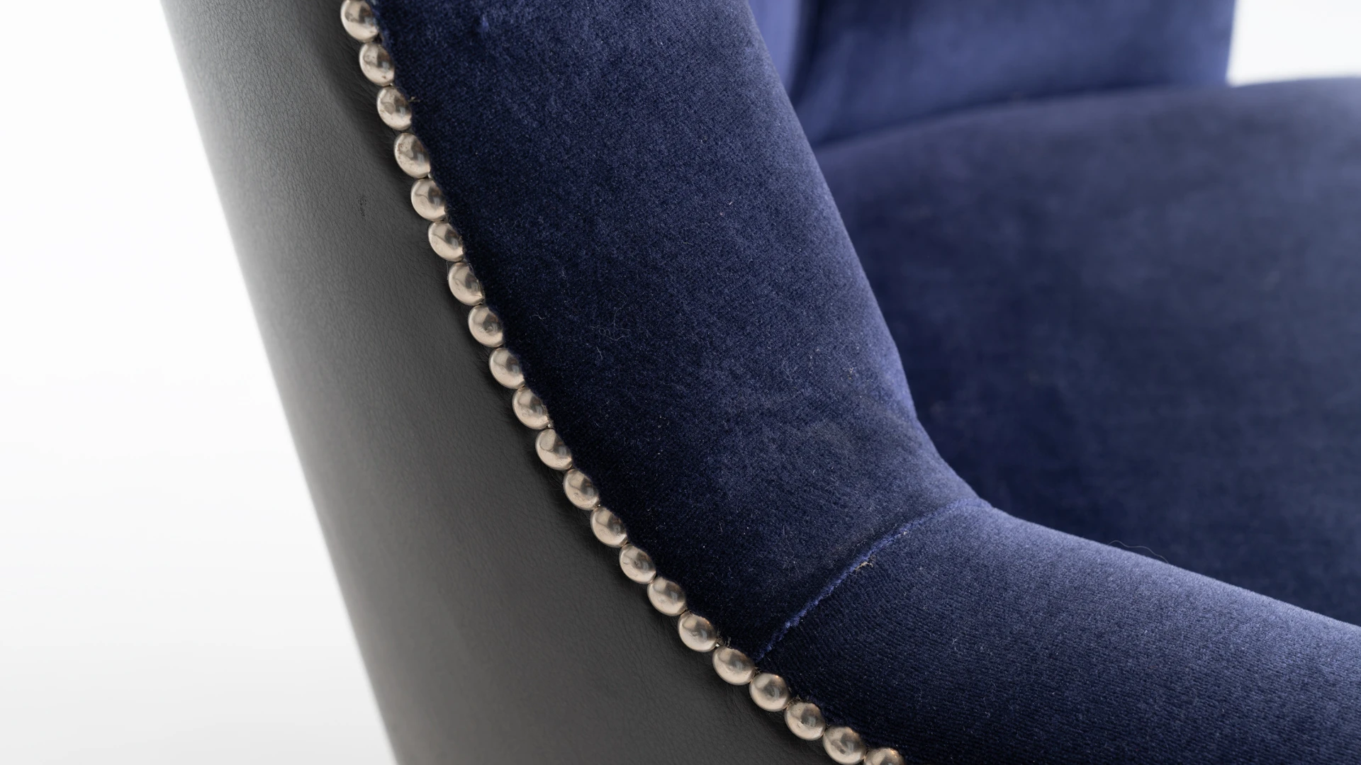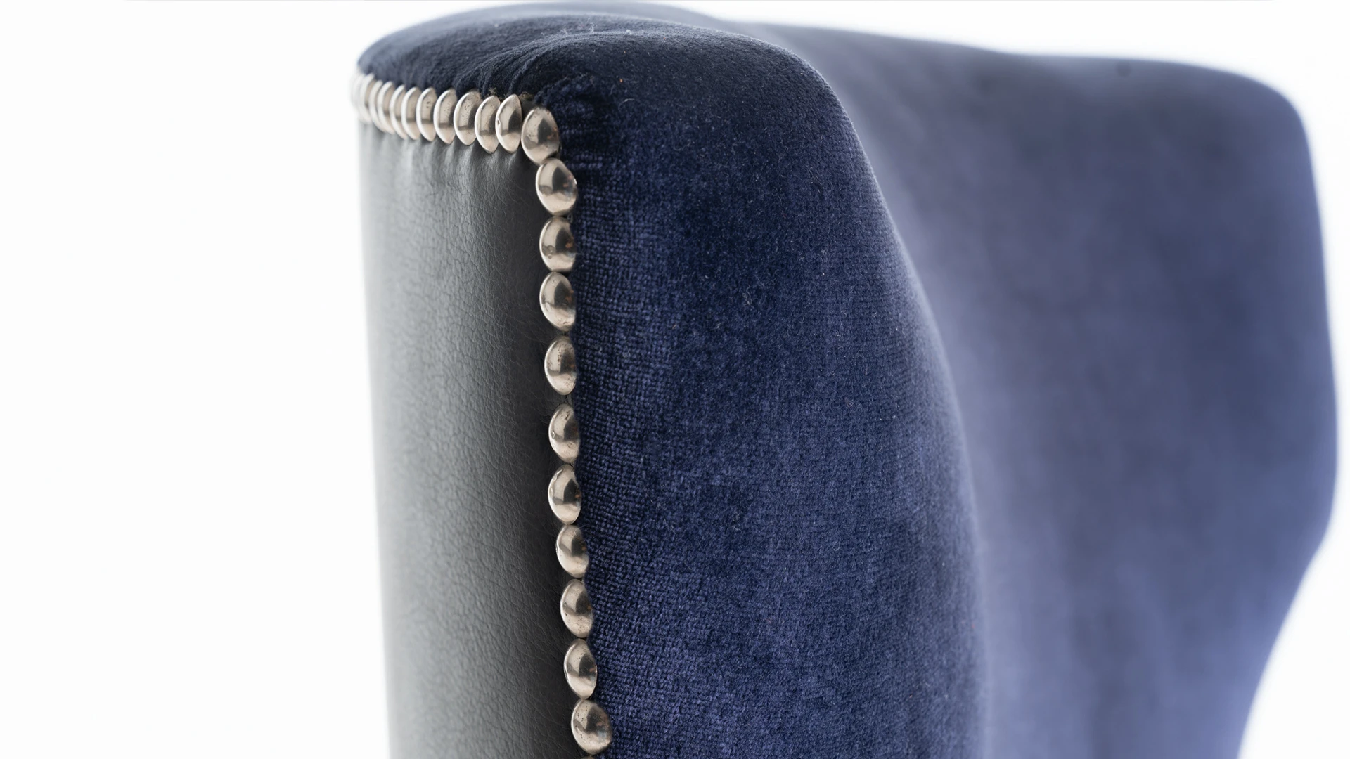 Estructura de madera, con tapizado combinado: parte delantera en pana azul y parte trasera en cuero negro. Presenta detalle de tachas metálicas perimetrales y patas de madera con terminación oscura, que refuerzan su estética clásica y elegante.