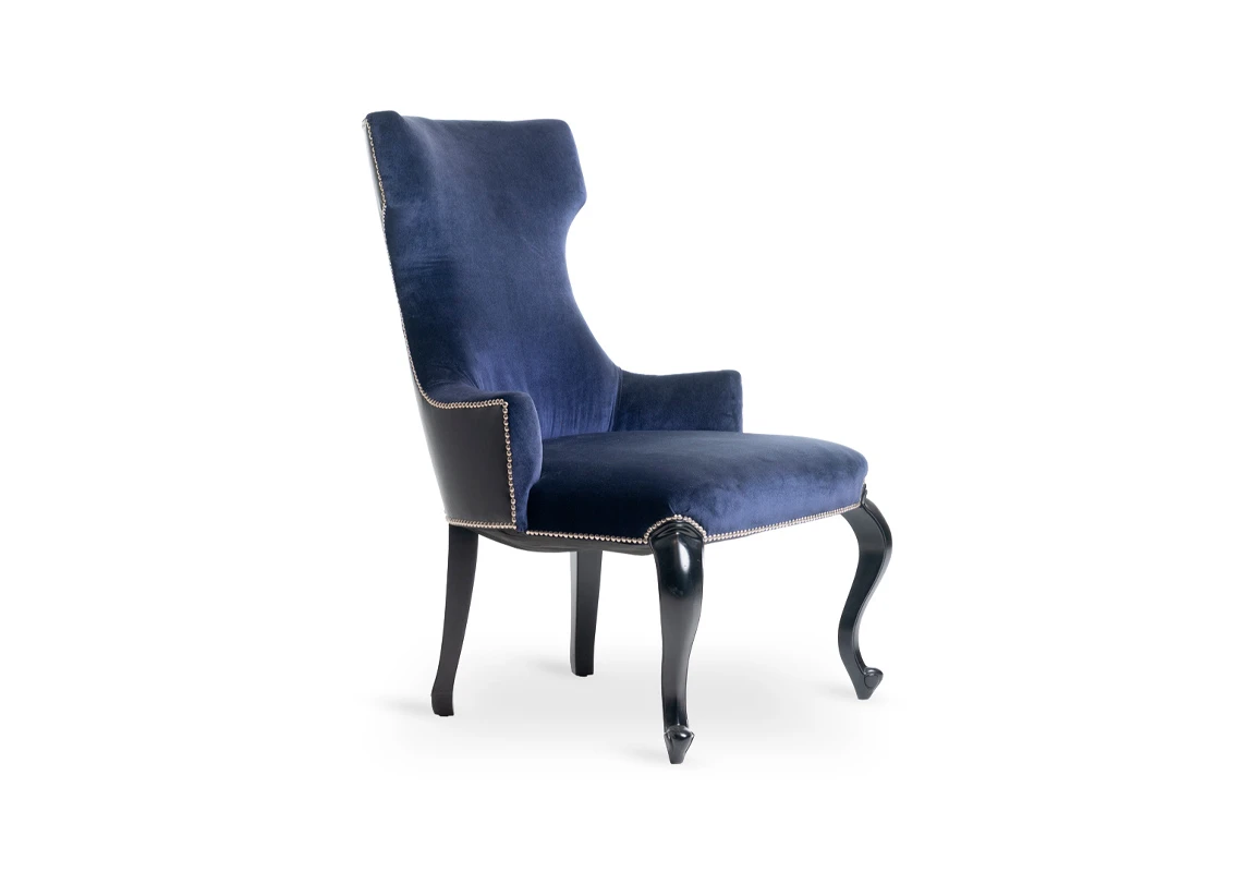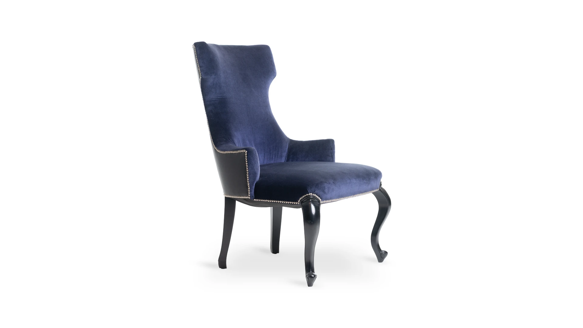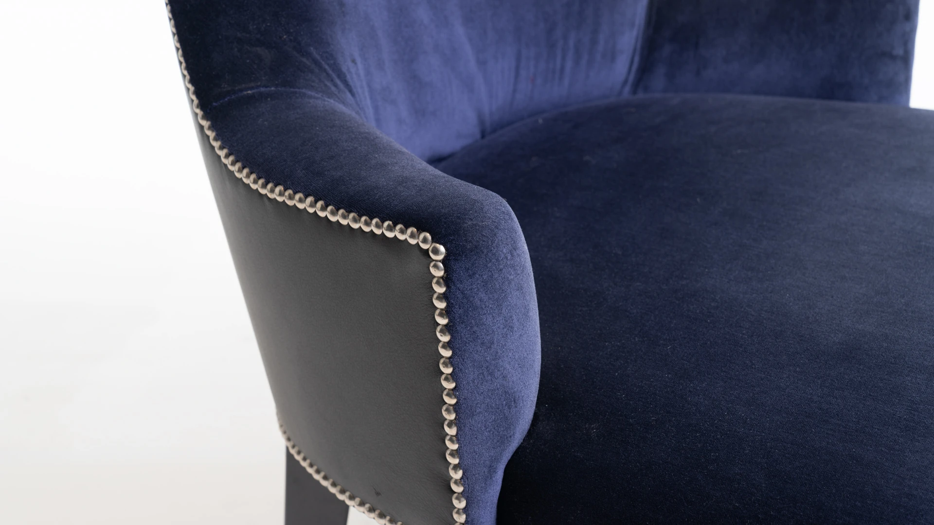 Estructura de madera, con tapizado combinado: parte delantera en pana azul y parte trasera en cuero negro. Presenta detalle de tachas metálicas perimetrales y patas de madera con terminación oscura, que refuerzan su estética clásica y elegante.
