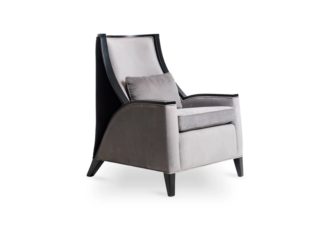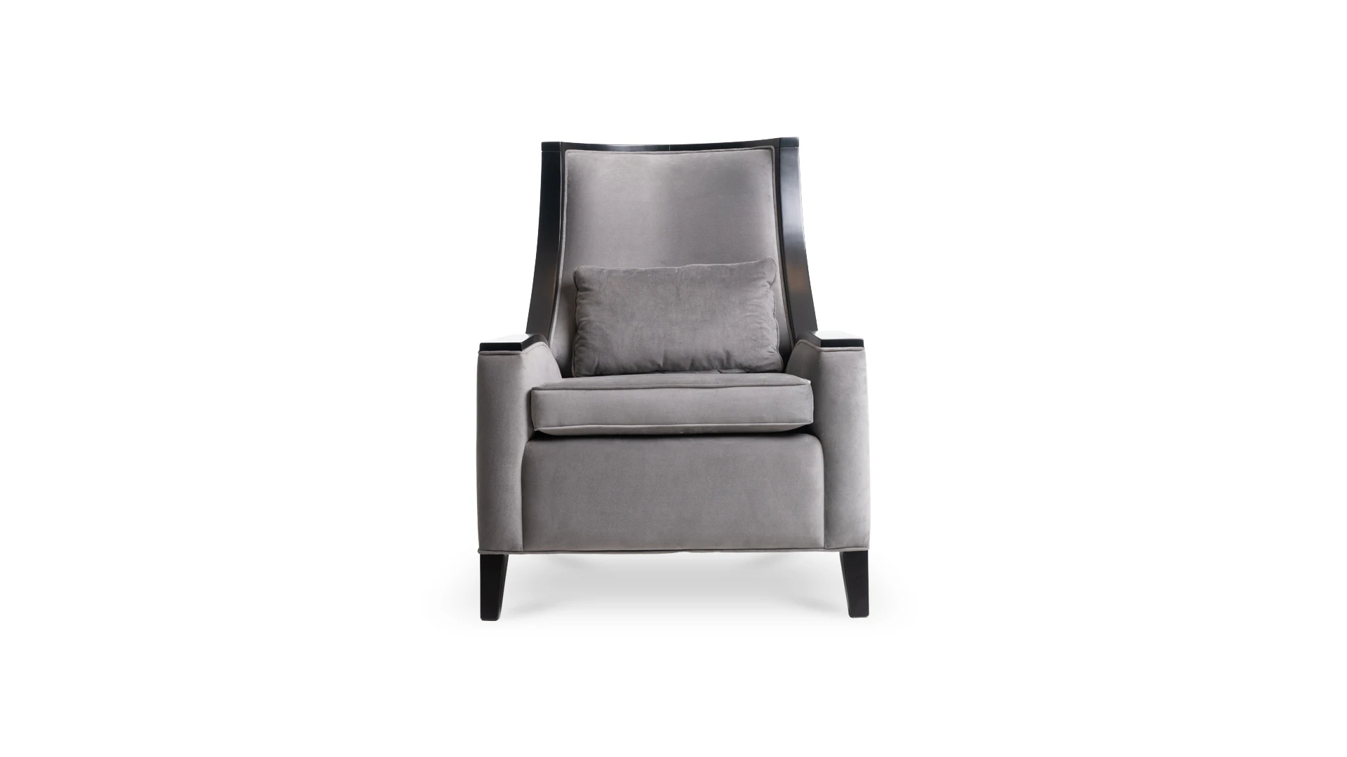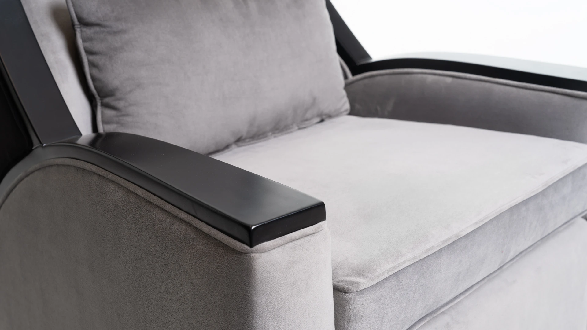 Estructura de madera con tapizado en pana, combinado en pana gris en la parte frontal y pana negra en laterales y respaldo. Incluye almohadón suelto para mayor confort y apoyabrazos con detalle superior laqueado. Patas de madera con terminación oscura.