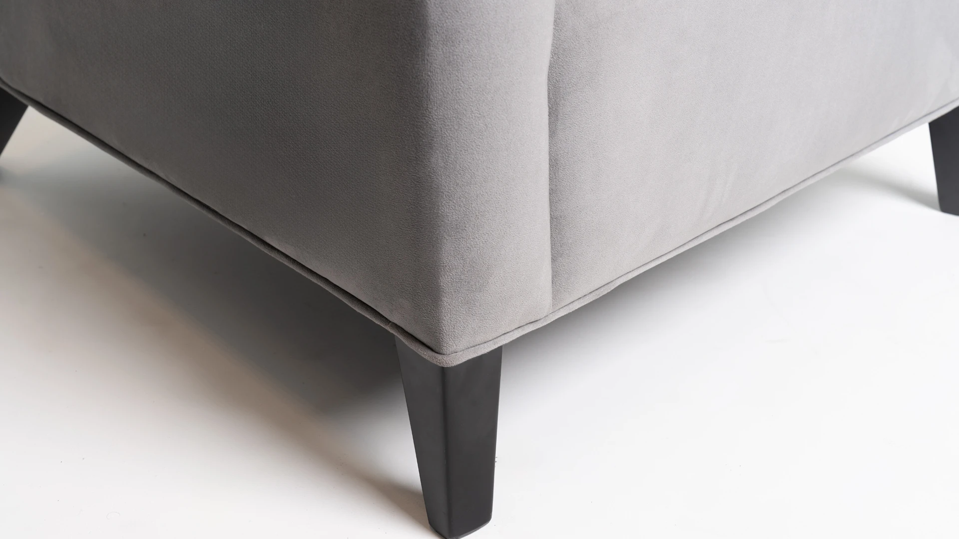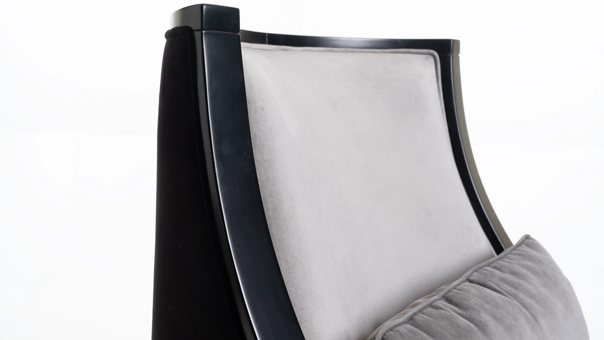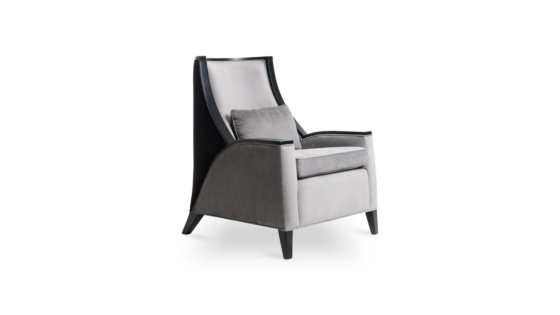 Estructura de madera con tapizado en pana, combinado en pana gris en la parte frontal y pana negra en laterales y respaldo. Incluye almohadón suelto para mayor confort y apoyabrazos con detalle superior laqueado. Patas de madera con terminación oscura.