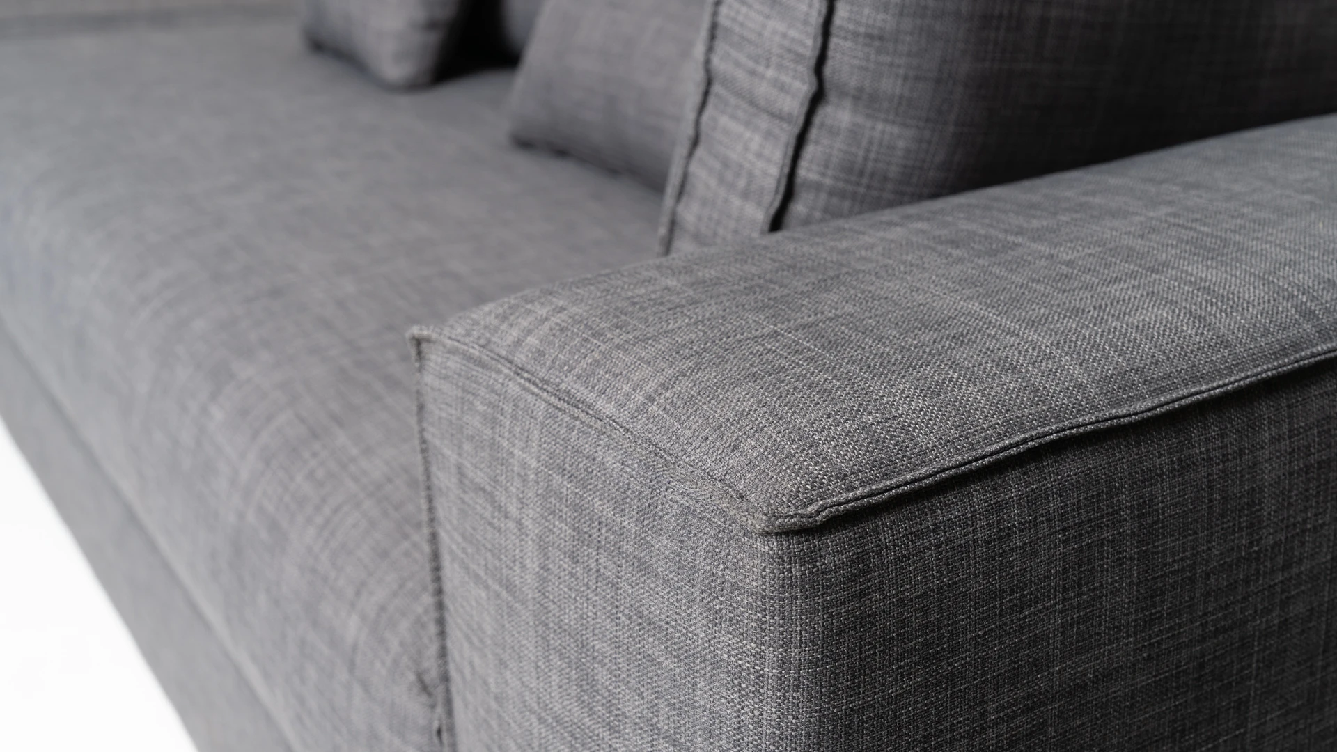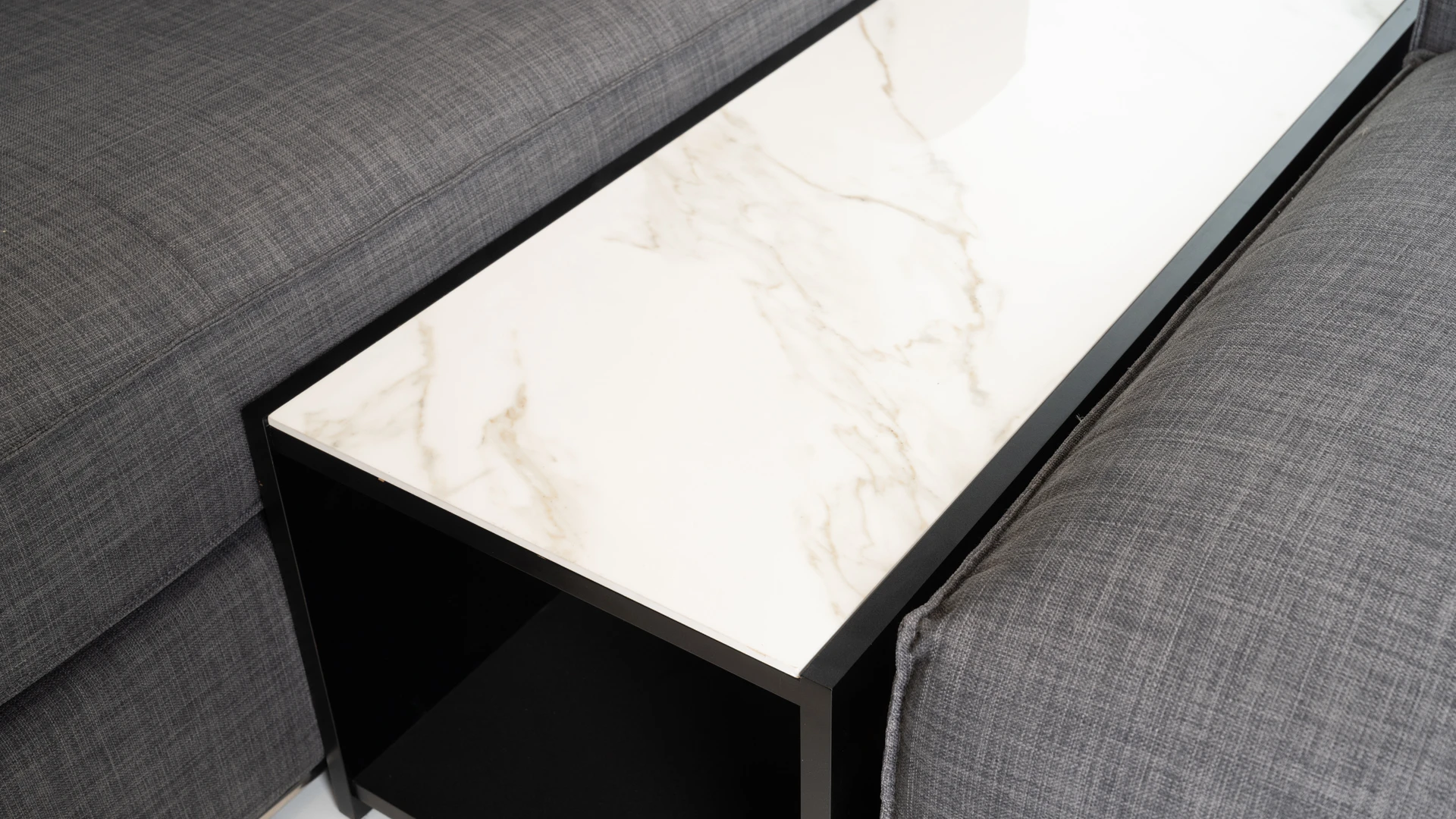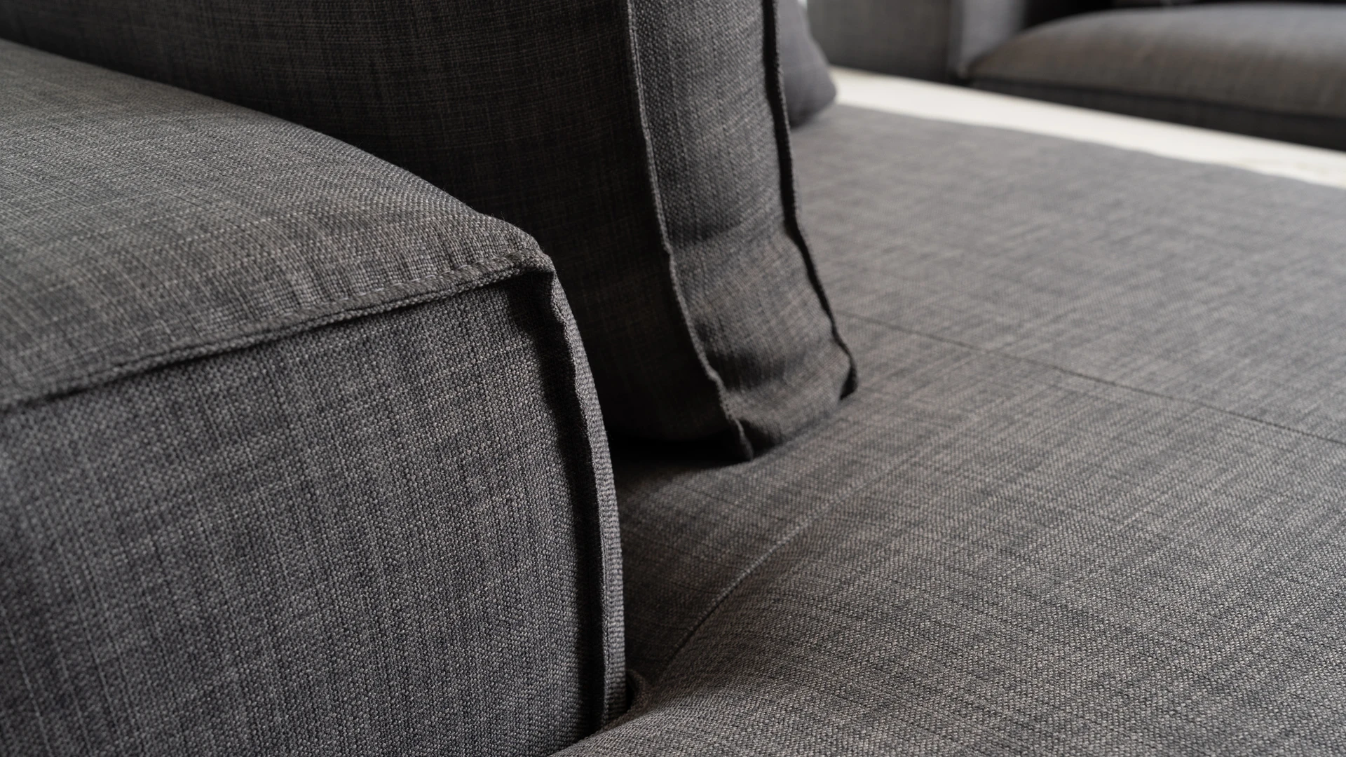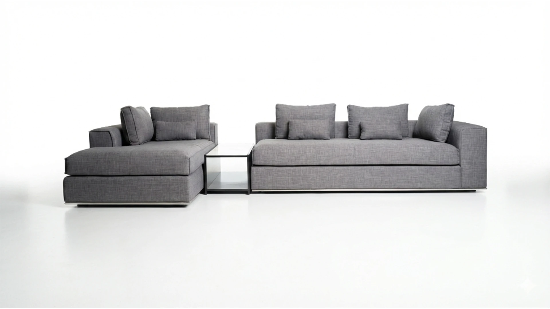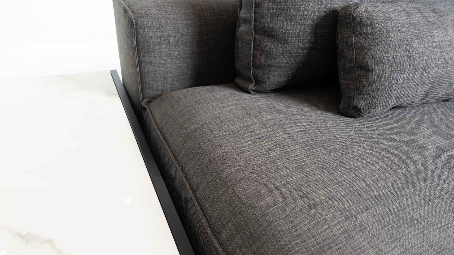 Sofá esquinero Alaska. Fabricado con base metálica y un tapizado en tela Emily Metal, además posee una mesa en madera con tapa en Dekton.