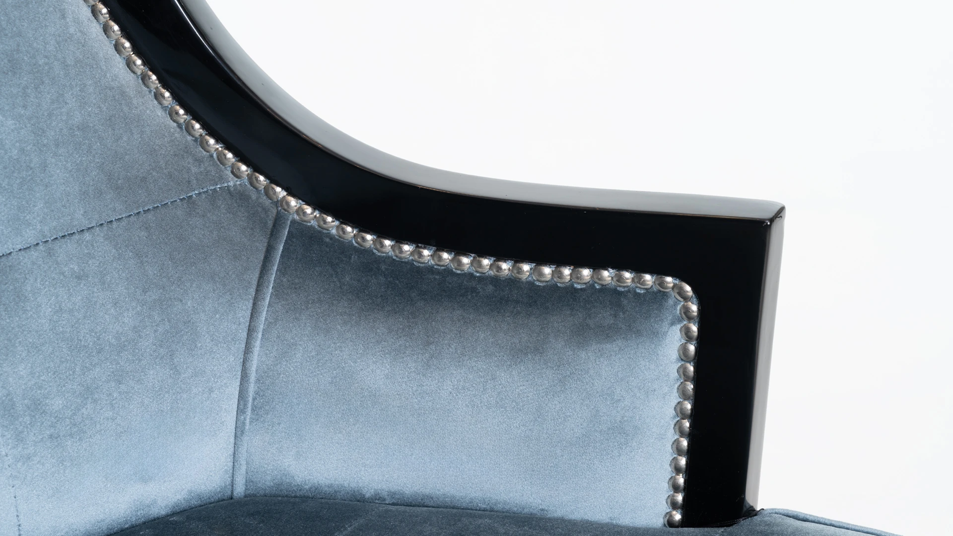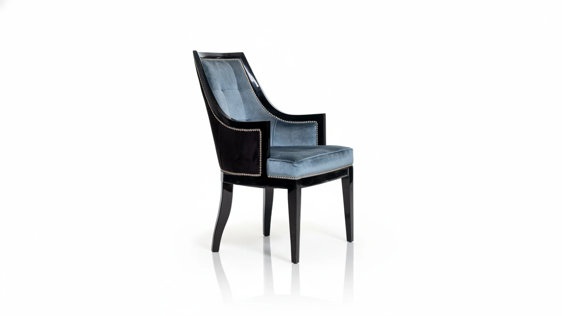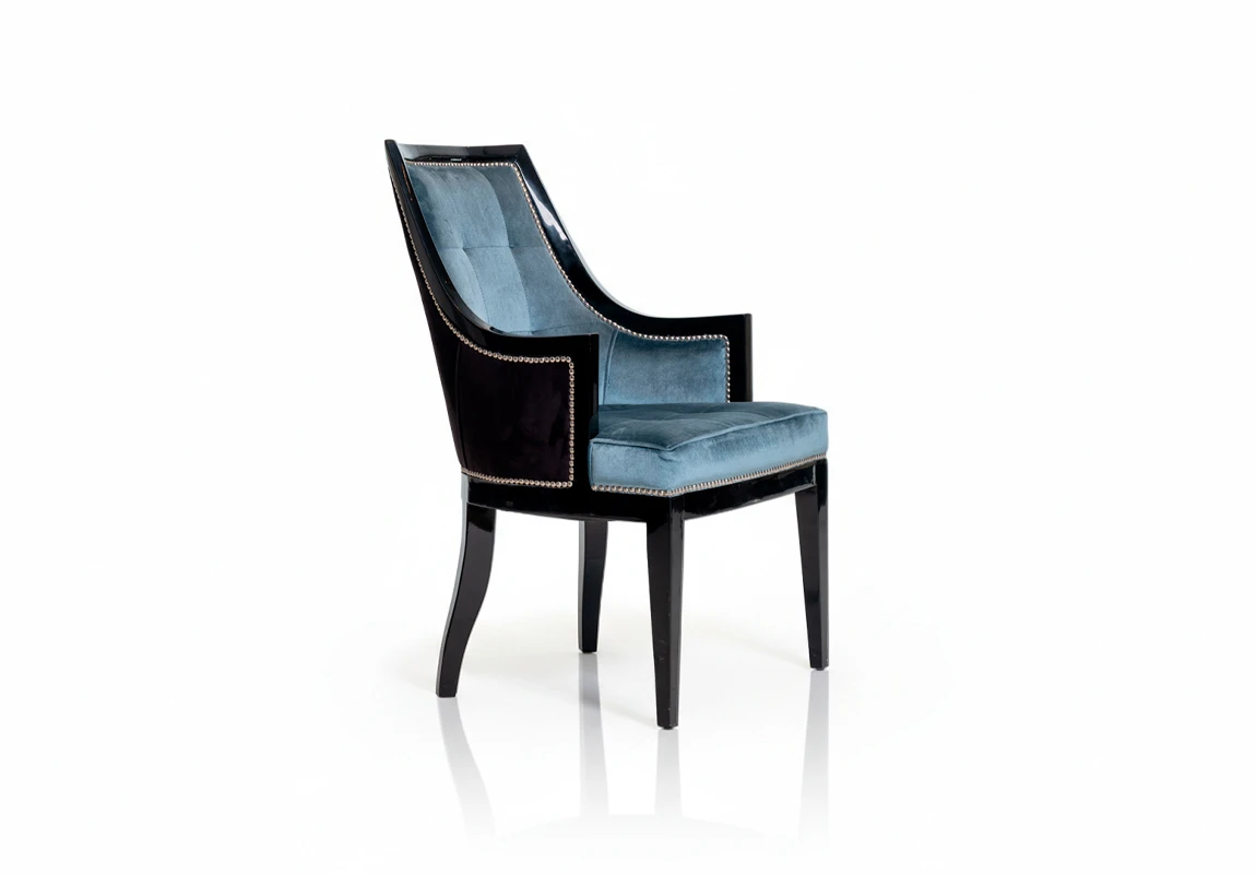 Estructura de madera maciza con terminación en lustre negro brillante. Tapizado en pana color celeste, con detalle de tachas metálicas perimetrales que realzan su diseño. Respaldo ergonómico y asiento acolchado, ideal para comedores y espacios de reunión.