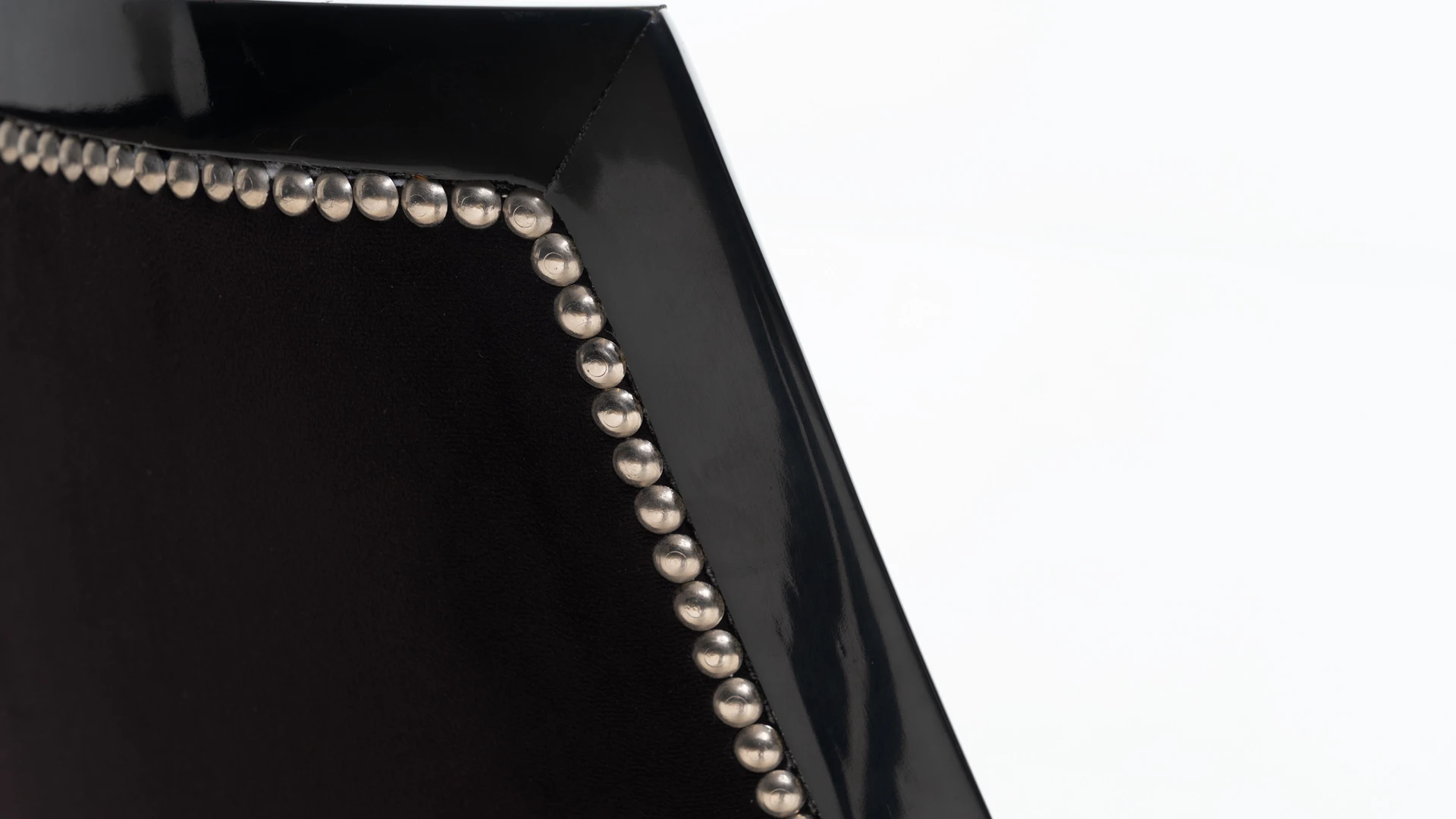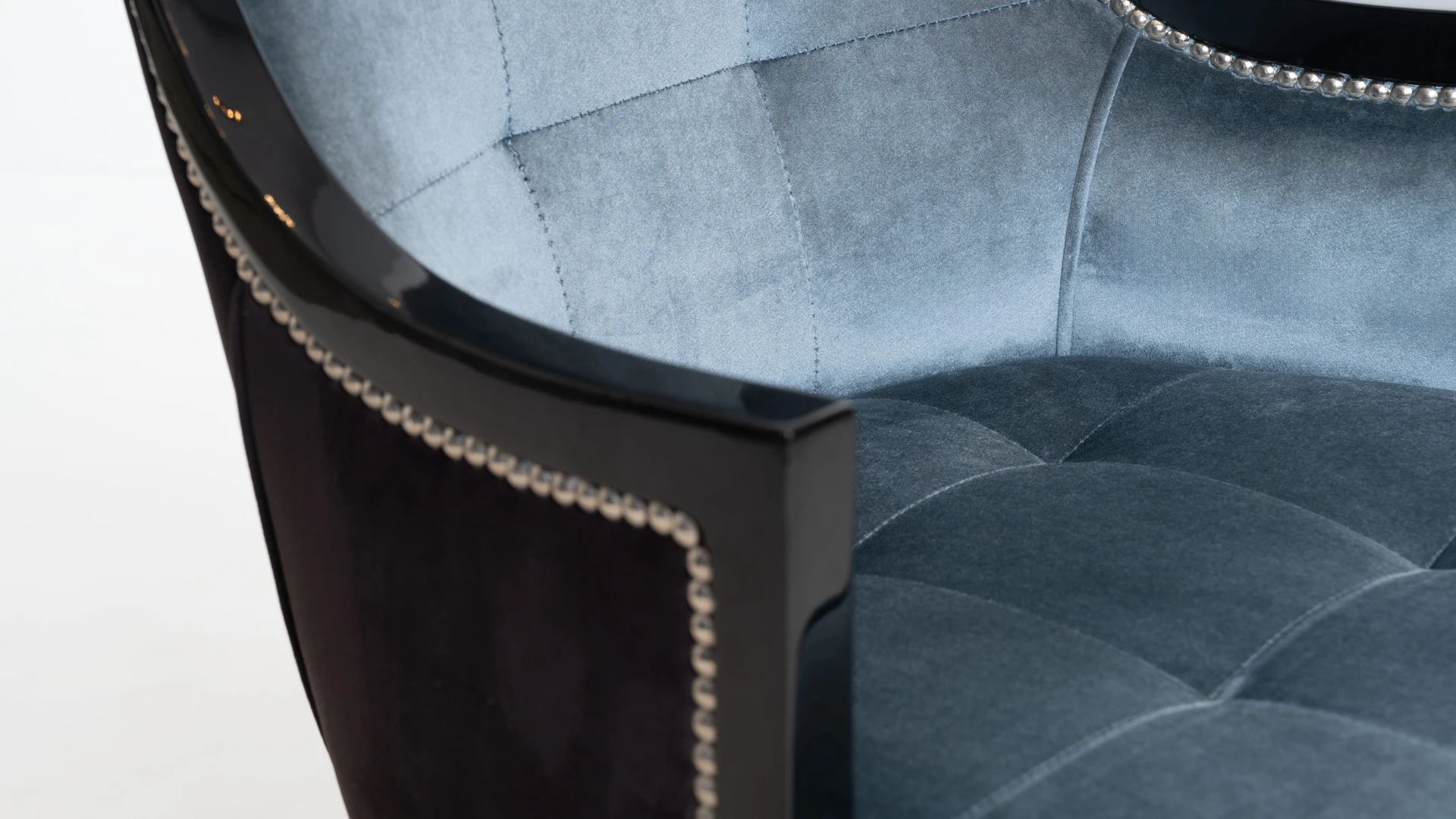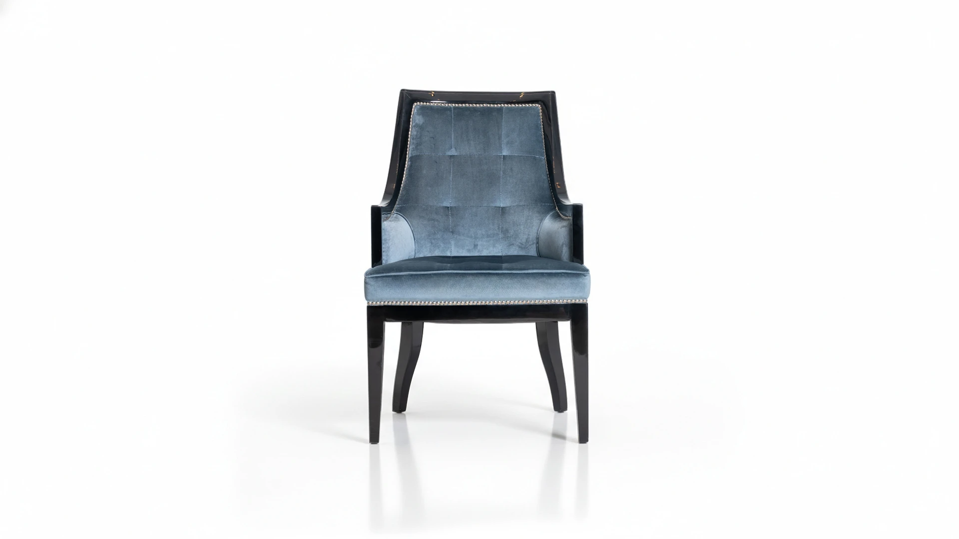 Estructura de madera maciza con terminación en lustre negro brillante. Tapizado en pana color celeste, con detalle de tachas metálicas perimetrales que realzan su diseño. Respaldo ergonómico y asiento acolchado, ideal para comedores y espacios de reunión.