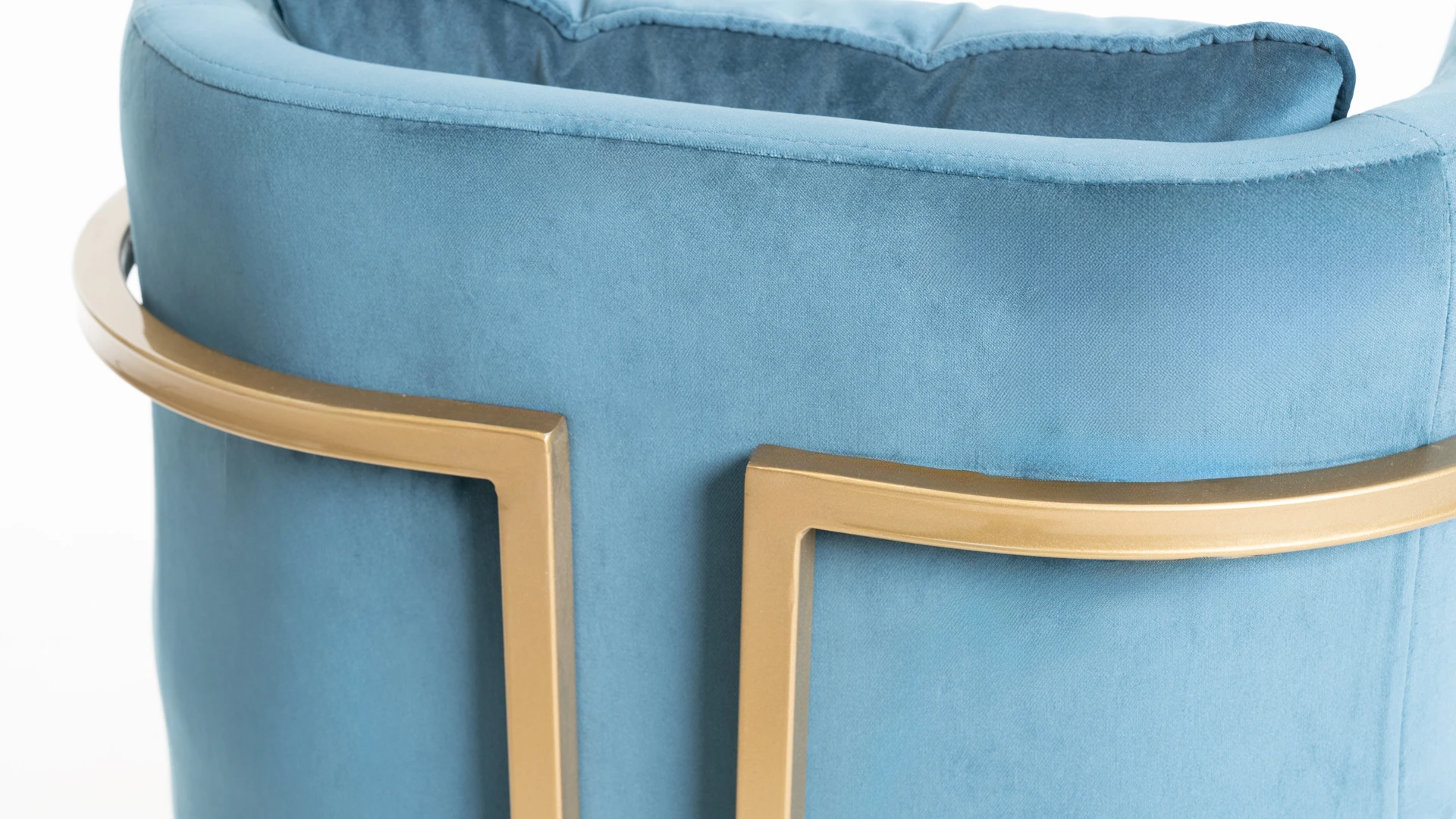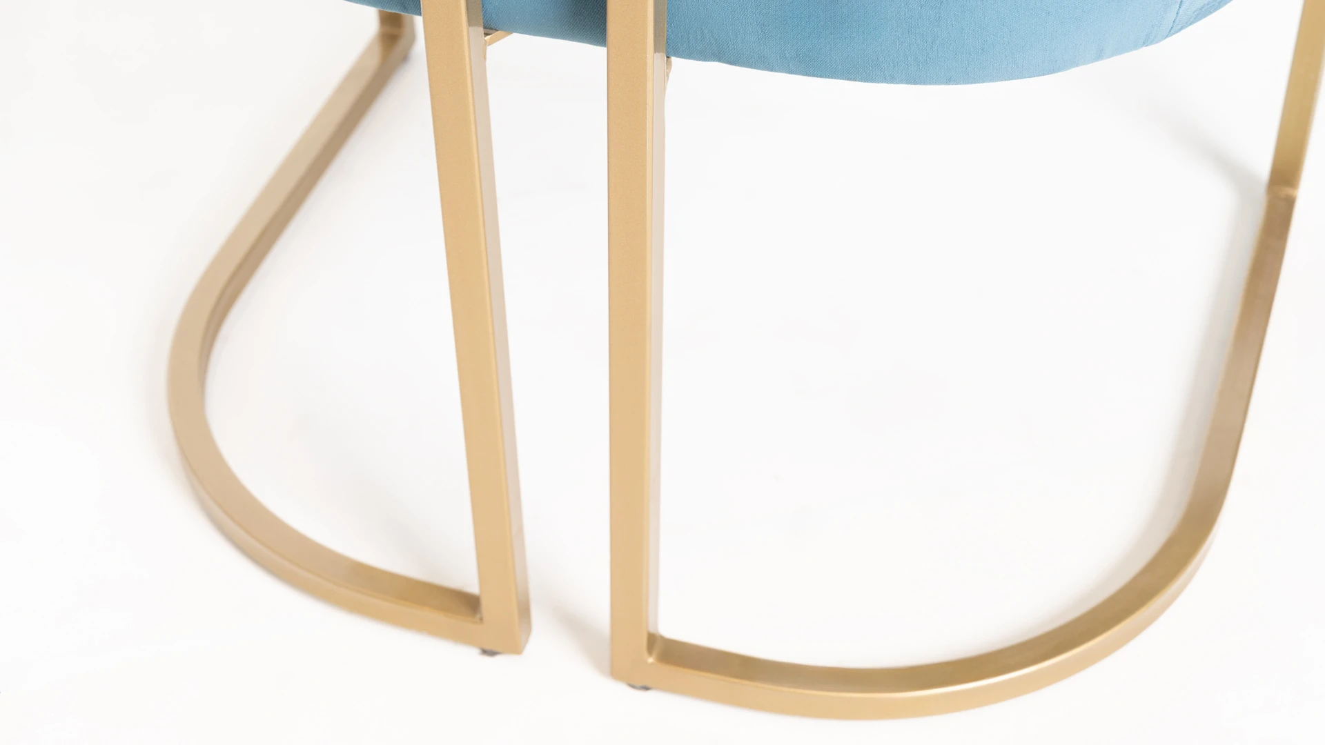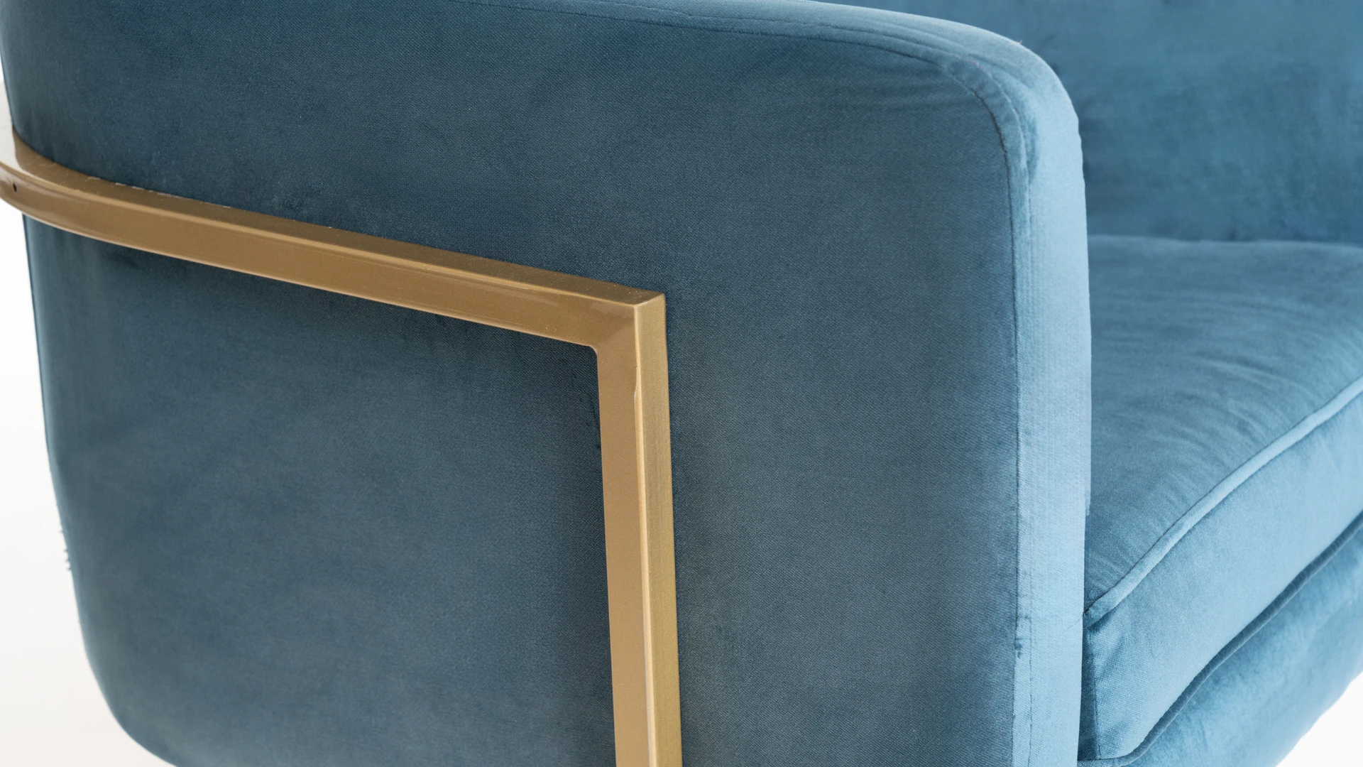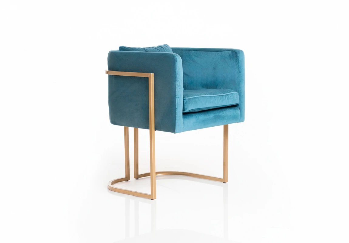Diseñado especialmente en color turquesa, combina una estructura dorada y curva, con un asiento ergonómico tapizado en pana (incluye riñoreo, misma terminación).