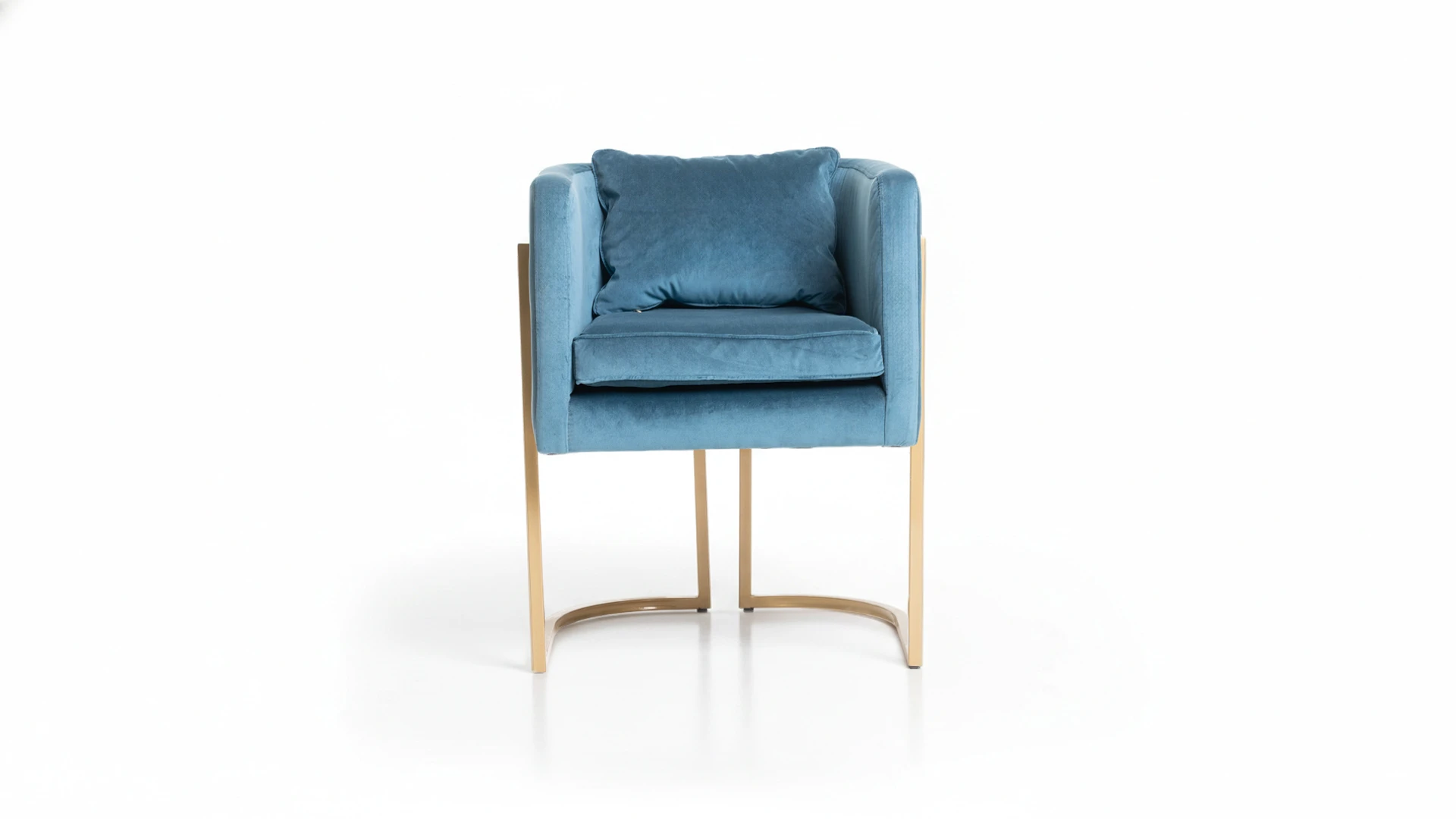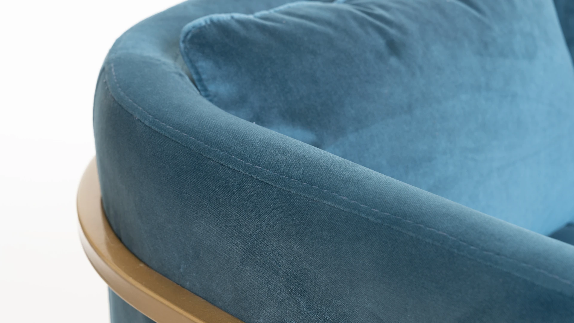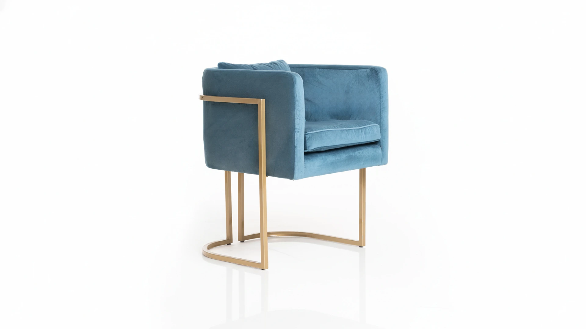 Diseñado especialmente en color turquesa, combina una estructura dorada y curva, con un asiento ergonómico tapizado en pana (incluye riñoreo, misma terminación).