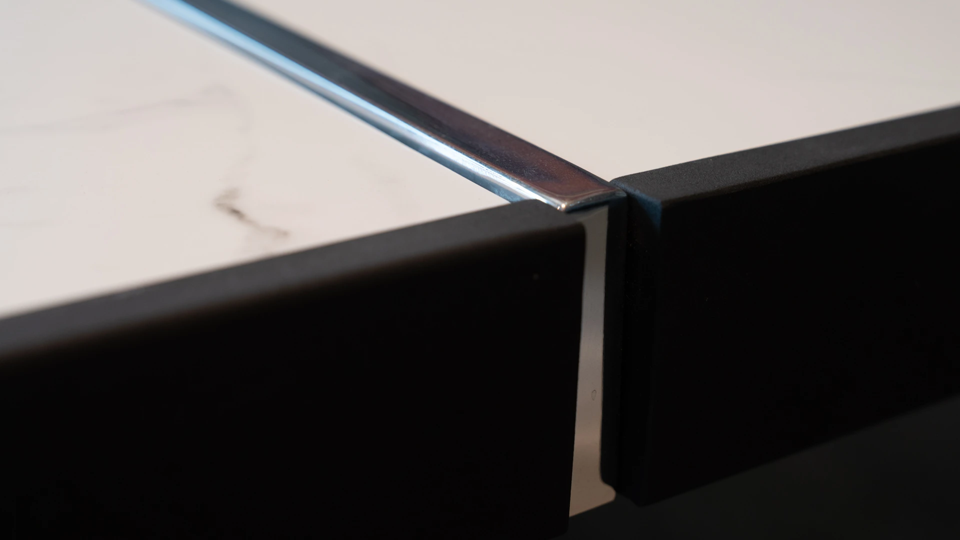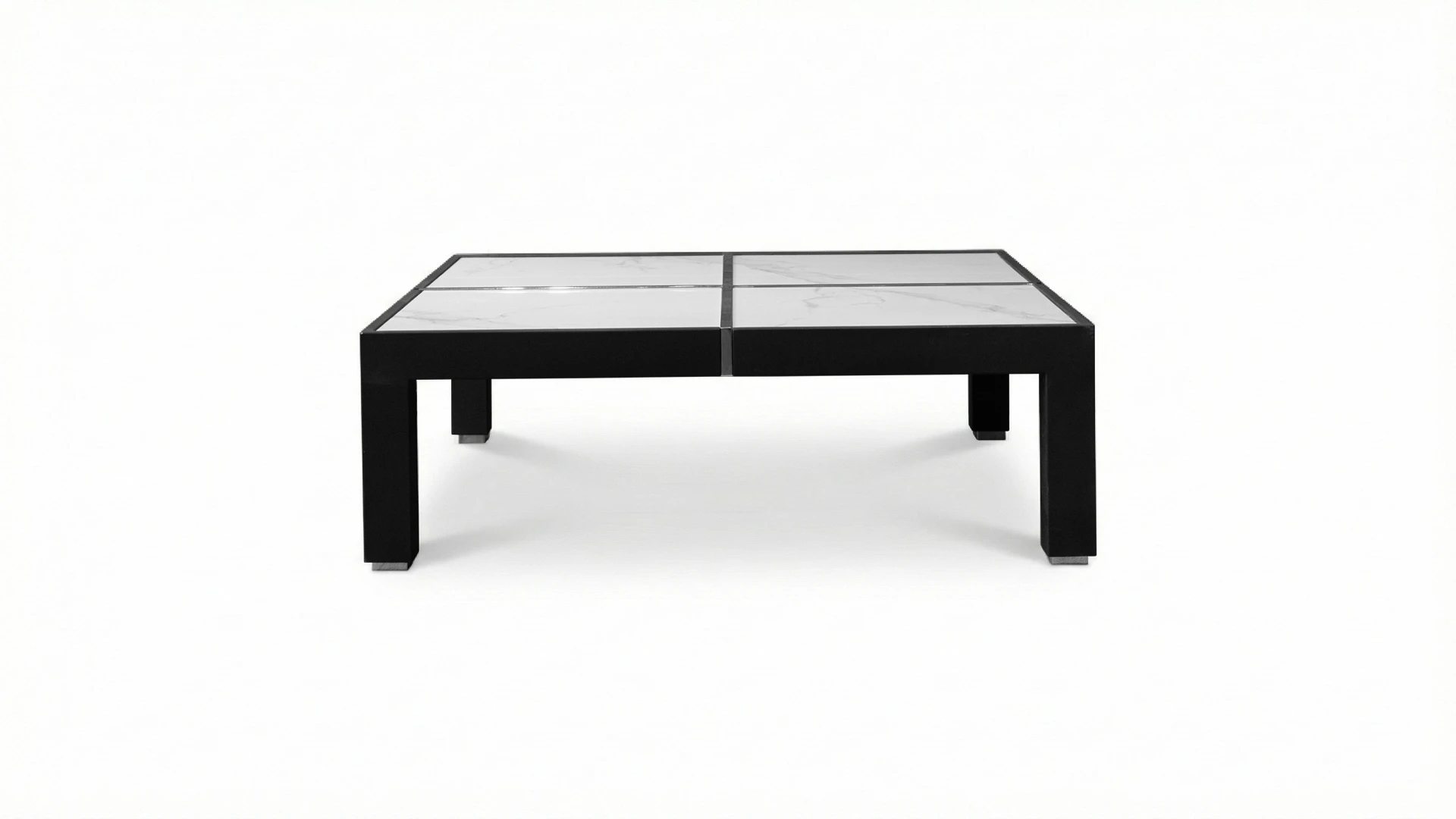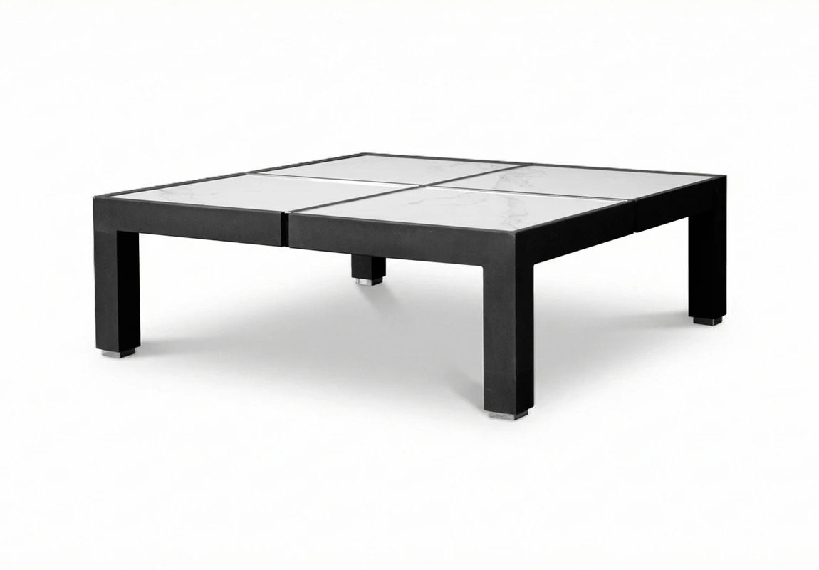 Mesa de centro de líneas rectas y diseño contemporáneo. Estructura fabricada en madera maciza con terminación laqueada en negro, de alta resistencia. Tapa compuesta por placas de Dekton Calacatta, material ultracompacto de gran durabilidad, resistente a rayaduras, manchas y altas temperaturas, con acabado símil mármol blanco veteado gris.