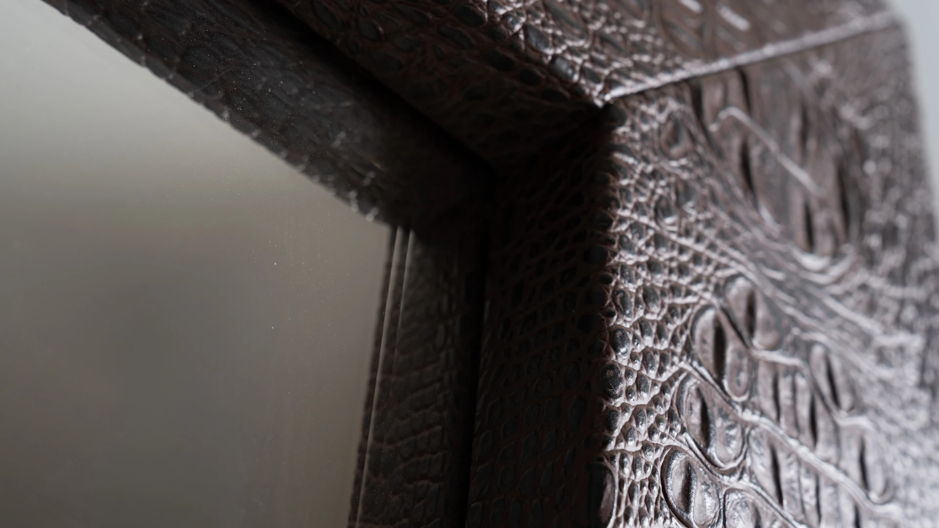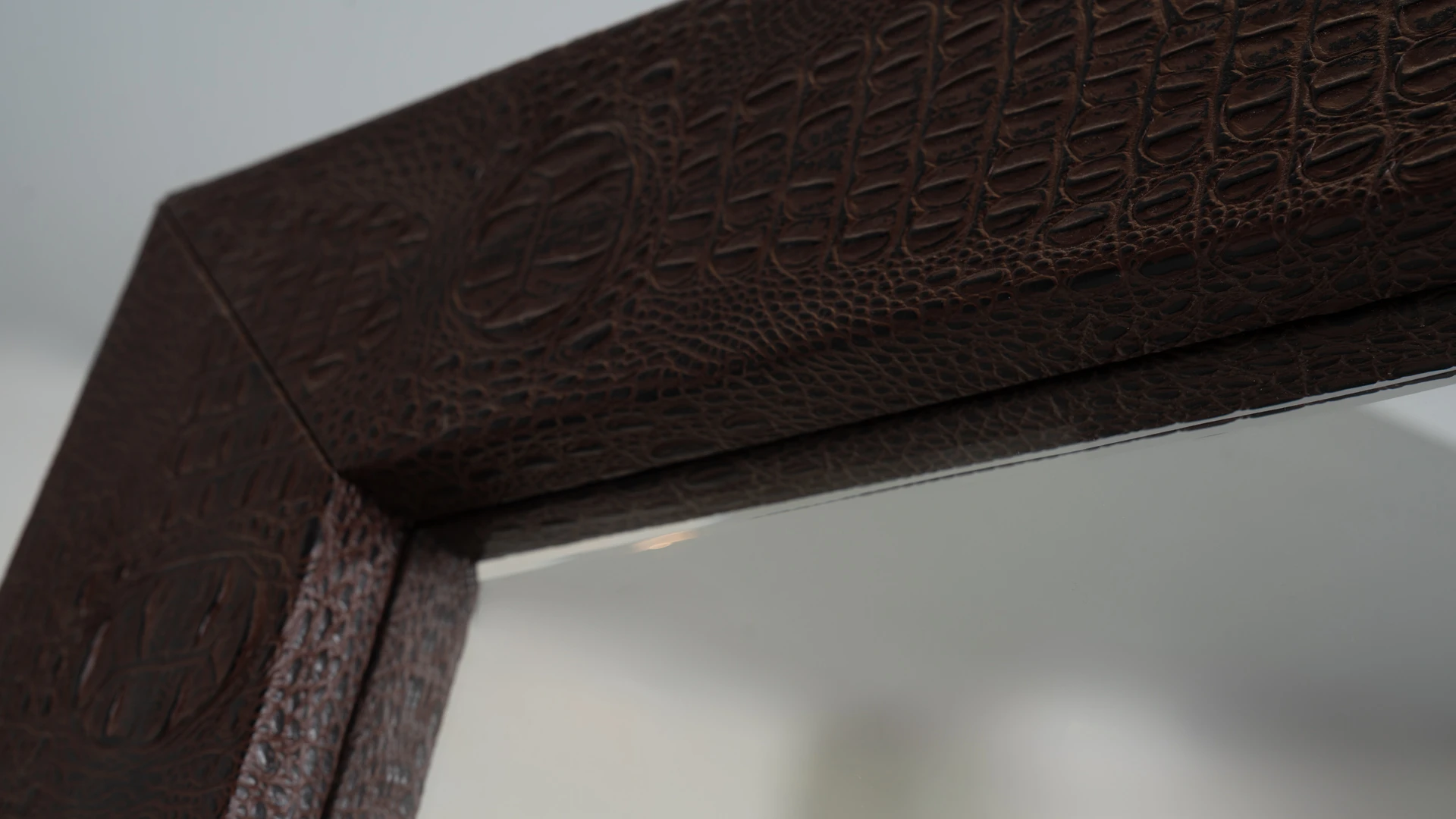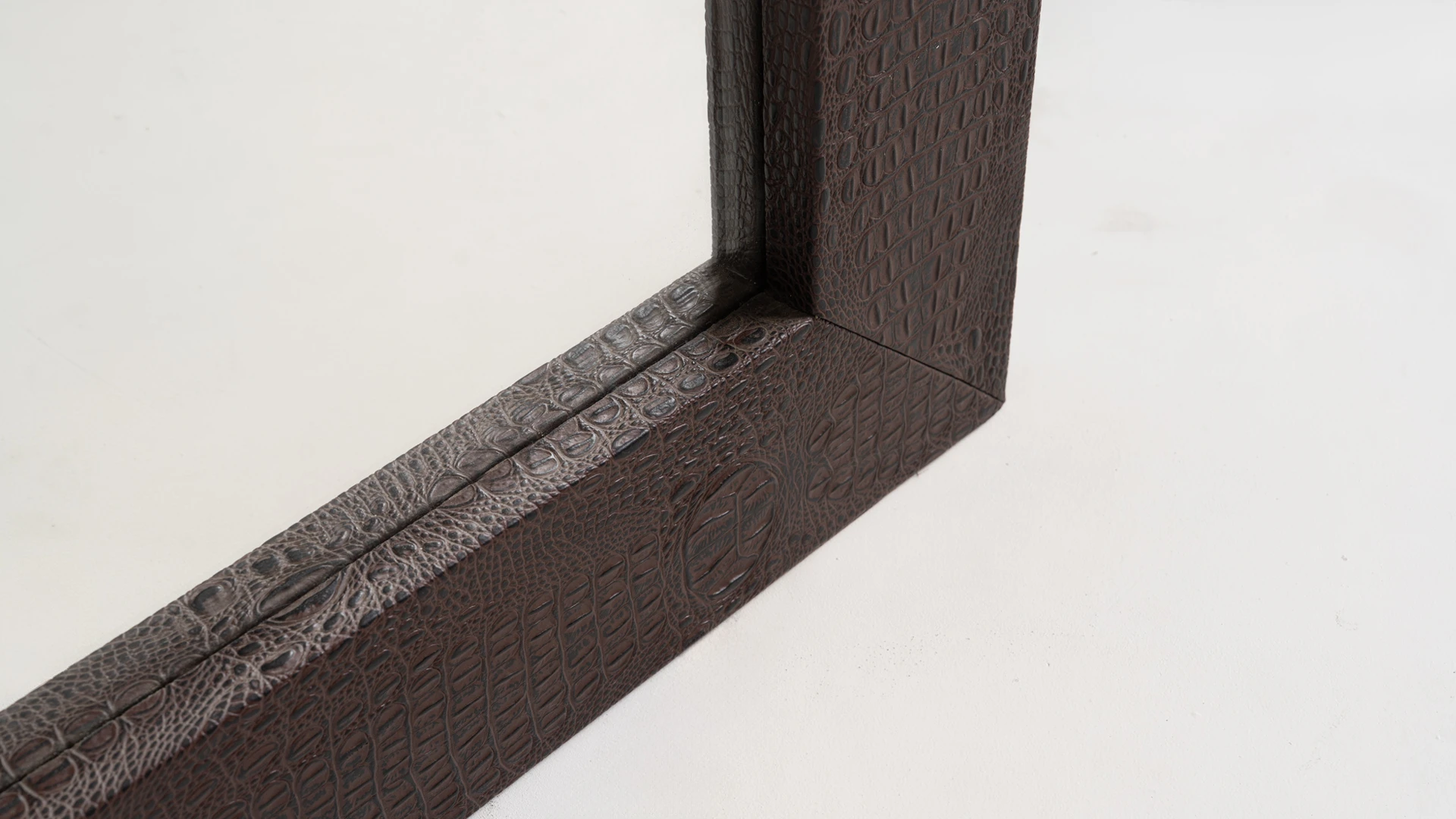 Marco de espejo Minary. Estructura realizada en madera, revestida en cuero crocco marrón, con terminación artesanal. Producto de edición limitada. Consultar stock disponible. Precio final con descuento, incluye IVA. Para customizaciones que requieran un nuevo proceso de fabricación, se realizará una cotización especial.