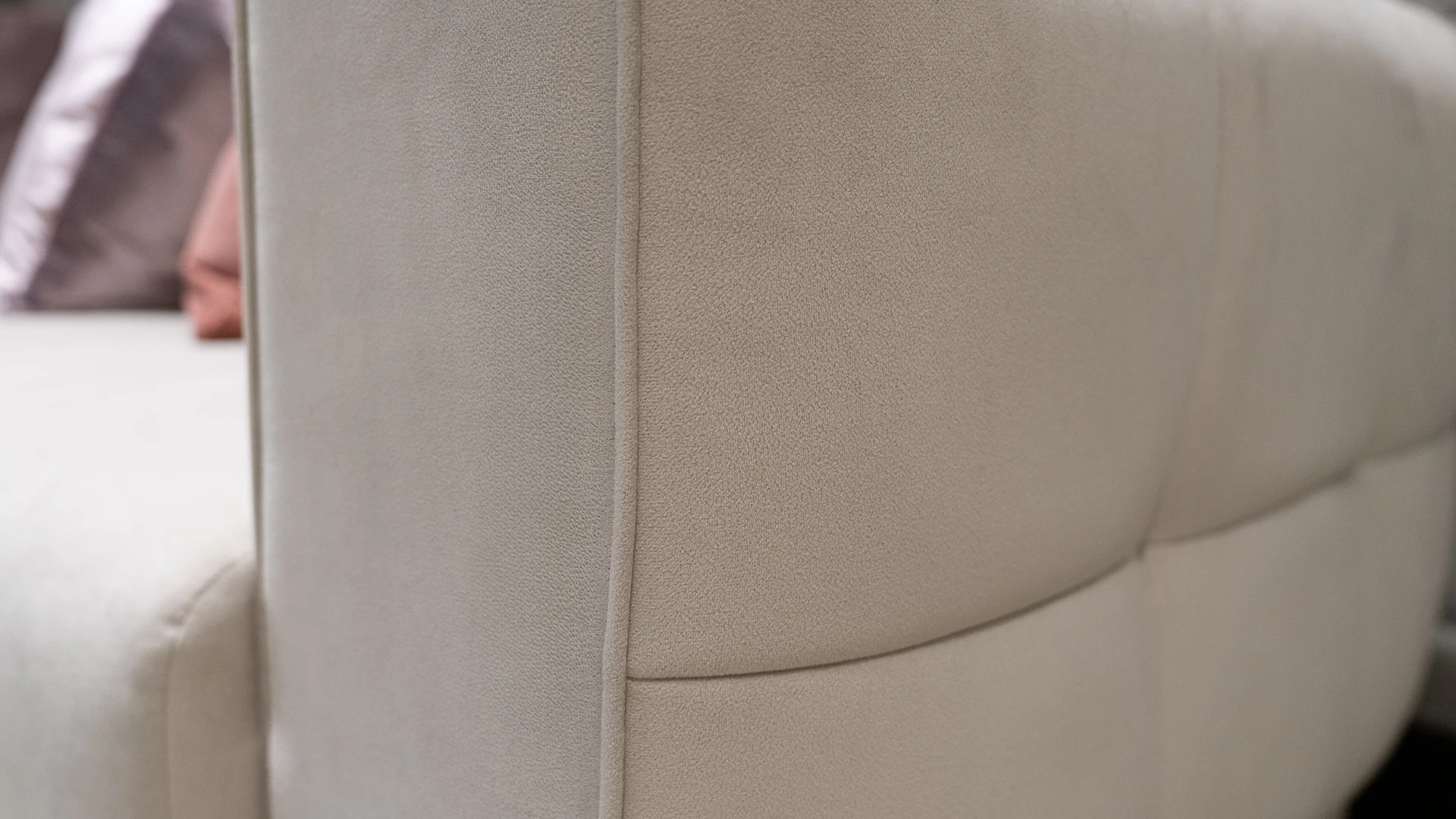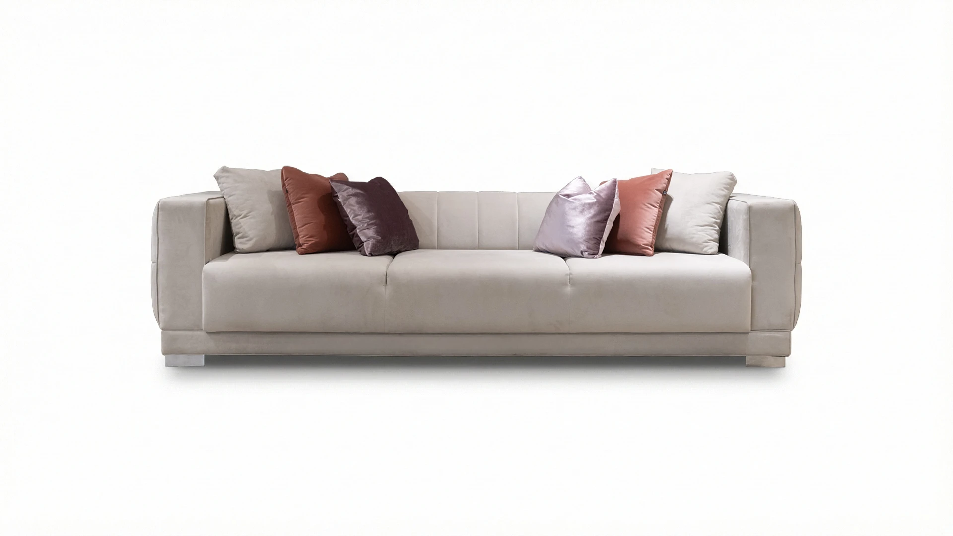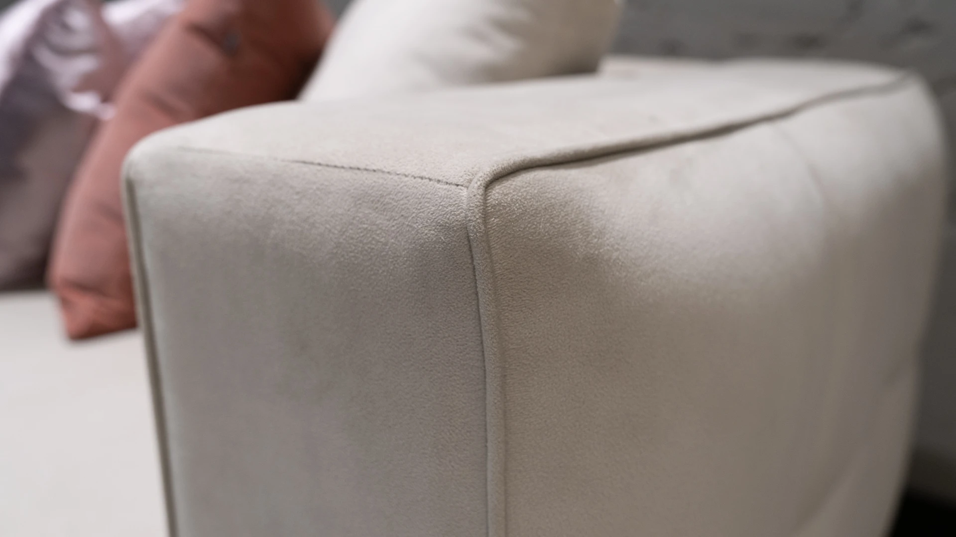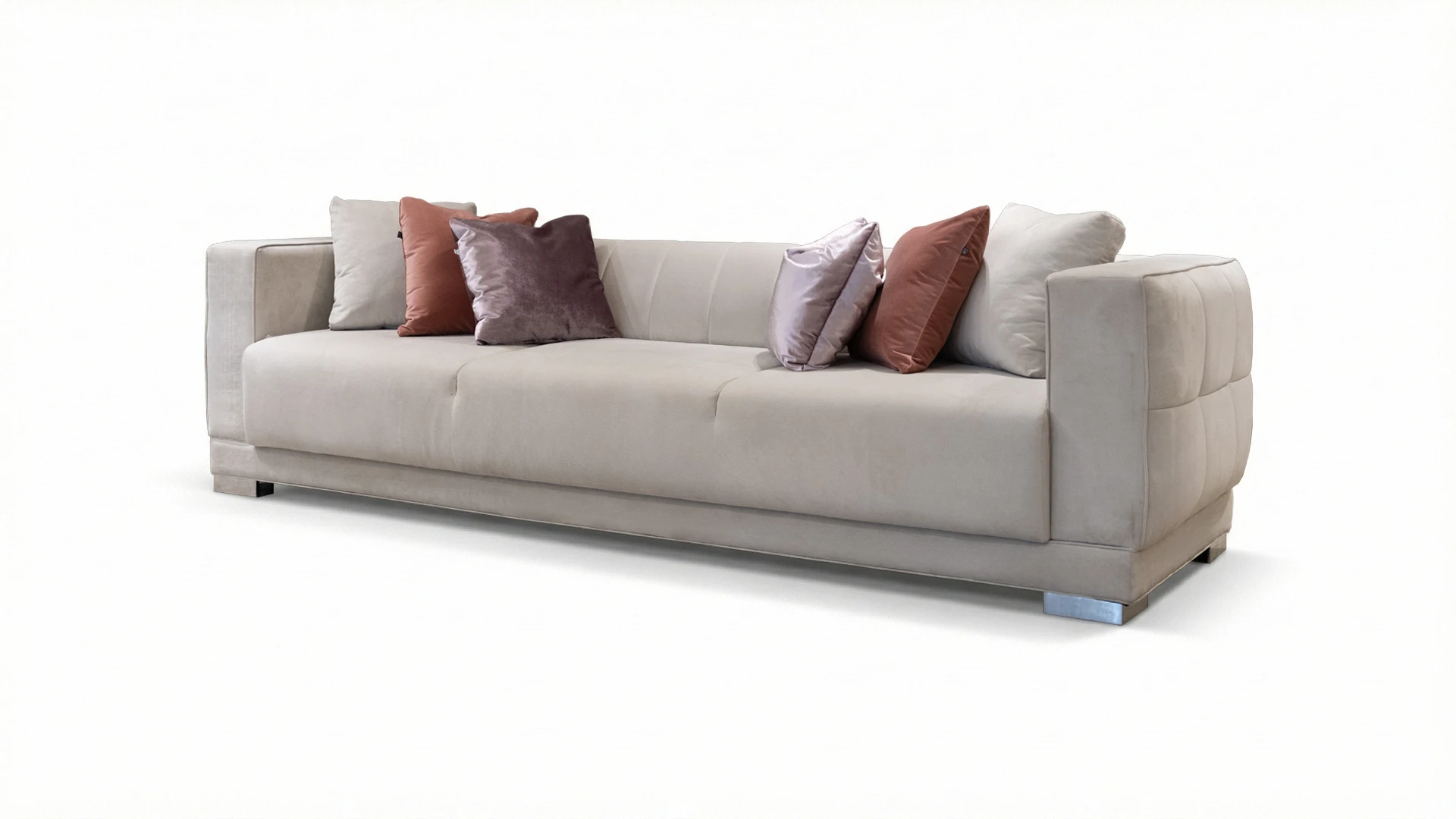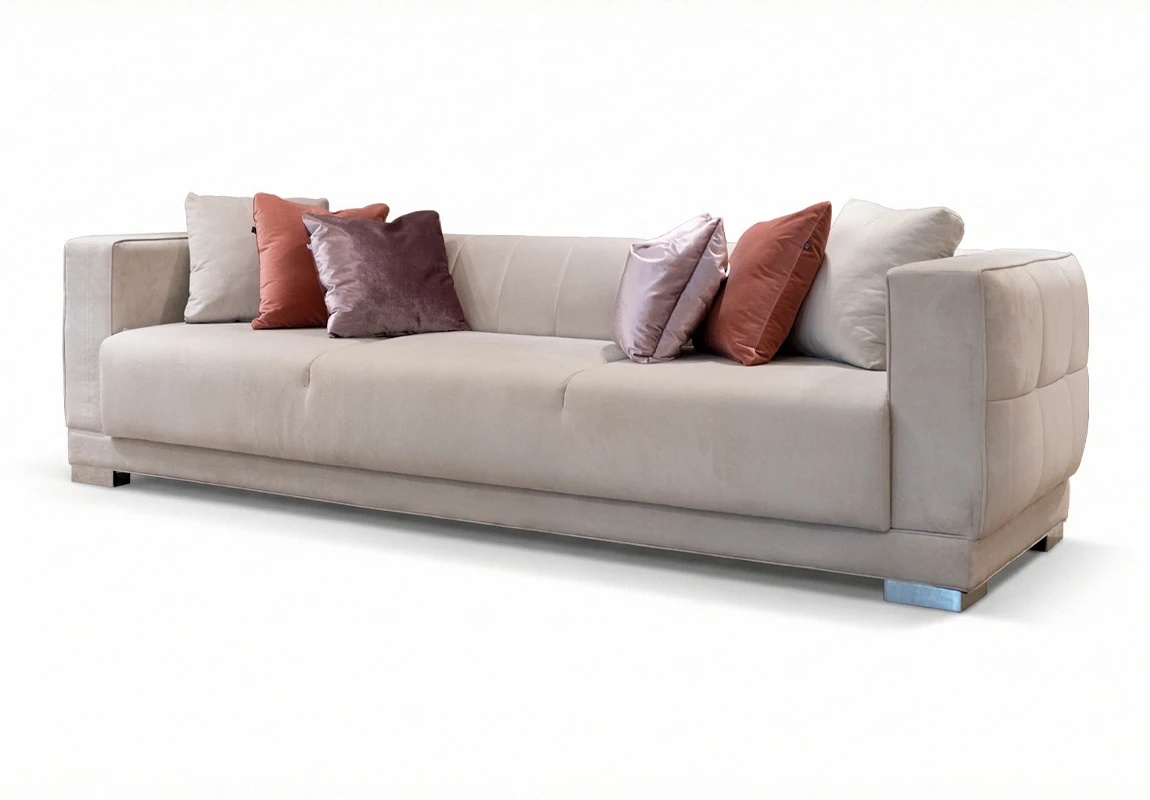 Sofá de líneas contemporáneas con estructura interna de madera maciza reforzada, que garantiza solidez y estabilidad estructural. Presenta respaldo con diseño capitoné, aportando textura y un detalle distintivo de inspiración clásica reinterpretado en clave actual.