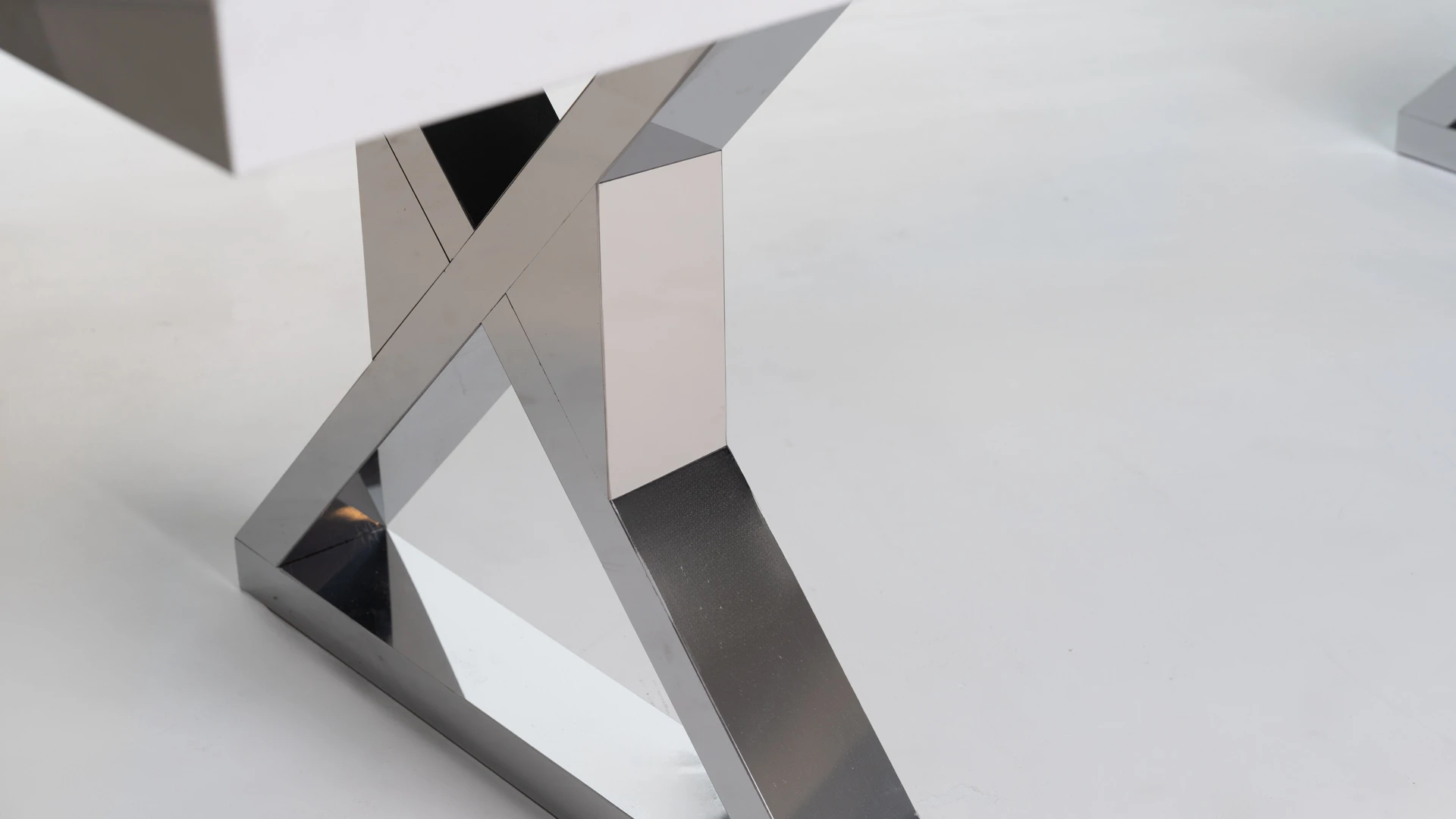 Base metálica con diseño geométrico estructural que aporta estabilidad y carácter visual, con terminación pulida.