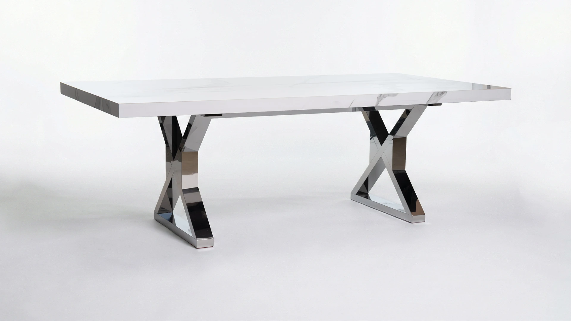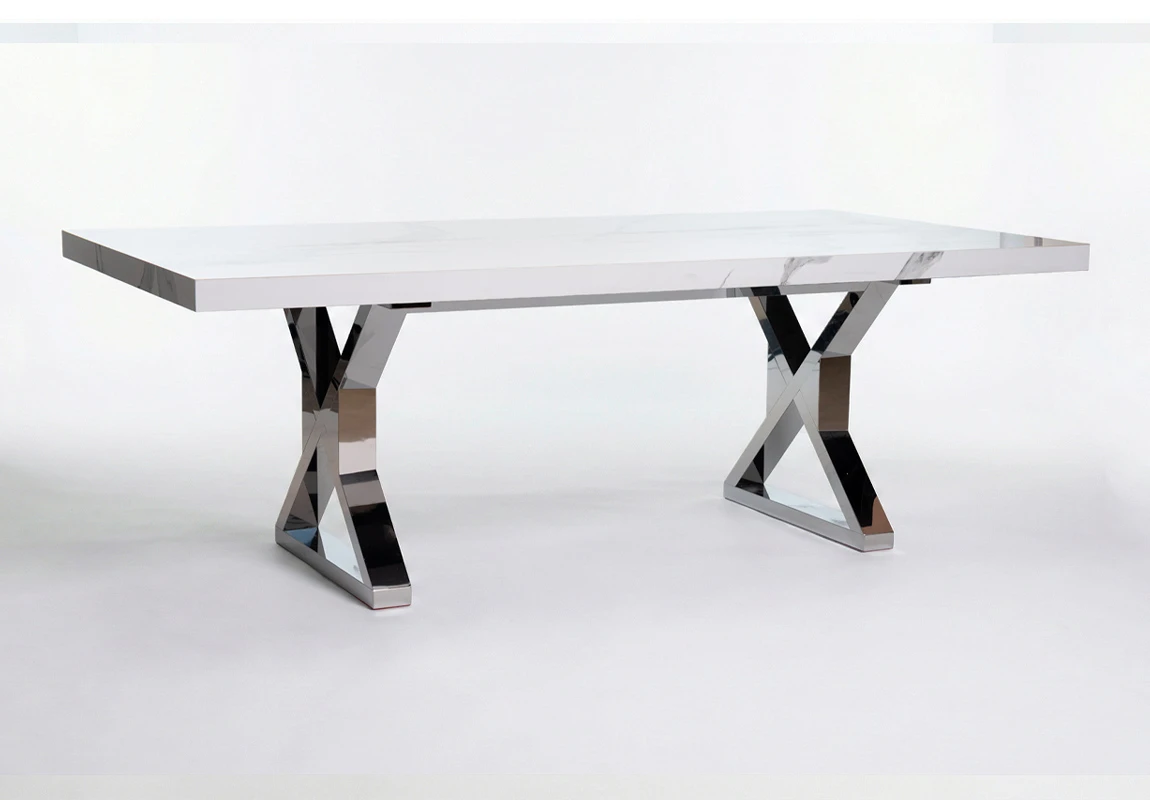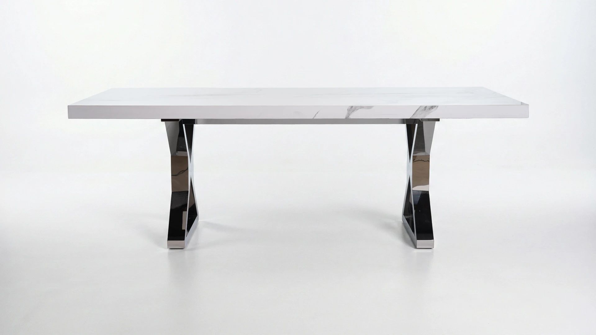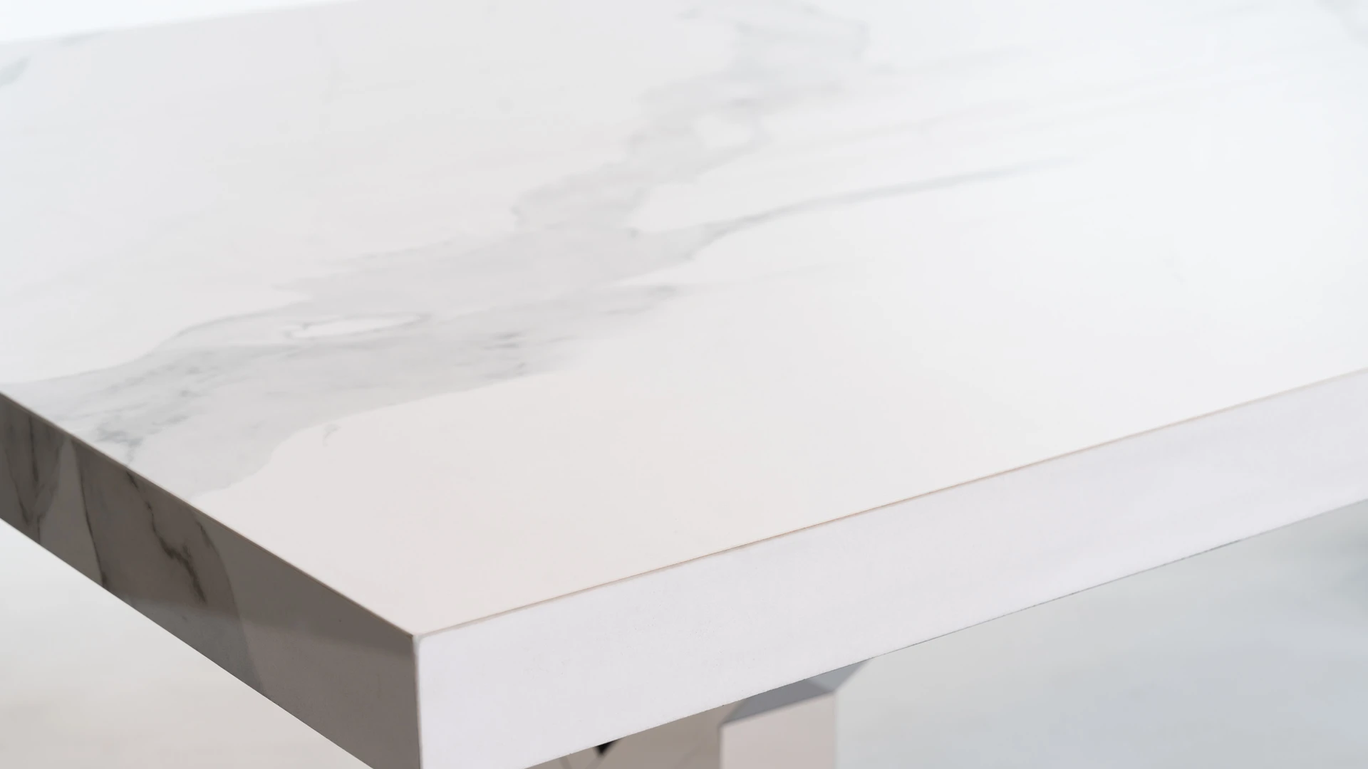 Mesa de comedor de diseño contemporáneo con tapa rectangular en San Pietro, material de alta resistencia con acabado símil mármol y gran durabilidad frente a rayaduras y manchas.