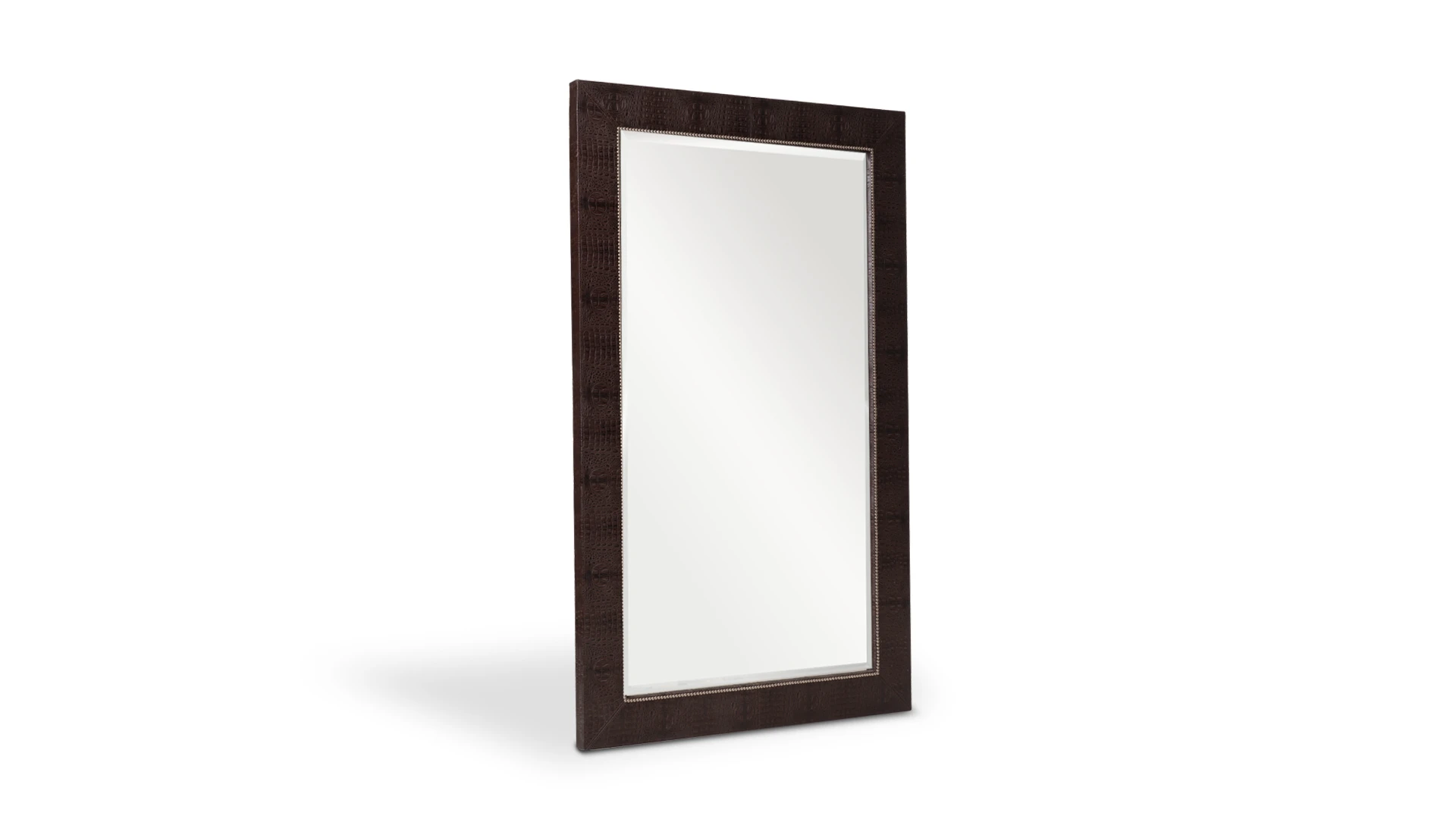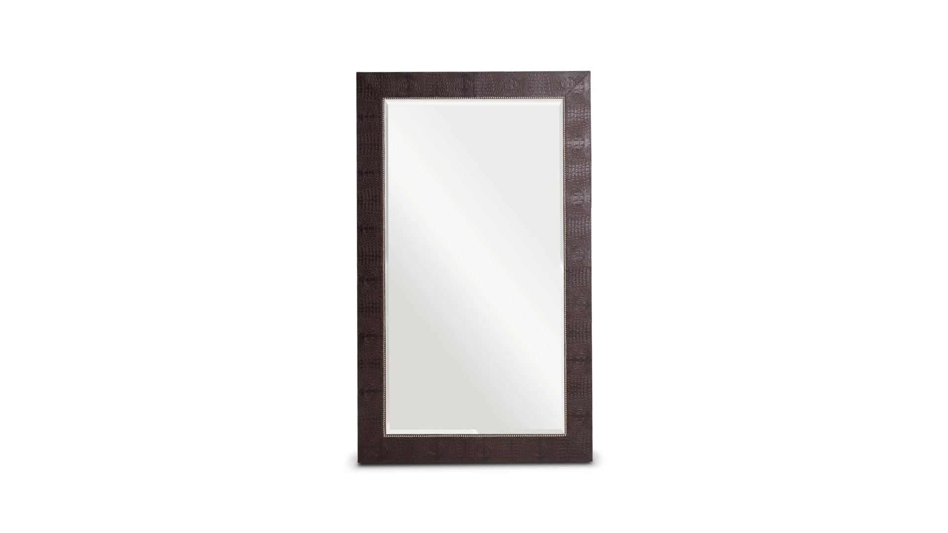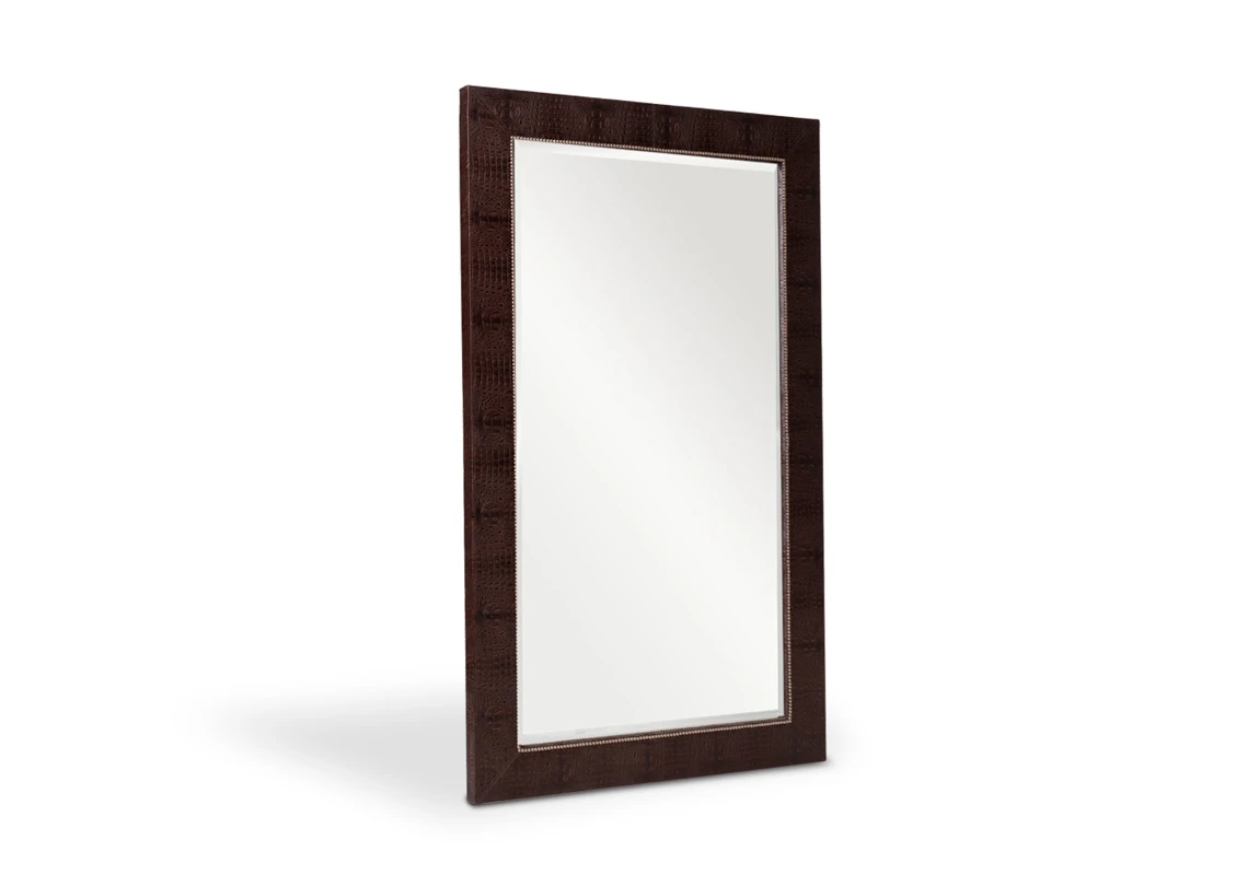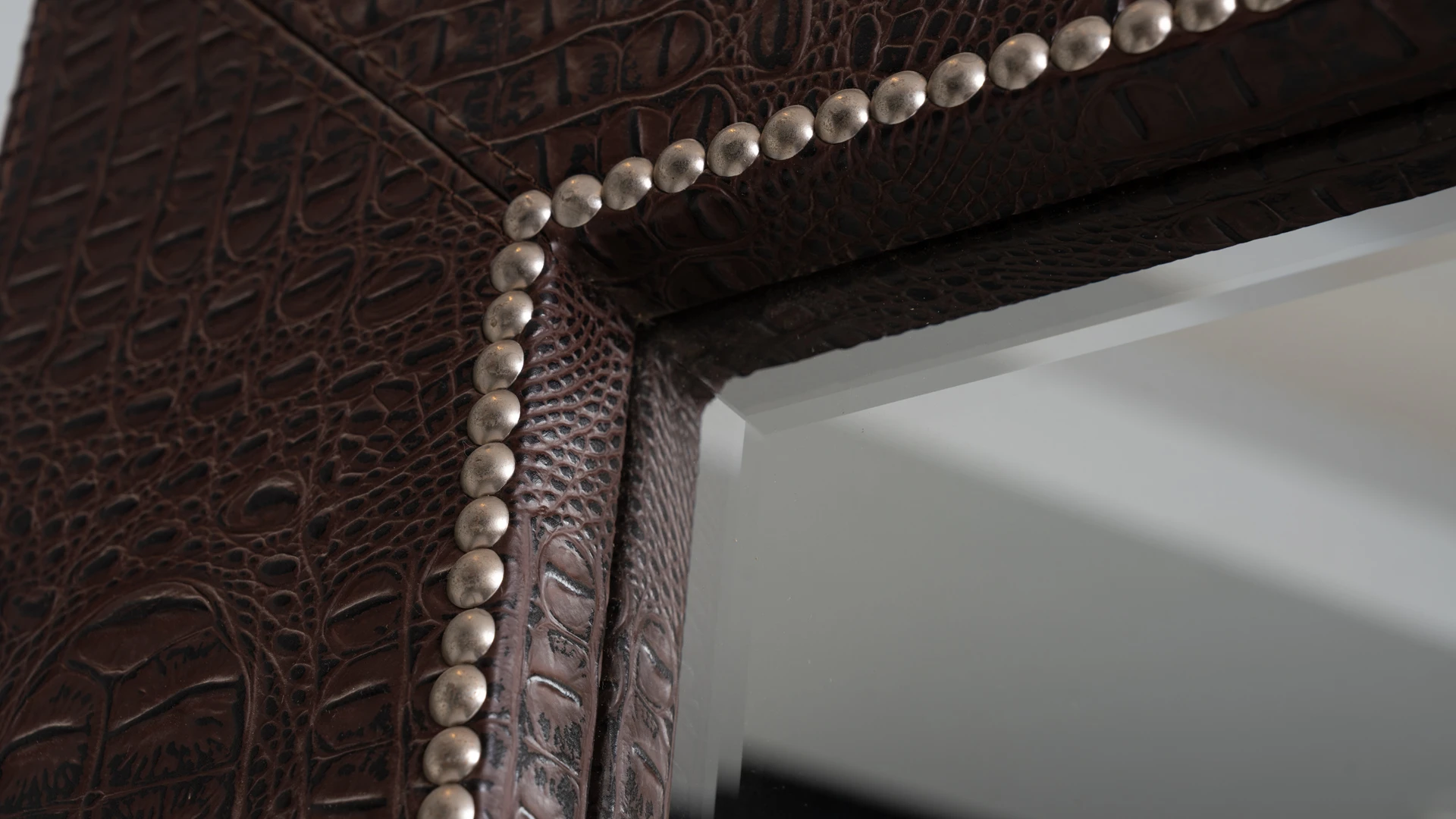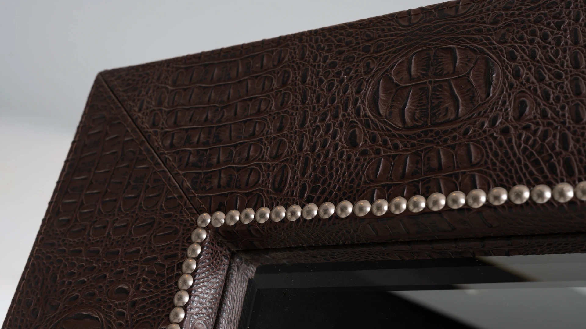 Marco de espejo Minary. Estructura realizada en madera, revestida en cuero crocco marrón, con terminación artesanal. Producto de edición limitada. Consultar stock disponible. Precio final con descuento, incluye IVA. Para customizaciones que requieran un nuevo proceso de fabricación, se realizará una cotización especial.
