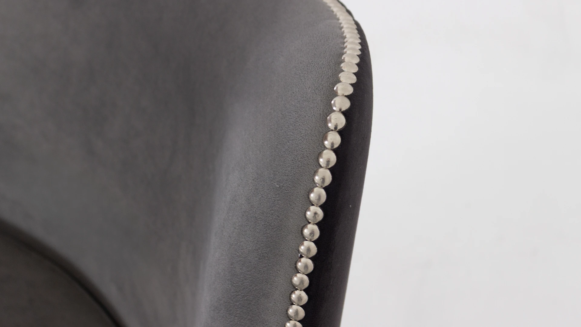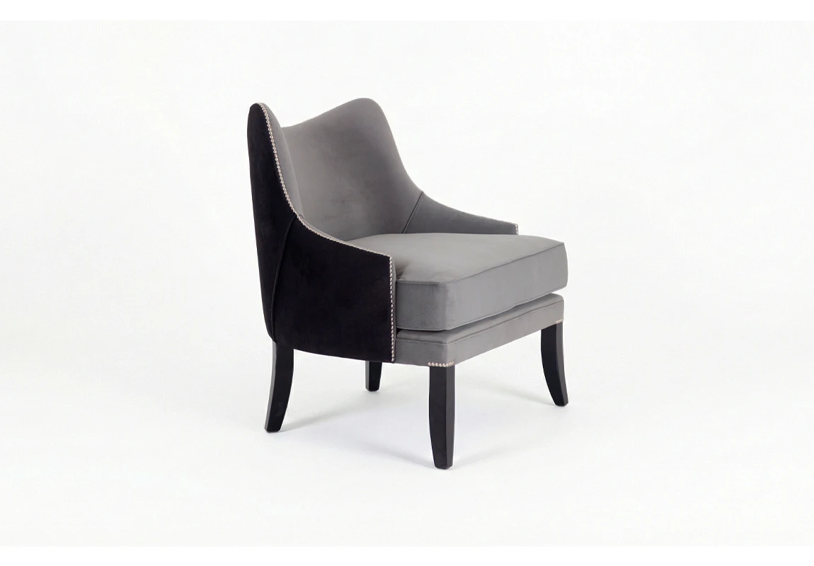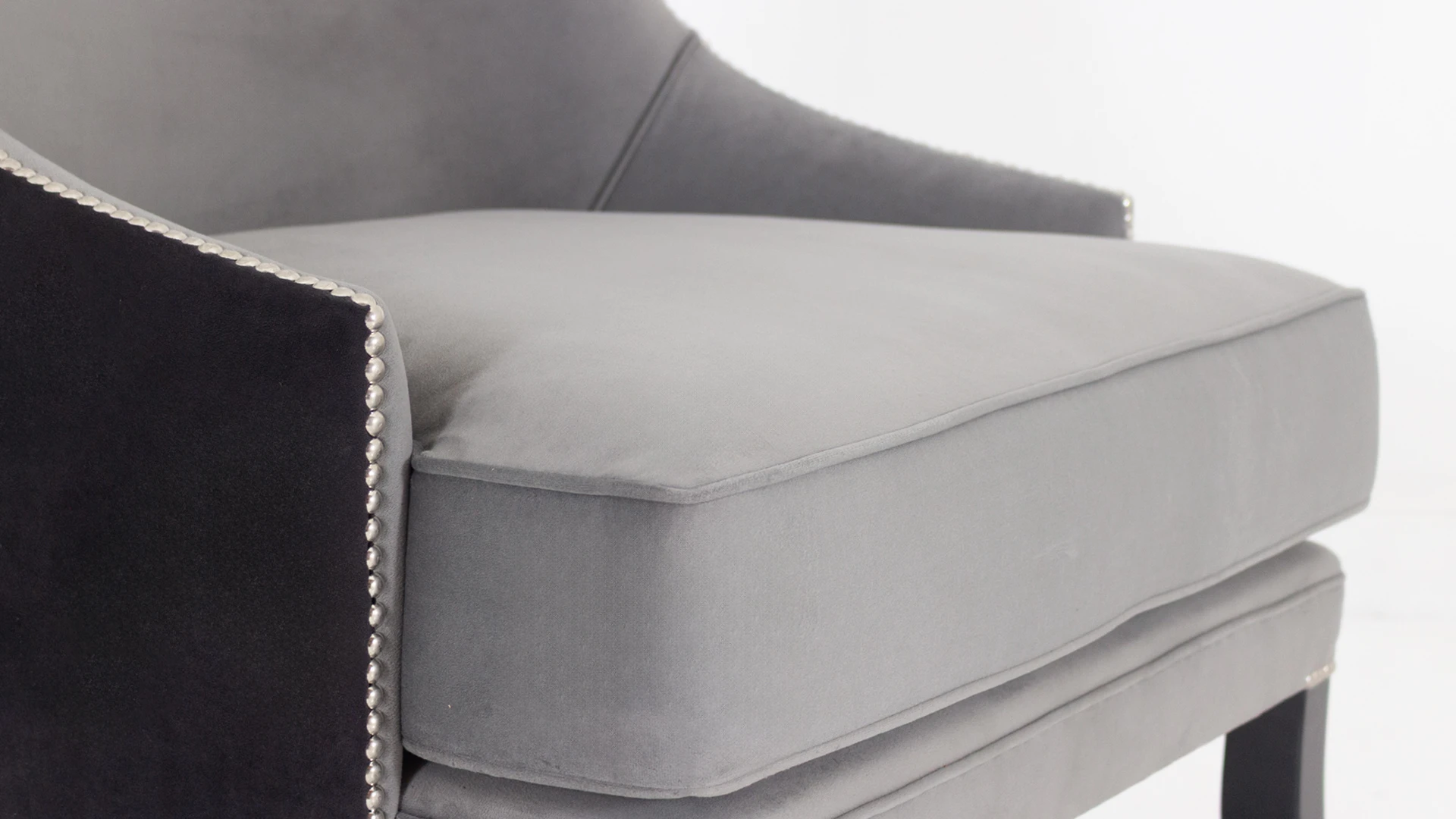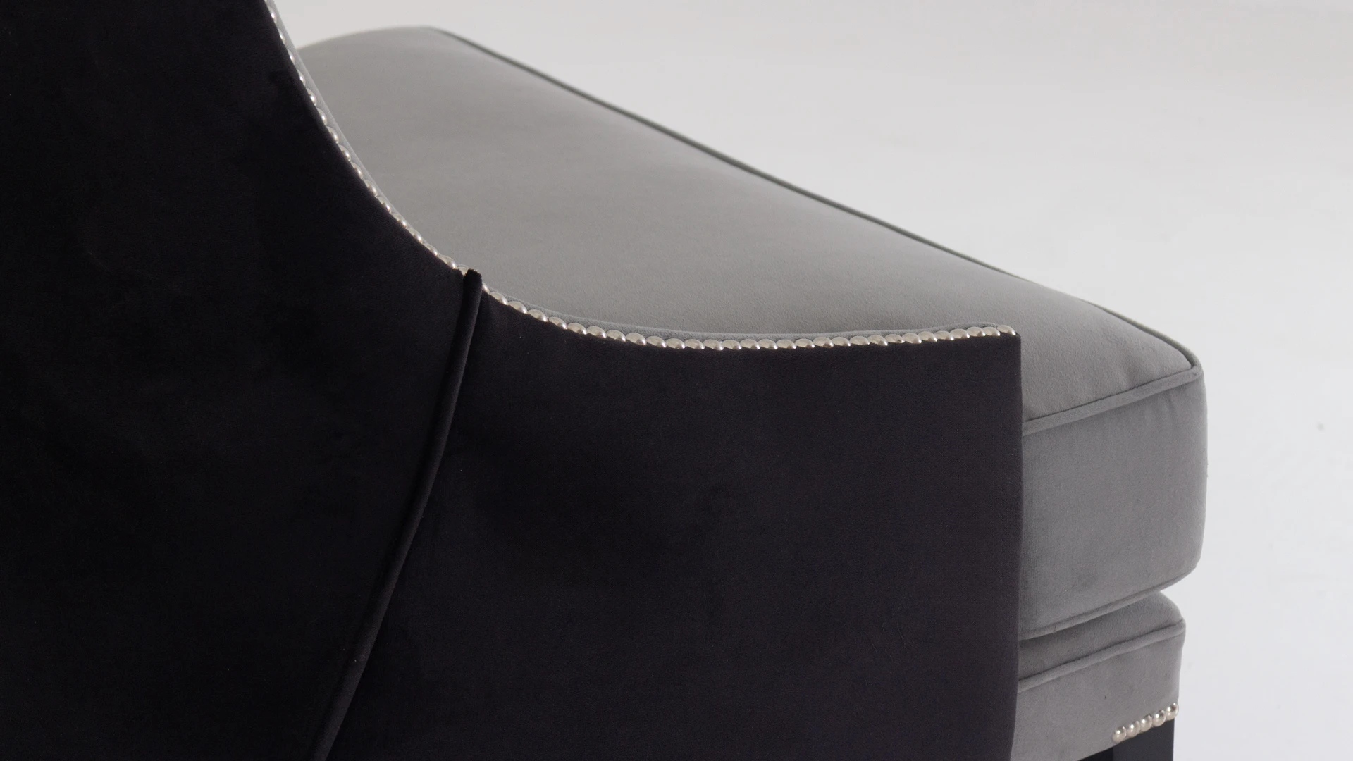 Sillón George. Estructura curva y ergonómica. Fabricado con madera de guindo en color negro semimate y doble tapizado: en el frente pana porsche nickel y atrás pana porsche color negro. Terminado con tachas platil.Producto de edición limitada. Consultar stock disponible. Precio final con descuento, incluye IVA y género. Para customizaciones que requieran un nuevo proceso de fabricación, se realizará una cotización especial