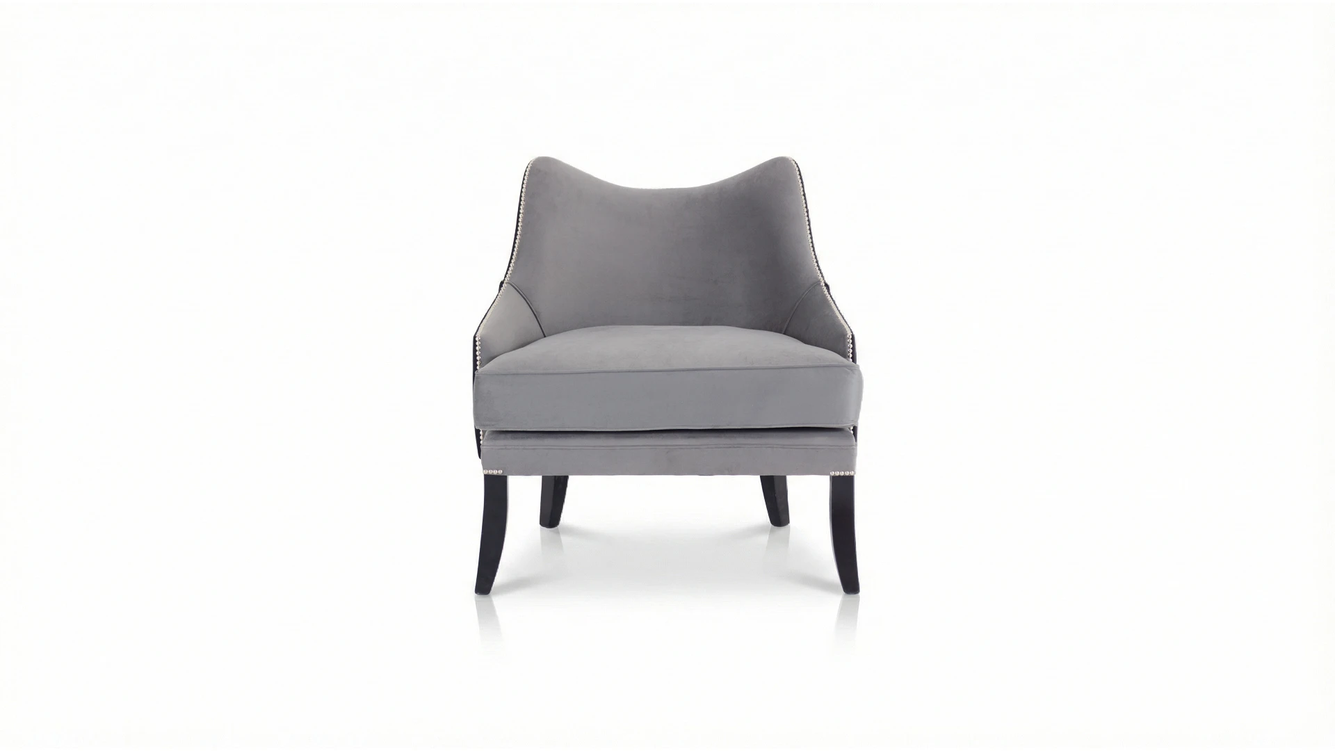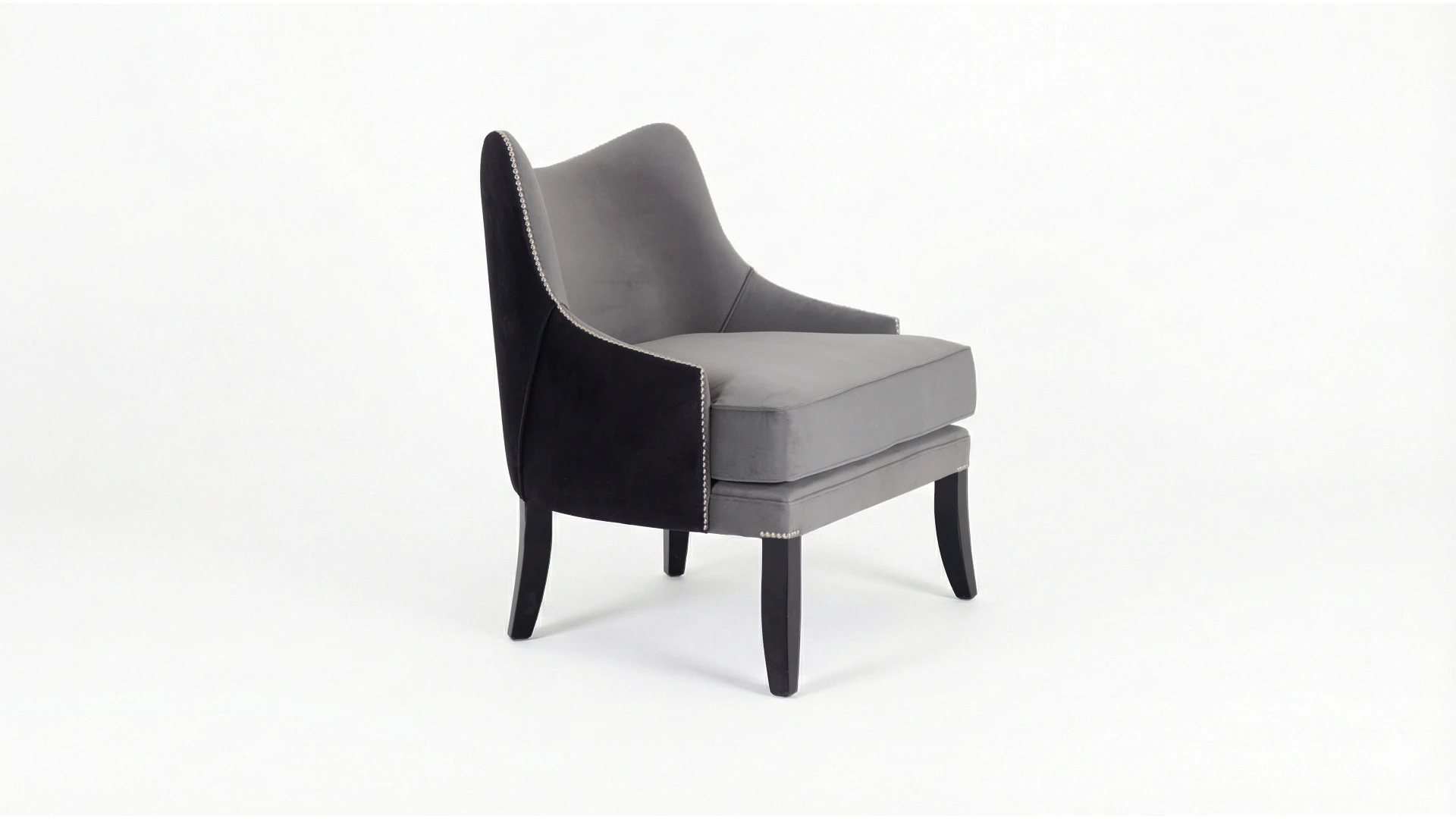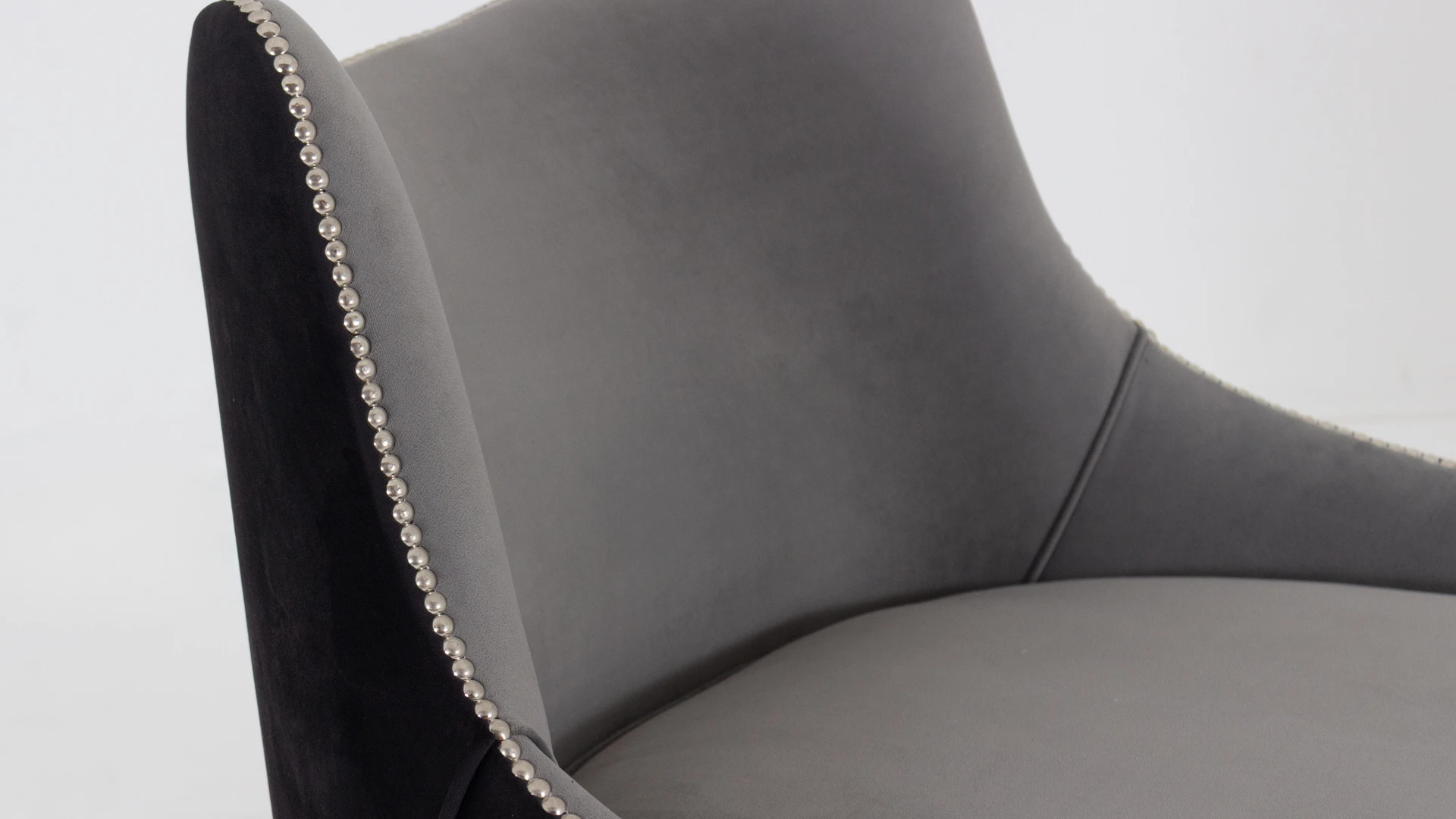 Sillón George. Estructura curva y ergonómica. Fabricado con madera de guindo en color negro semimate y doble tapizado: en el frente pana porsche nickel y atrás pana porsche color negro. Terminado con tachas platil.Producto de edición limitada. Consultar stock disponible. Precio final con descuento, incluye IVA y género. Para customizaciones que requieran un nuevo proceso de fabricación, se realizará una cotización especial
