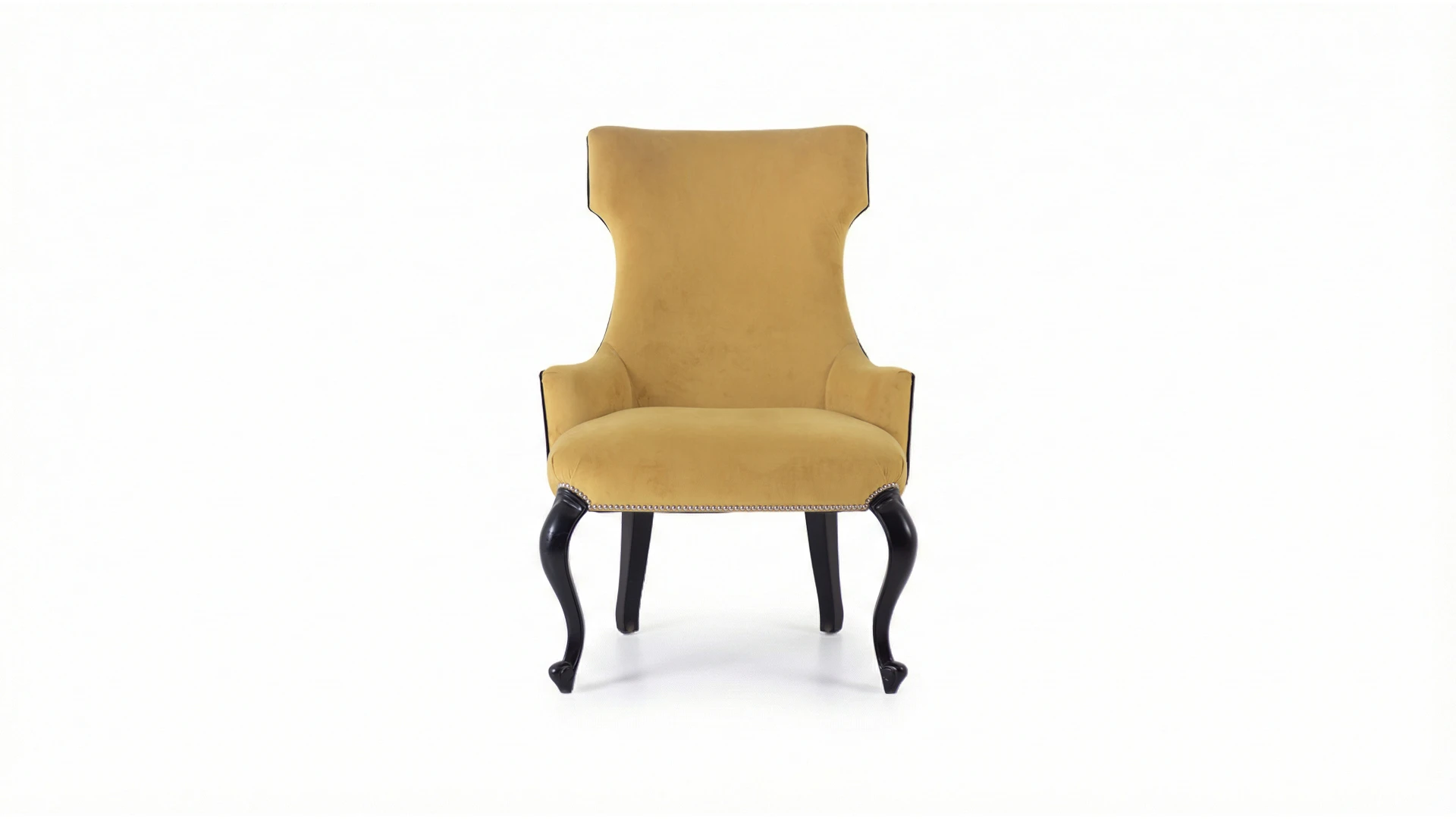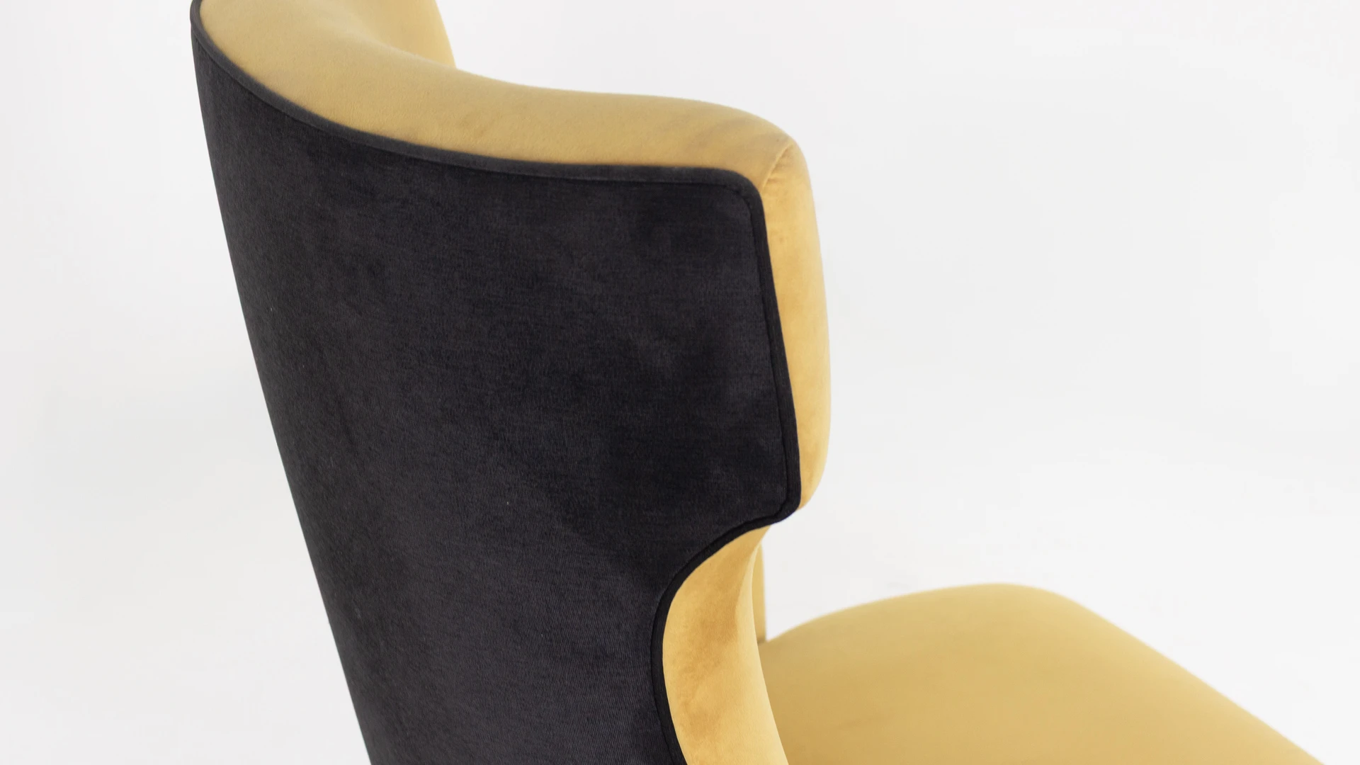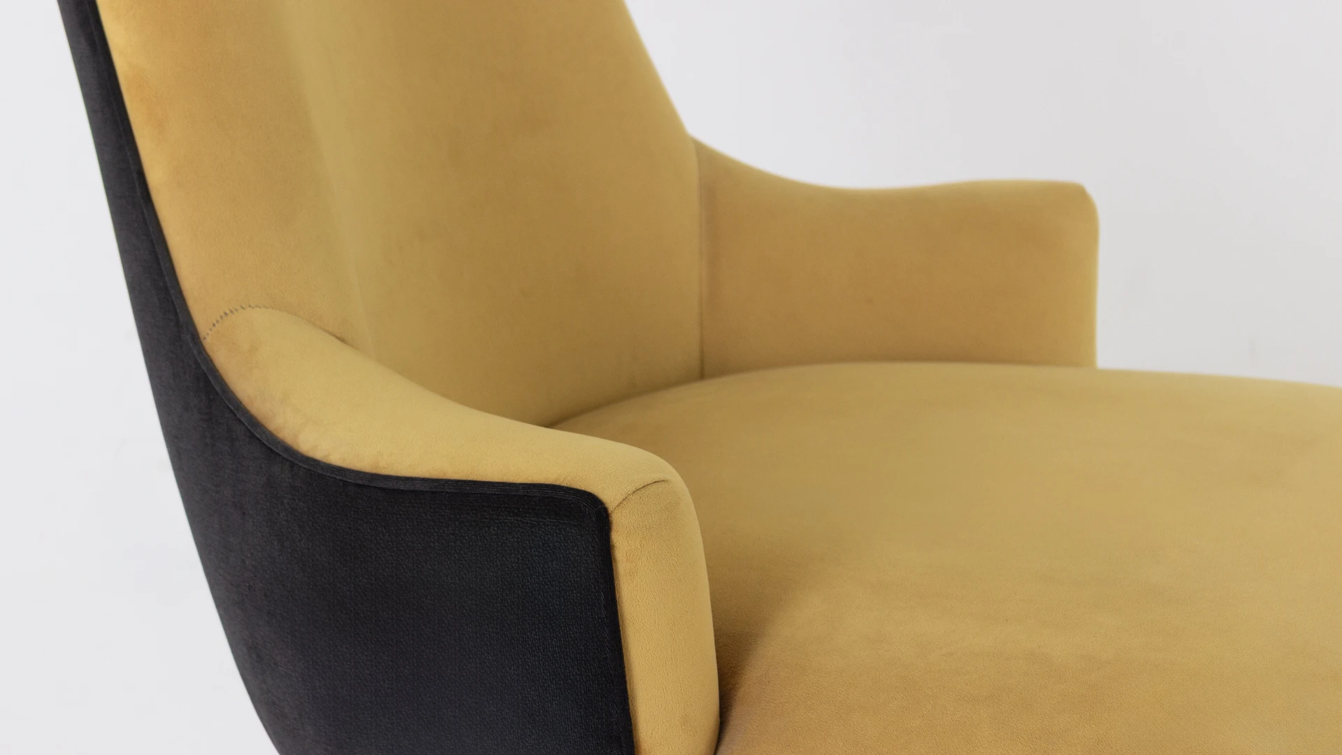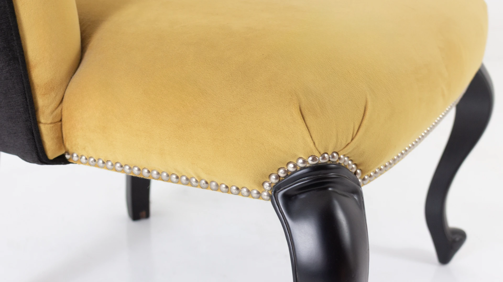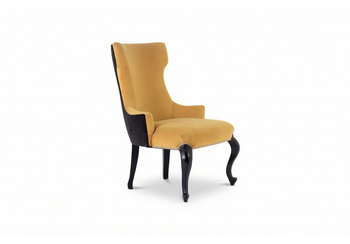 Sillón Dreiss. Estructura de madera, con tapizado combinado: parte delantera en pana mostaza y parte trasera en pana porsche negra. Presenta detalle de tachas metálicas perimetrales y patas de madera con terminación oscura, que refuerzan su estética clásica y elegante. Producto de edición limitada. Consultar stock disponible. Precio final con descuento, incluye IVA y género. Para customizaciones que requieran un nuevo proceso de fabricación, se realizará una cotización especial.