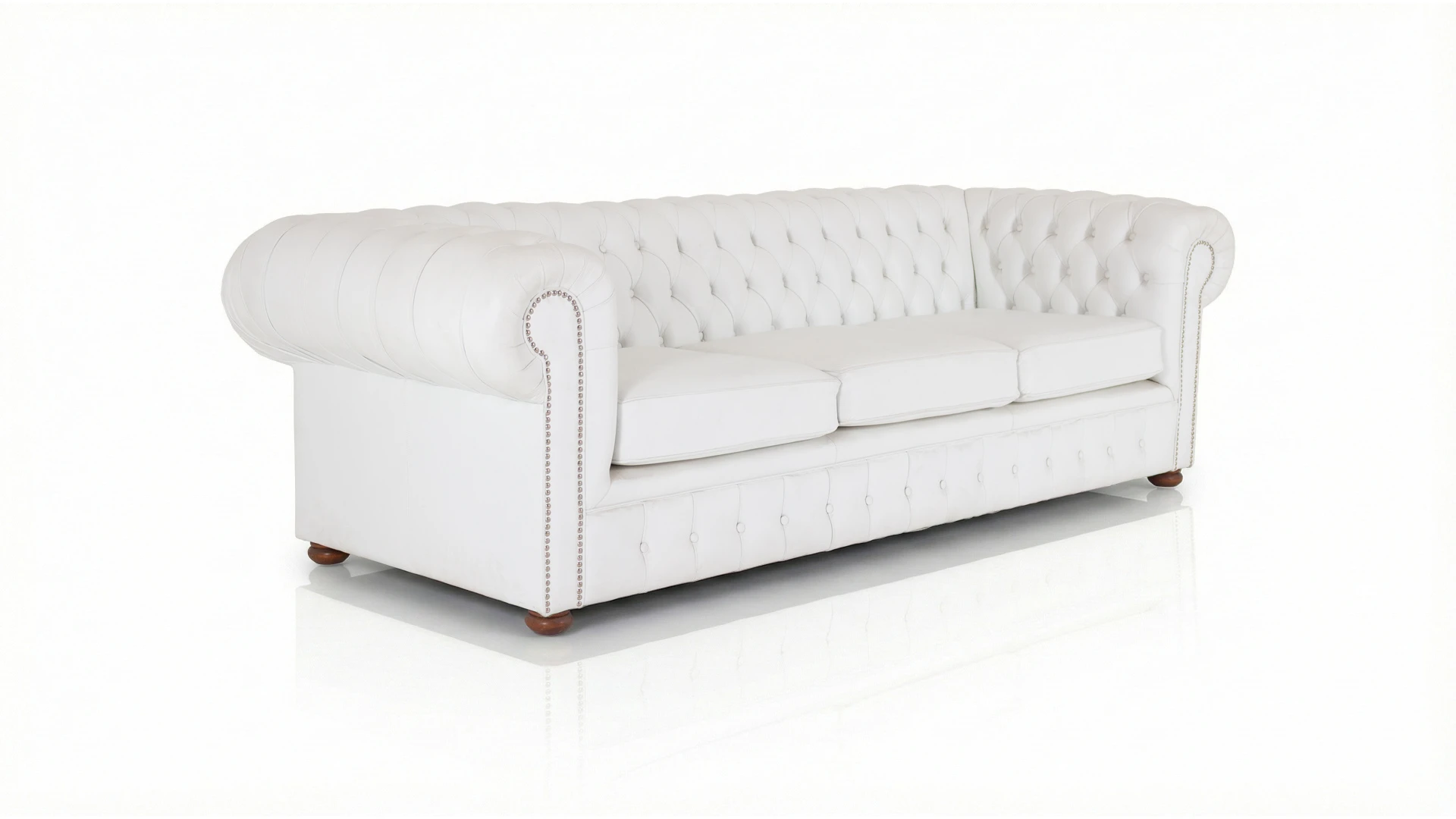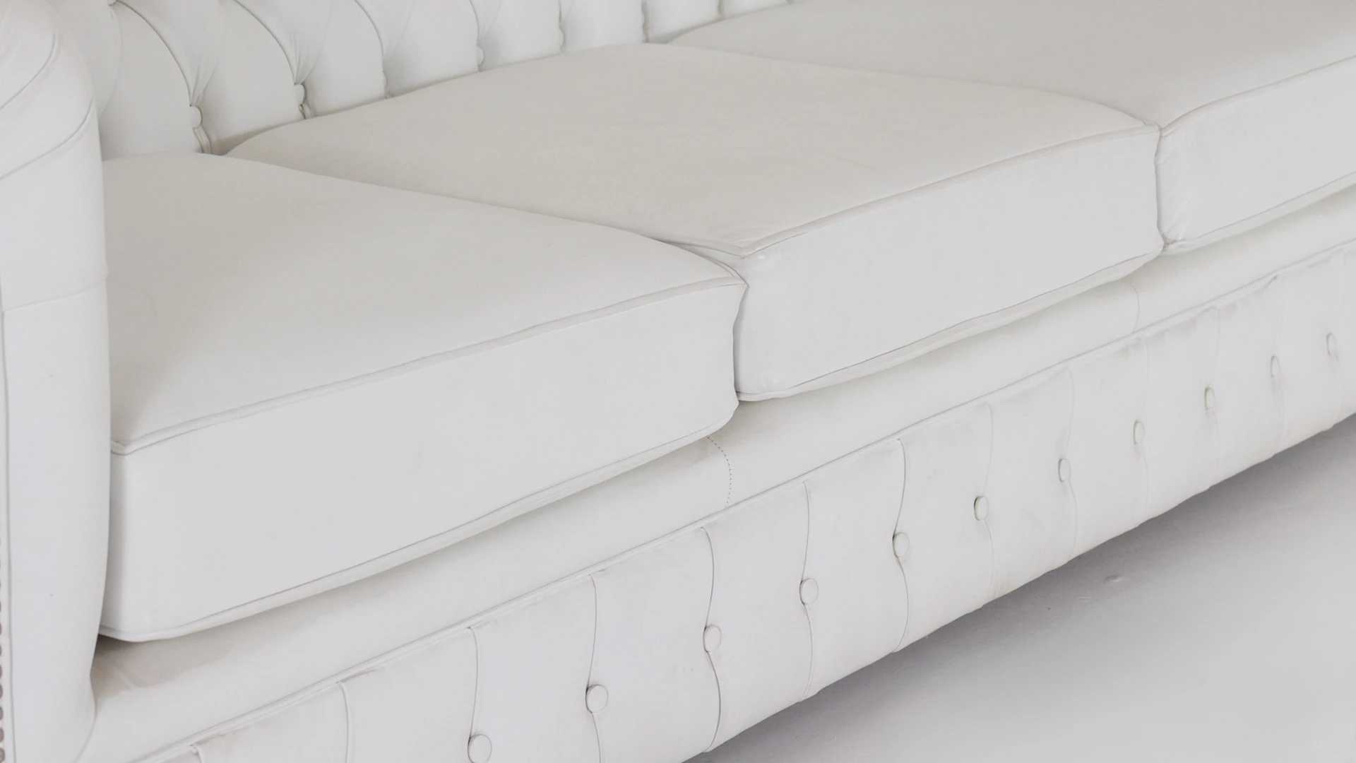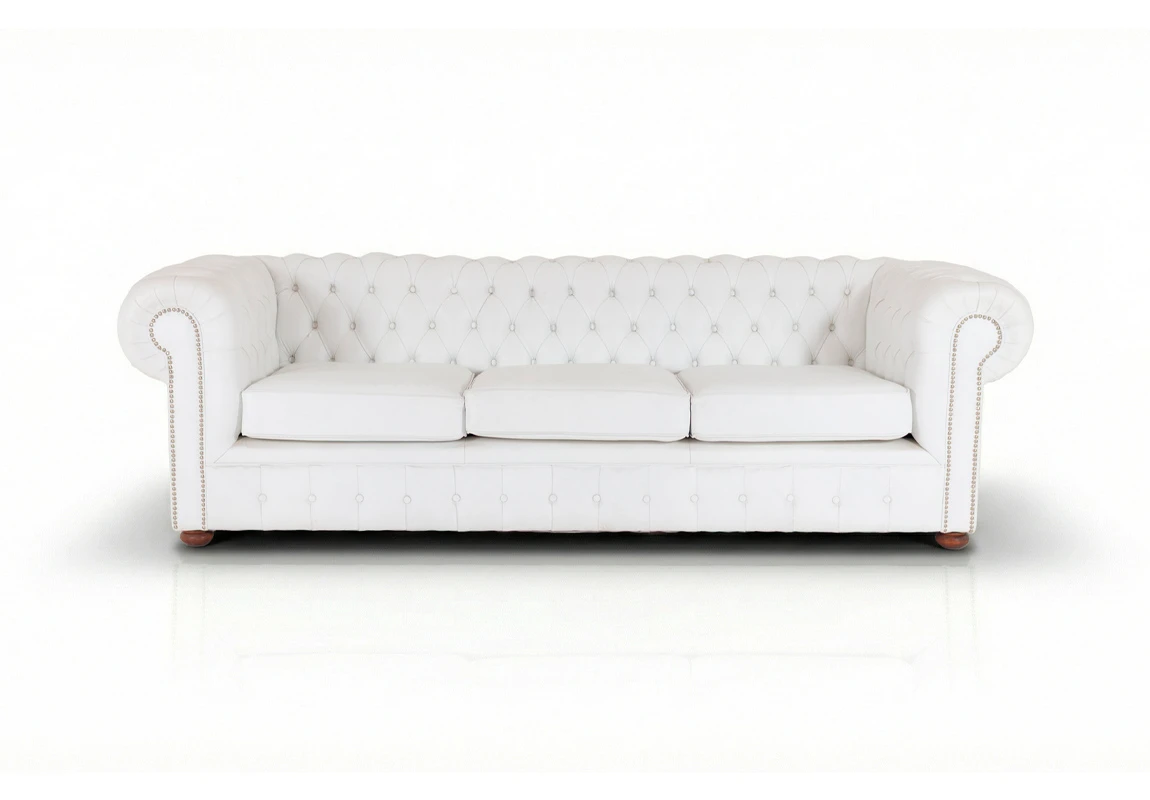 Sofá Chester Noruega. Estilo clásico tapizado en cuero blanco, con respaldo y brazos capitoné que aportan textura y carácter. Su estructura sólida y almohadones amplios garantizan confort y durabilidad. Las tachas metálicas y patas de madera completan un diseño equilibrado y funcional. Producto de edición limitada. Consultar stock disponible. Precio final con descuento, incluye IVA y género. Para customizaciones que requieran un nuevo proceso de fabricación, se realizará una cotización especial
