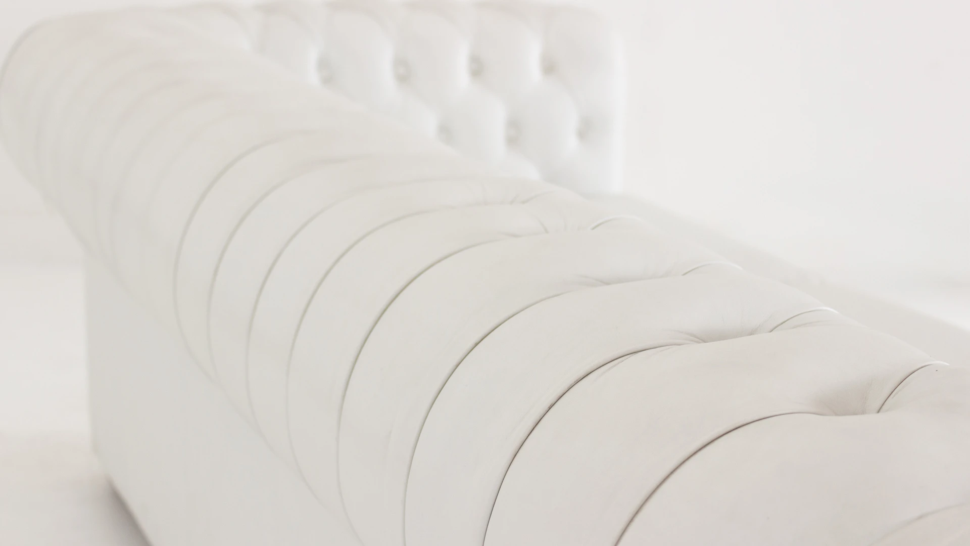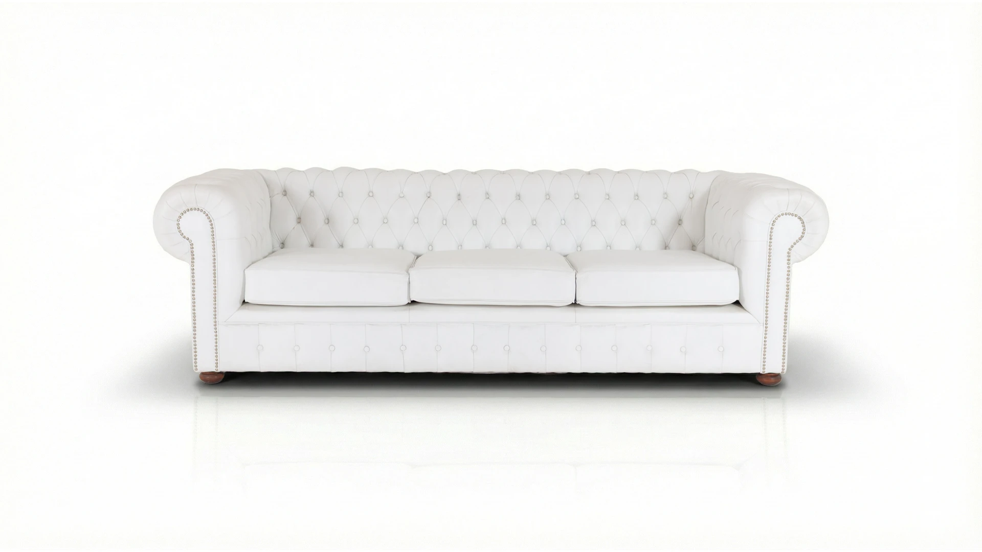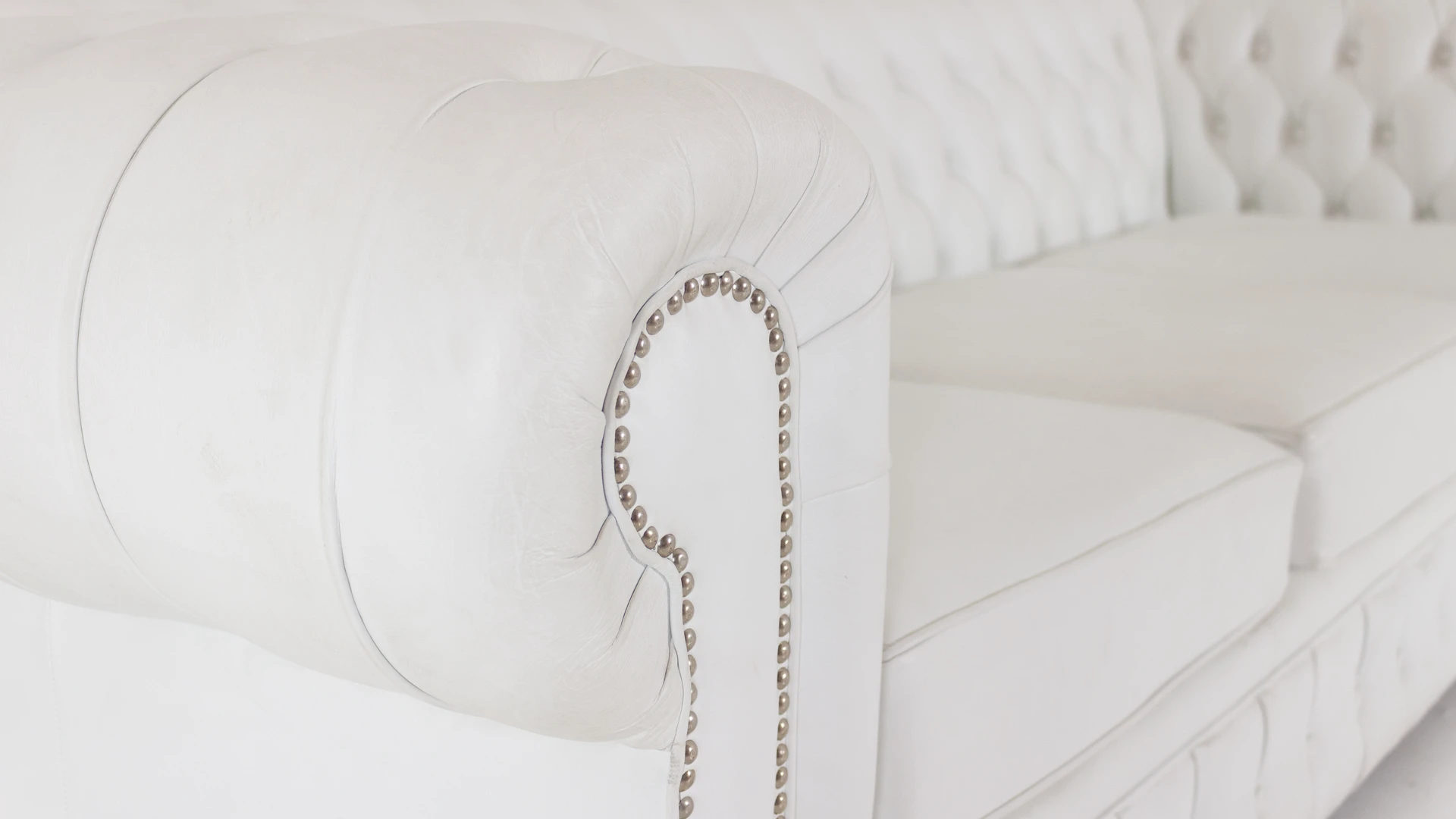 Sofá Chester Noruega. Estilo clásico tapizado en cuero blanco, con respaldo y brazos capitoné que aportan textura y carácter. Su estructura sólida y almohadones amplios garantizan confort y durabilidad. Las tachas metálicas y patas de madera completan un diseño equilibrado y funcional. Producto de edición limitada. Consultar stock disponible. Precio final con descuento, incluye IVA y género. Para customizaciones que requieran un nuevo proceso de fabricación, se realizará una cotización especial