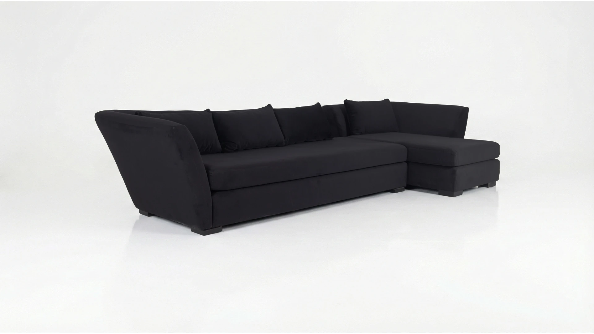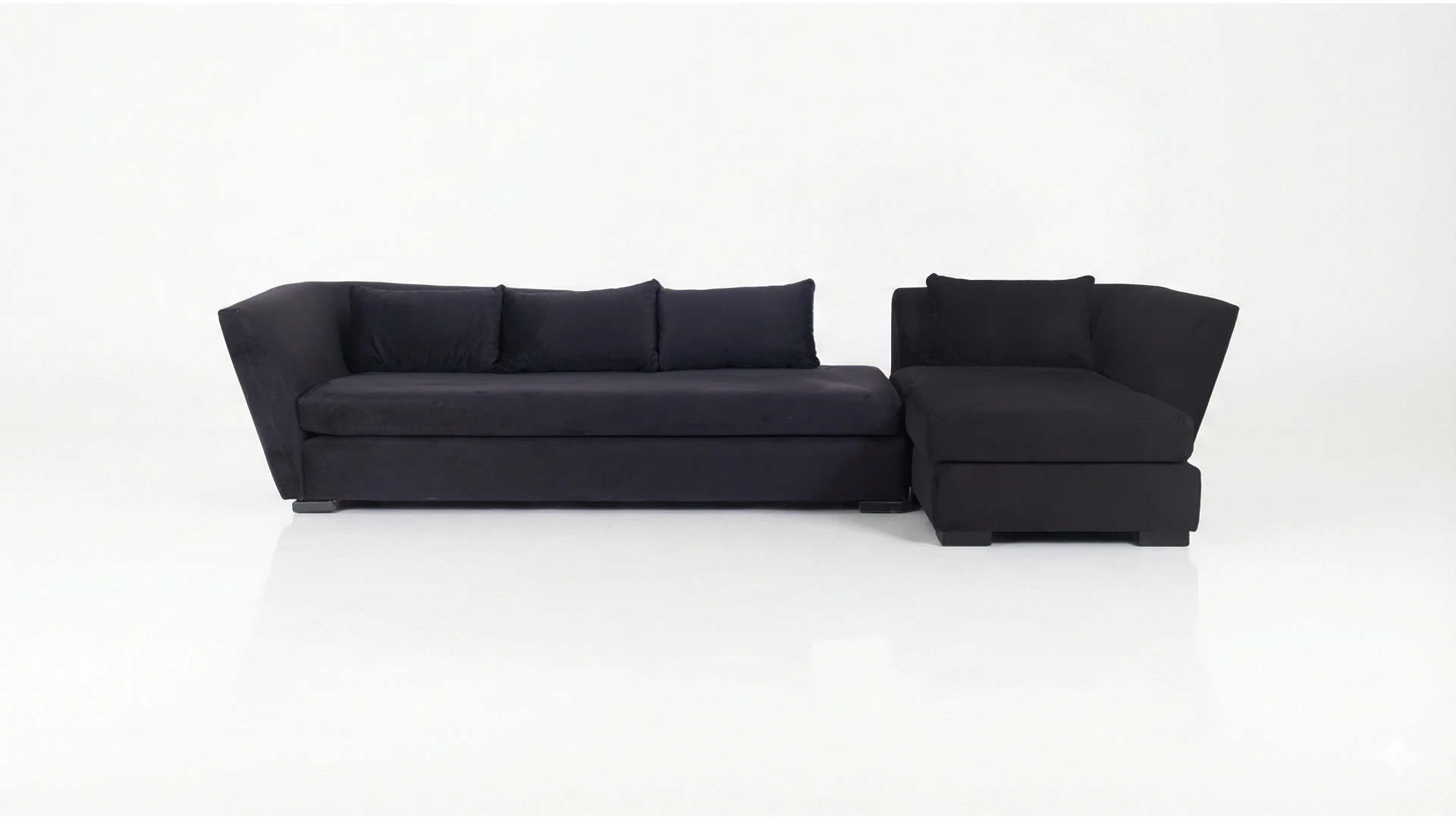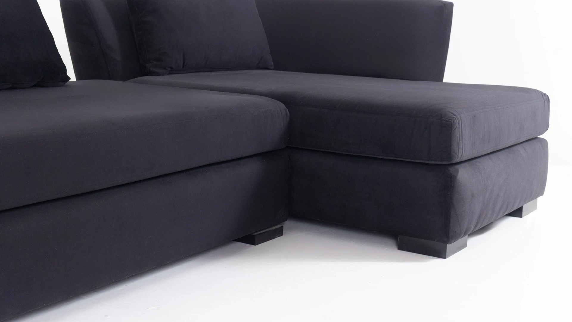 Sofá esquinero Wave, elegante y moderno. Diseñado con estructura interna de madera maciza reforzada, que garantiza solidez y estabilidad estructural. Tapizado íntegramente en tela pana porsche negra, de tacto suave y acabado uniforme, que aporta calidez visual y confort. Base inferior integrada con apoyos metálicos de terminación moderna. Producto de edición limitada. Consultar stock disponible. Precio final con descuento, incluye IVA y género. Para customizaciones que requieran un nuevo proceso de fabricación, se realizará una cotización especial.