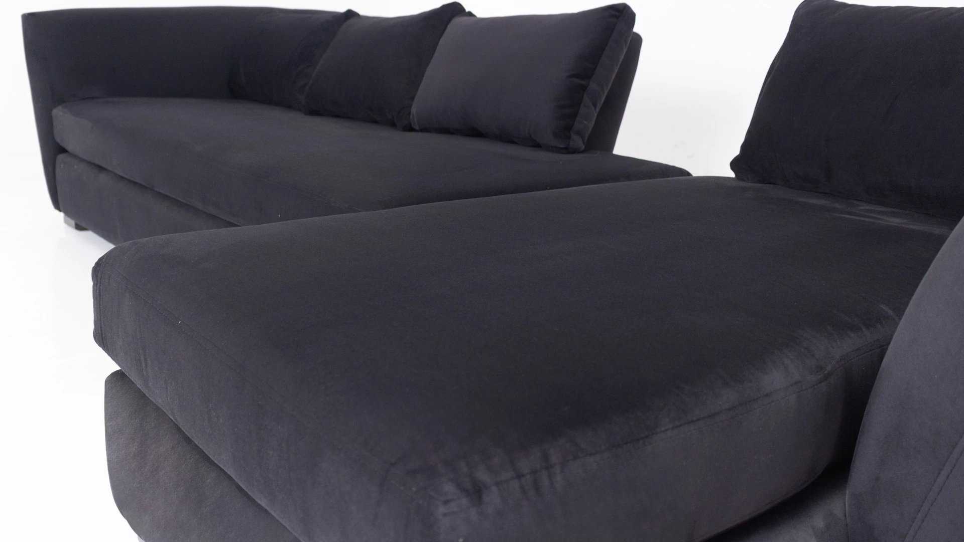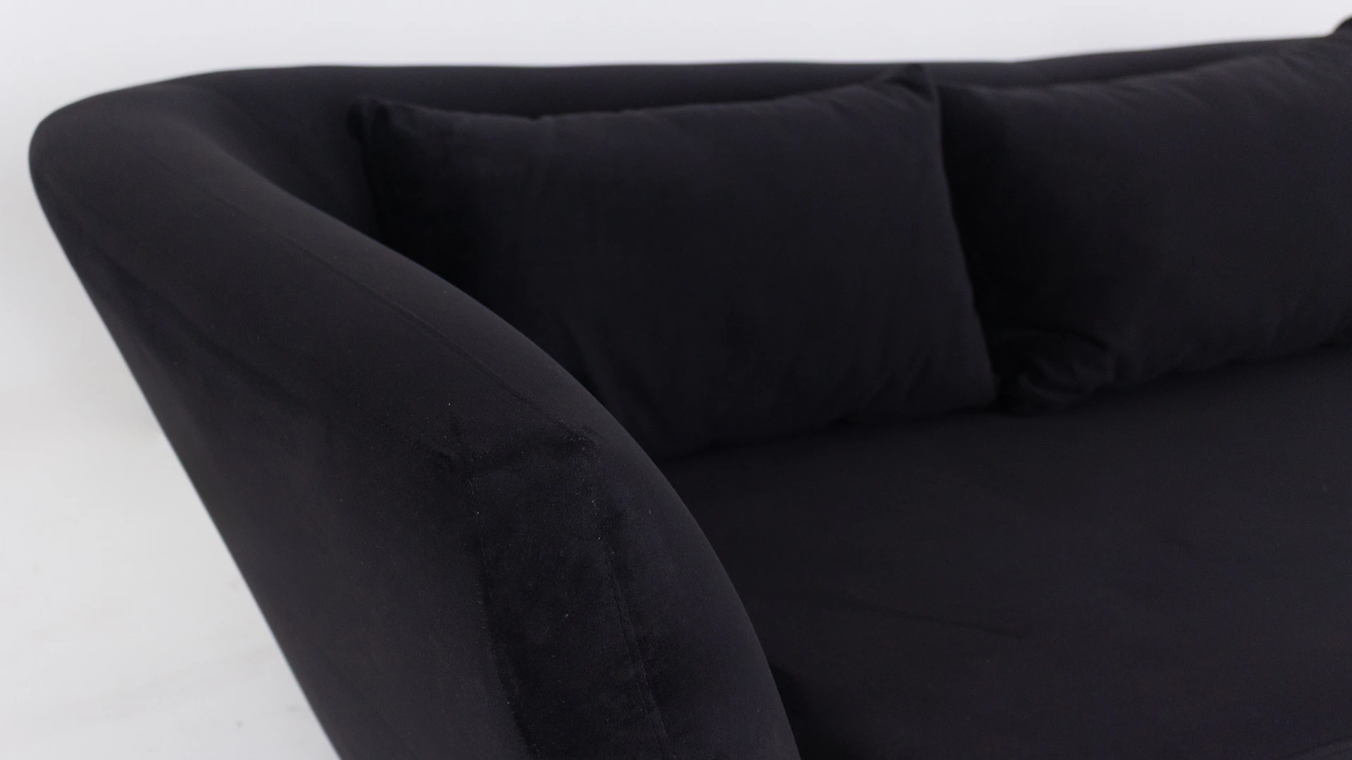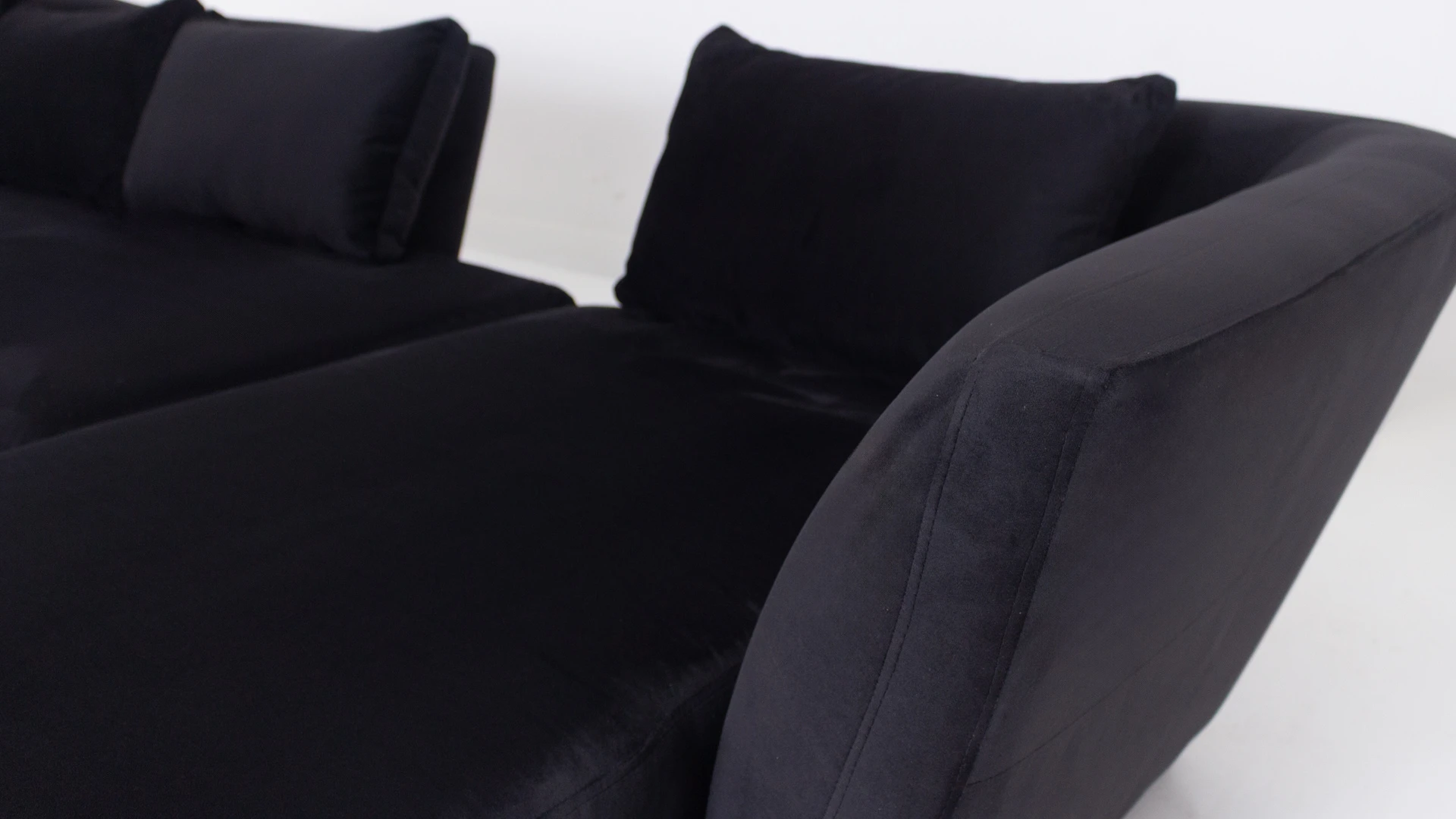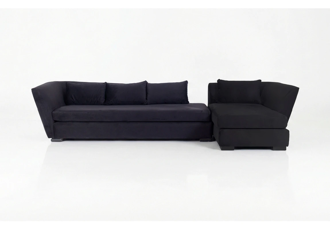 Sofá esquinero Wave, elegante y moderno. Diseñado con estructura interna de madera maciza reforzada, que garantiza solidez y estabilidad estructural. Tapizado íntegramente en tela pana porsche negra, de tacto suave y acabado uniforme, que aporta calidez visual y confort. Base inferior integrada con apoyos metálicos de terminación moderna. Producto de edición limitada. Consultar stock disponible. Precio final con descuento, incluye IVA y género. Para customizaciones que requieran un nuevo proceso de fabricación, se realizará una cotización especial.