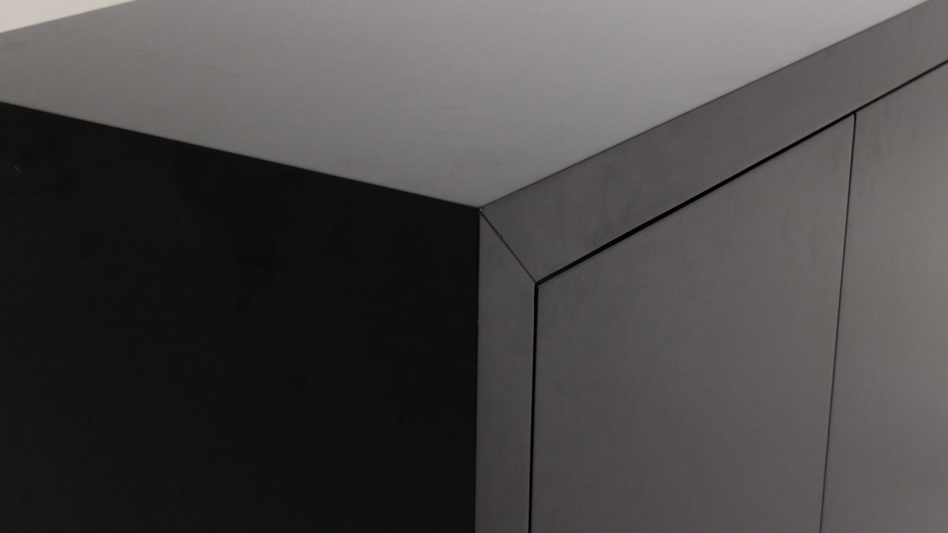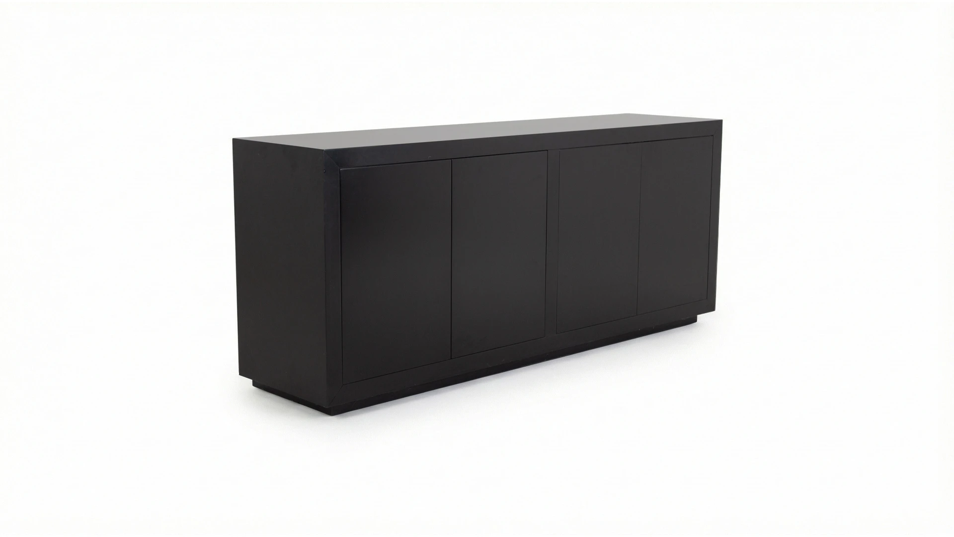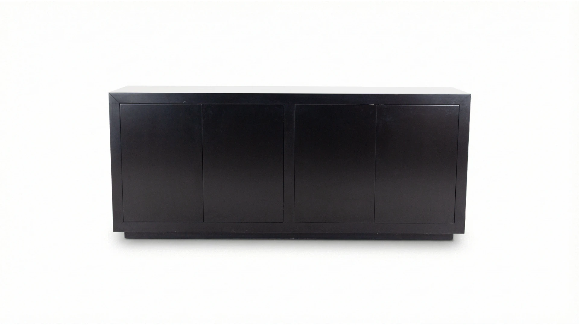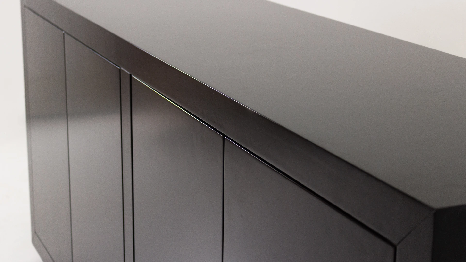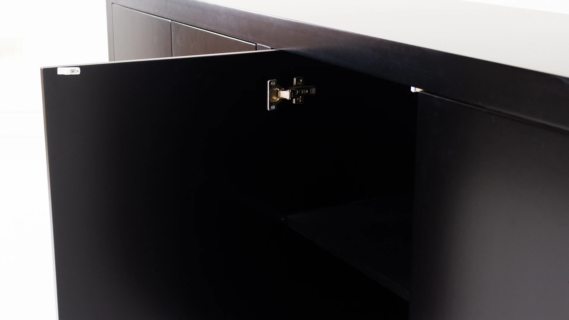 Aparador Dunia. Realizado en madera, con terminación en pintura poliuretánica negra semimate. Presenta cuatro puertas frontales para guardado interno. Producto de edición limitada. Consultar stock disponible. Precio final con descuento, incluye IVA. Para customizaciones que requieran un nuevo proceso de fabricación, se realizará una cotización especial.